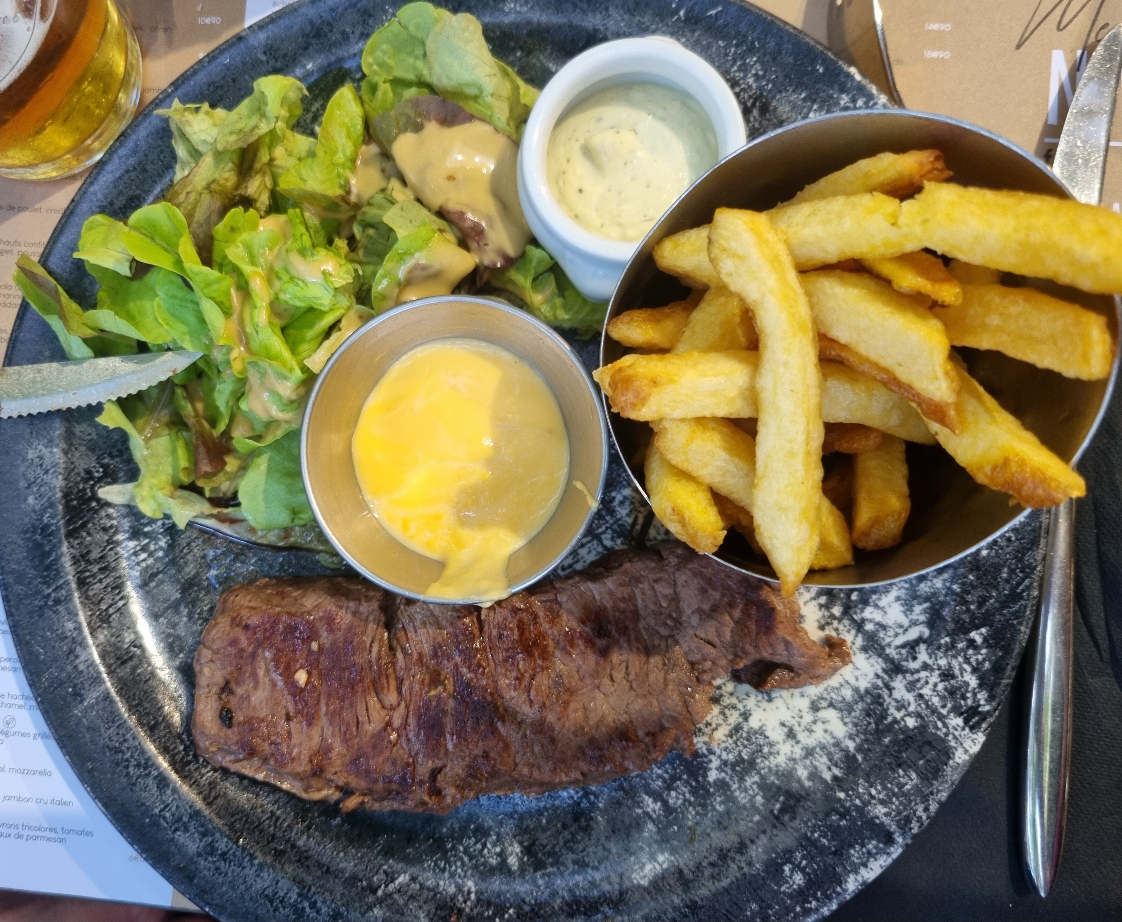 Bonjour, J’ai pris l’arrivage du boucher, viande de 180g servie avec frites et salade. La viande était remplie de gras, beaucoup de morceaux inmangeables, les frites fait maison étaient froides pour le prix de 22,50€ c’est vraiment décevant. Le dessert mi-cuit était bon mais la quantité n'était pas au rendez-vous vu le prix de 7€. Cependant personnel très gentil et agréable mais la quantité et la qualité laisse vraiment à désirer.