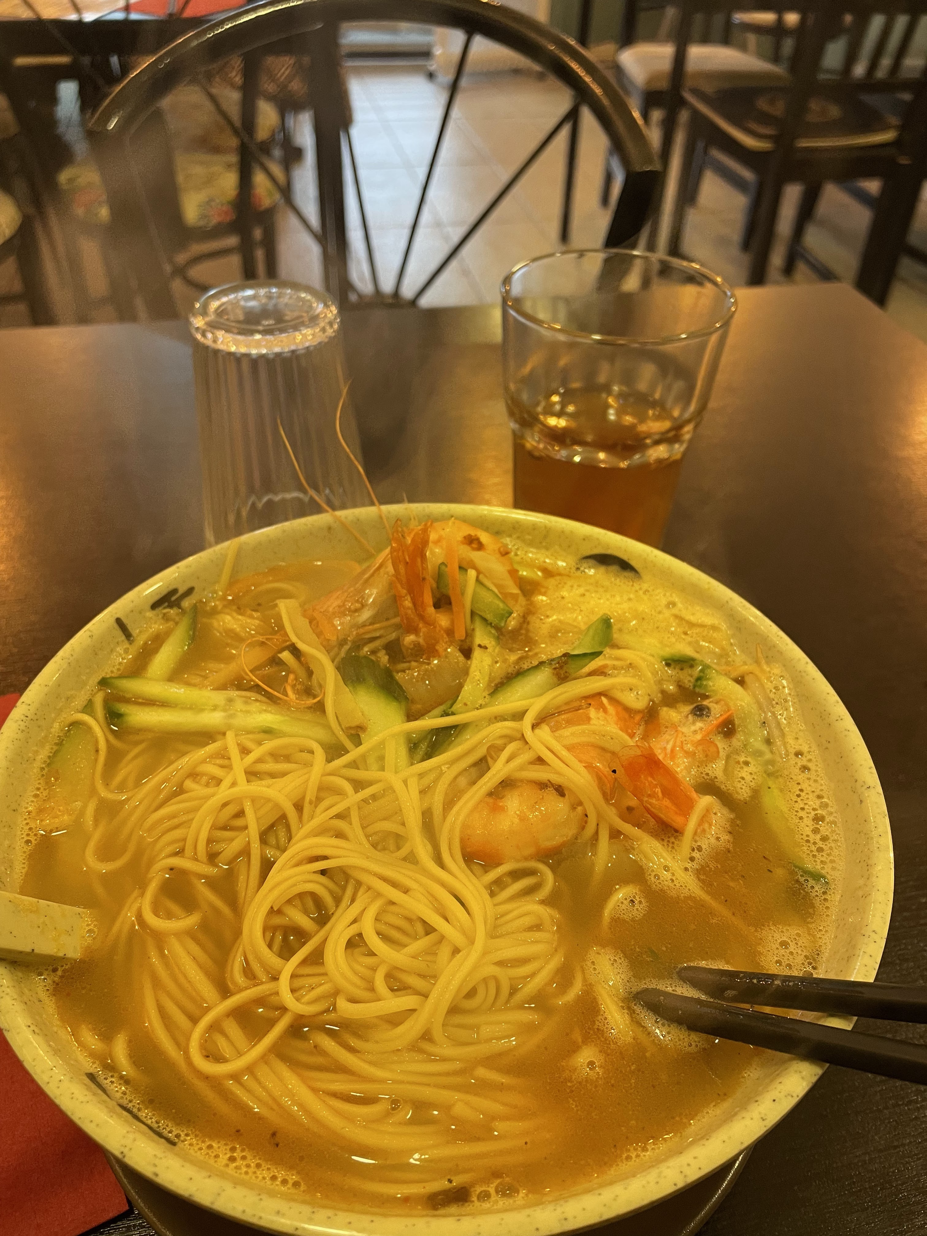 Délicieuses nouilles aux crevettes, délicieuses! J'adore ici.