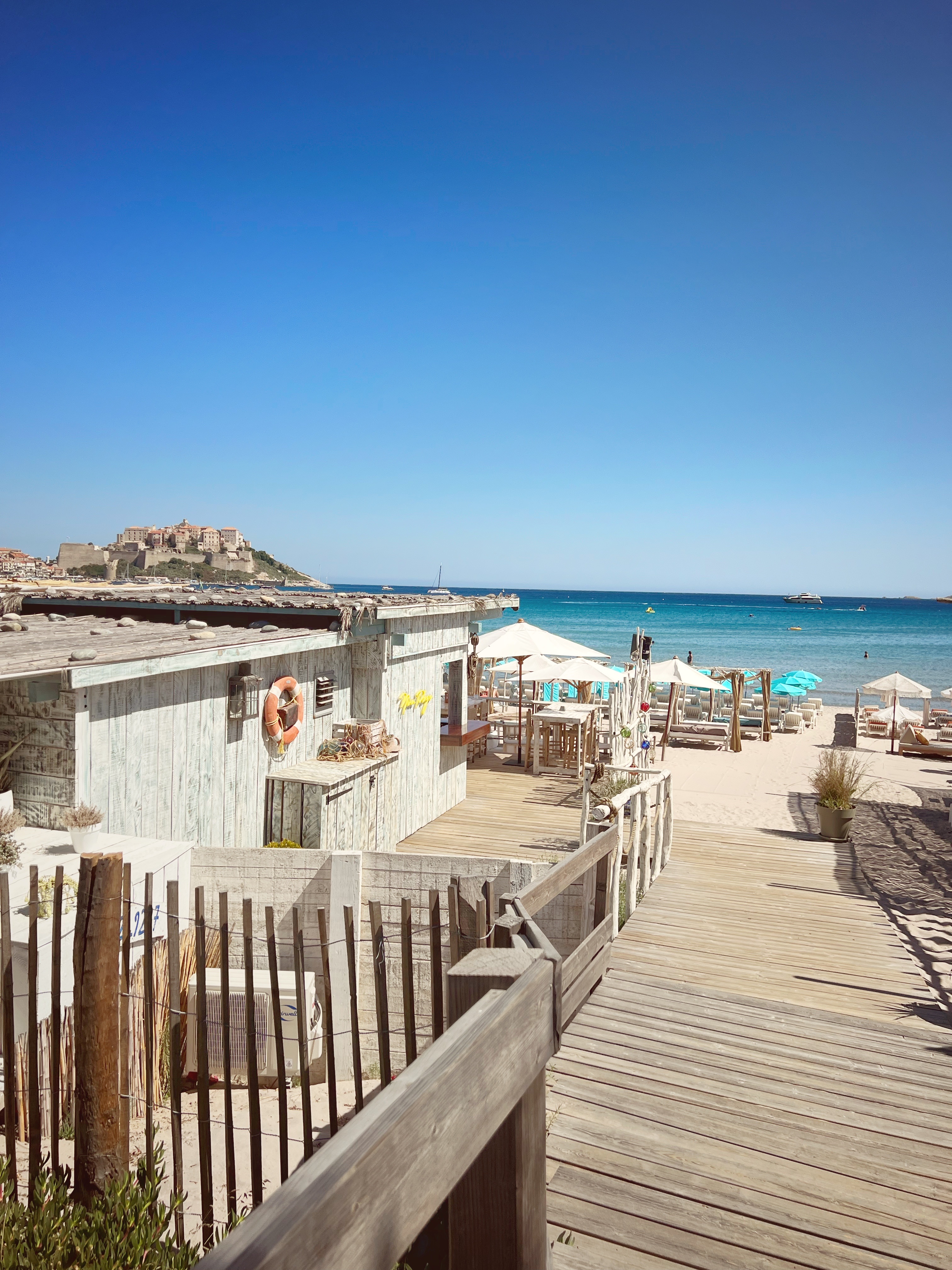 Restaurant de plage ambiance décontractée avec déco en bois, équipe adorable, bon petits plats un peu chers mais de qualité (glaces de chez Raugi), belle vue sur la Citadelle de Calvi. Les transats de la plage ont l'air tellement confortables ! Ambiance vacances garantie !