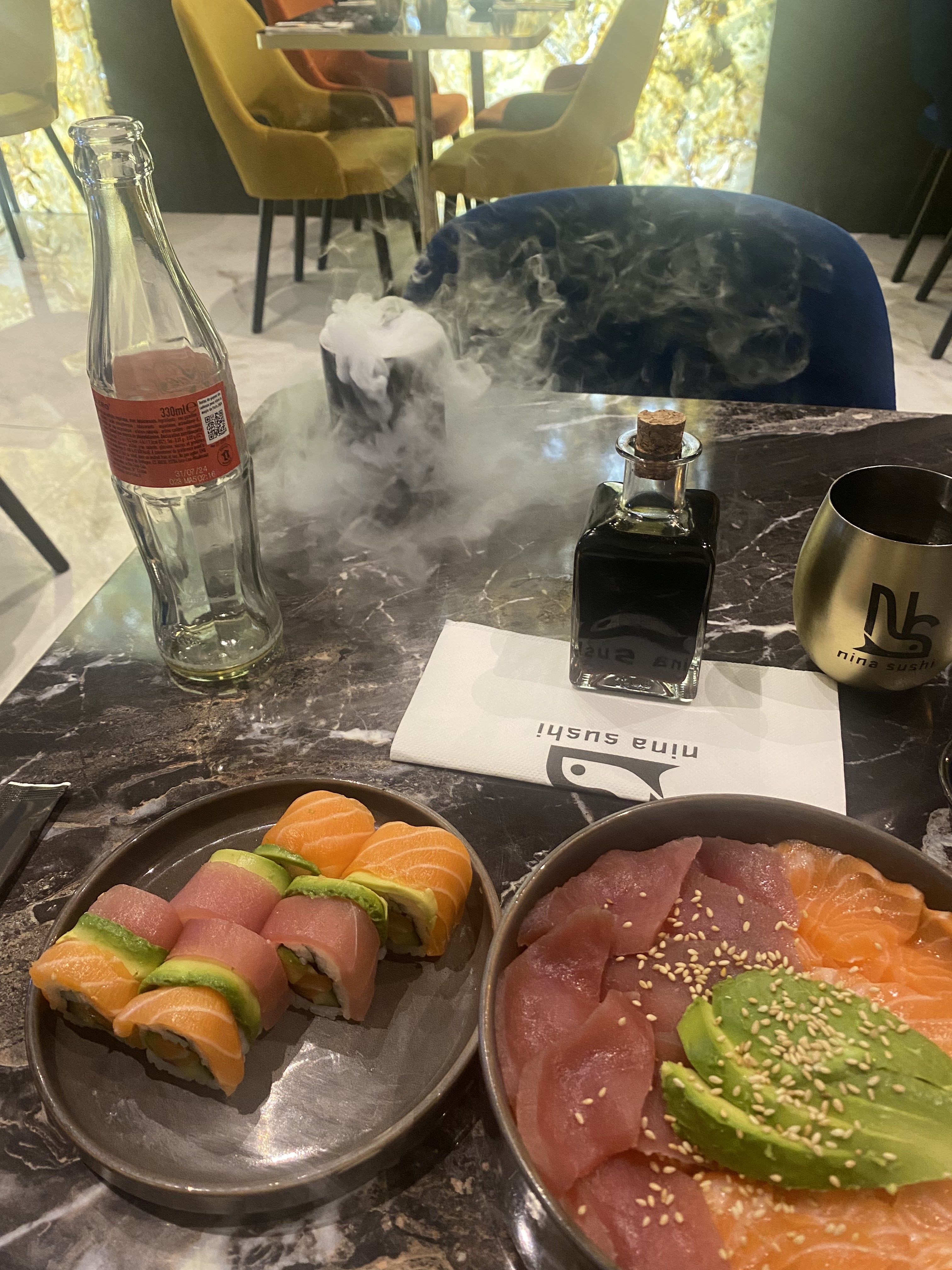 NINA SUSHI c'est la fusion parfaite entre culture nippone et new-yorkaise. Tu pourras trouver ici les ingrédients variés alliant plats chauds et froids. Chez Nina Sushi, ils redéfinissent l'art du sushi avec des délicieuses créations. Nous avons pris : Dogfizz poulet mayo - Avocado flower : Tartare de saumon mariné - Mango Roll : saumon braisé, panko, piment mangue, cheese - Plateau Collection : cheese roll, rollup saumon, dragon tuna & colorRoll saumon - Makis saumon