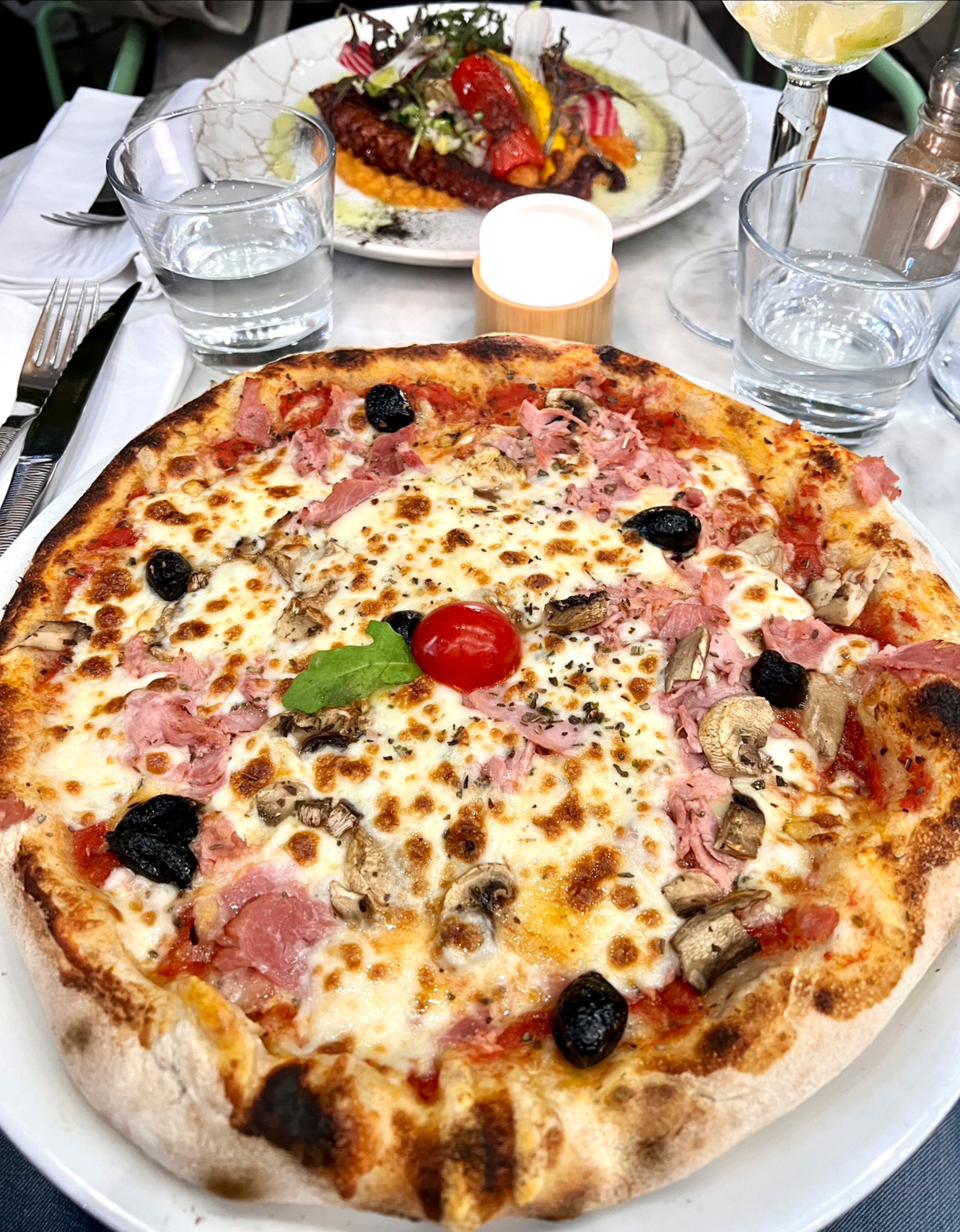Des pizzas garnies d'ingrédients de mauvaise qualité (le fromage n'est certainement pas de la vraie mozzarella, la charcuterie n'a aucun goût). Le résultat est indigeste et au niveau d'une pizza de snack/kebab, qui eux n'ont pas l'indécence de vendre leur pizza 19€. Rien à redire sur le service par contre, c'était pro et agréable tout au long du repas.