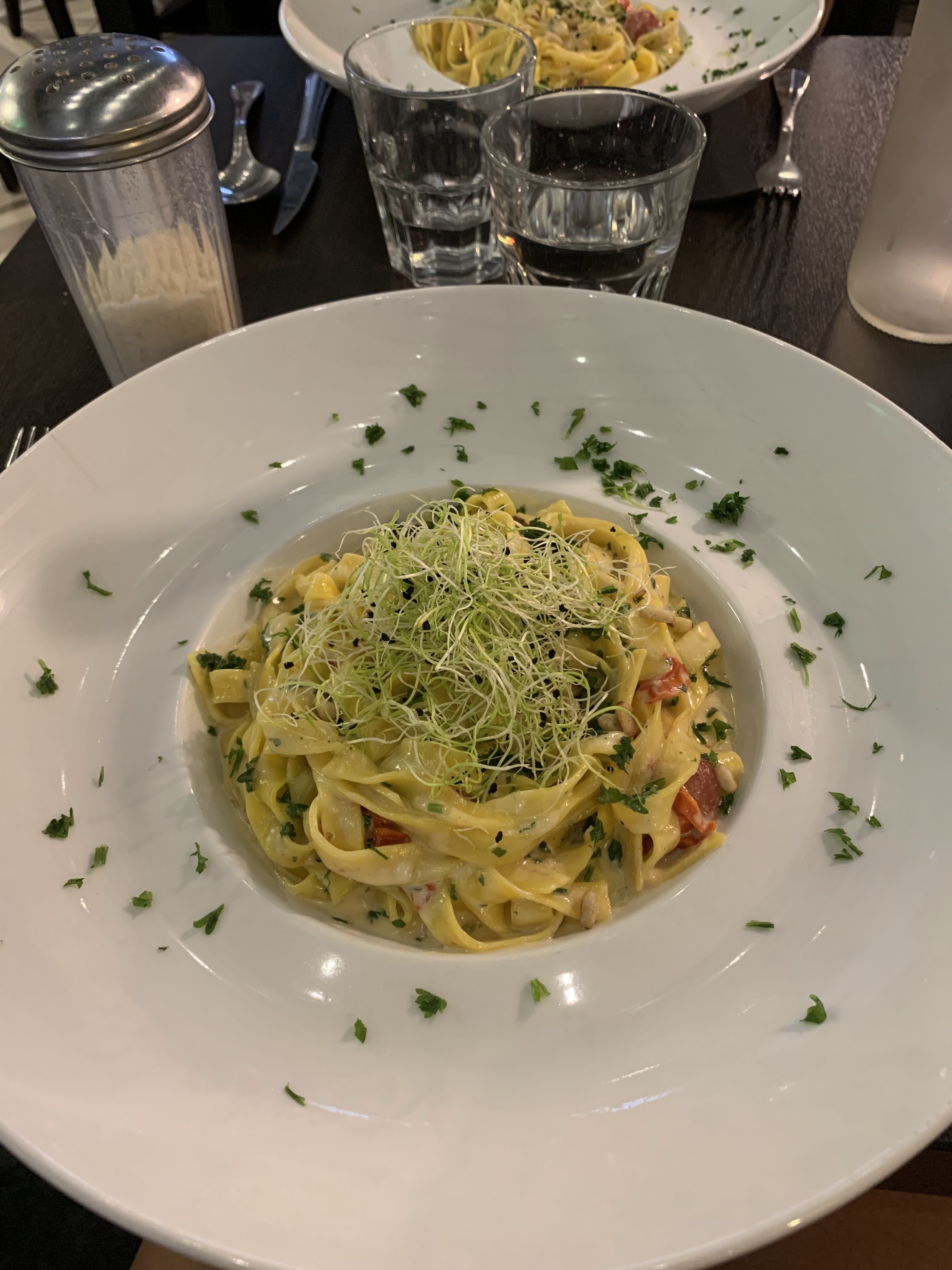 Nous avons trouvé ce restaurant par un pure hasard .. il propose principalement des pâtes et des pizzas. Nous avons opté pour des pâtes .. pour ma part c’était des pâtes noires, étrange mais bon. Les pâtes aux fruits de mer étaient un peu fade mais elles étaient bonnes. Le dessert était très bien présenté .