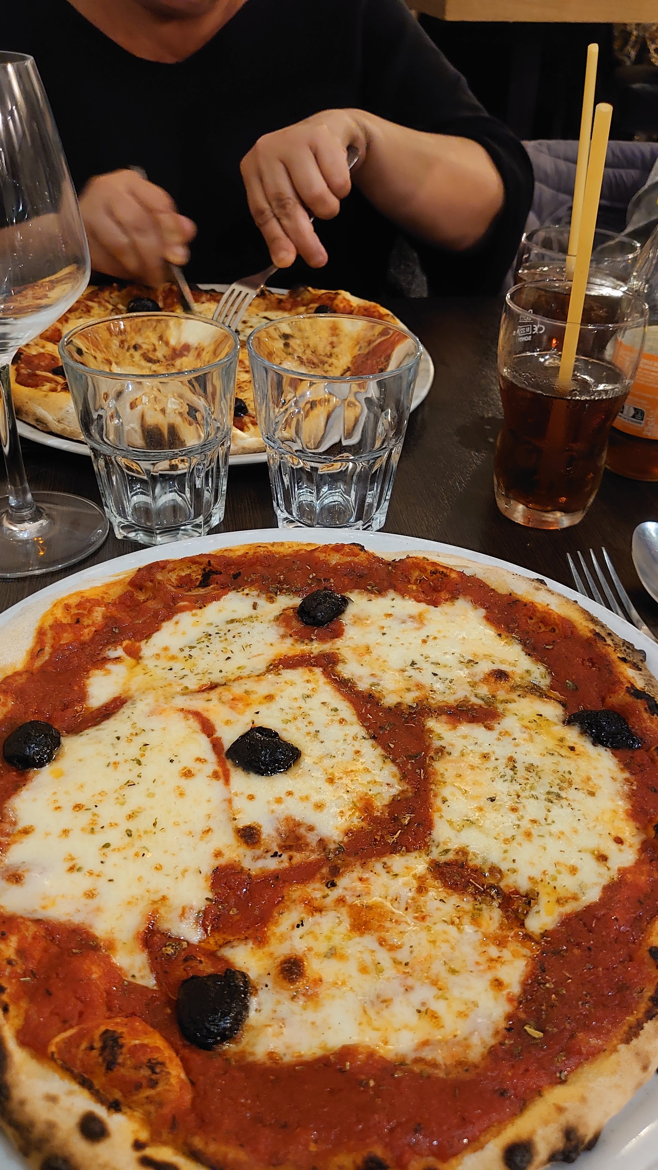 A éviter : Ma visite dans l'ordre : En entrant, on ressent un esprit et un bruit de cantine. Un brouhaha.... Un bruit que l'on a le temps d'apprécier puisque personne ne nous accueille malgré que l'on soit frôlé par les serveurs et serveuses. Enfin placés, on commande les apéritifs, alcool et sodas qui nous sont servis sans rien à grignoter ! Et un whisky sans rien à manger avec .... ça monte vite à la tête ! Donc c'est sûrement un oubli, je réclame et non il n'y a rien avec, pour eux c'est normal, rien n'est prévu. Pourtant c'est une pizzeria avec des olives sur les pizzas ! Mais pas d'olives ni de biscuits ni de cacahuètes pour l'apéro. Ça risque sûrement de rogner la marge ! 😕 Le reste du repas est correct niveau goût mais très insuffisant niveau quantité... Bref le rapport qualité quantité / prix est très médiocre ! Passez sans vous arrêter, à côté c'est mieux.
