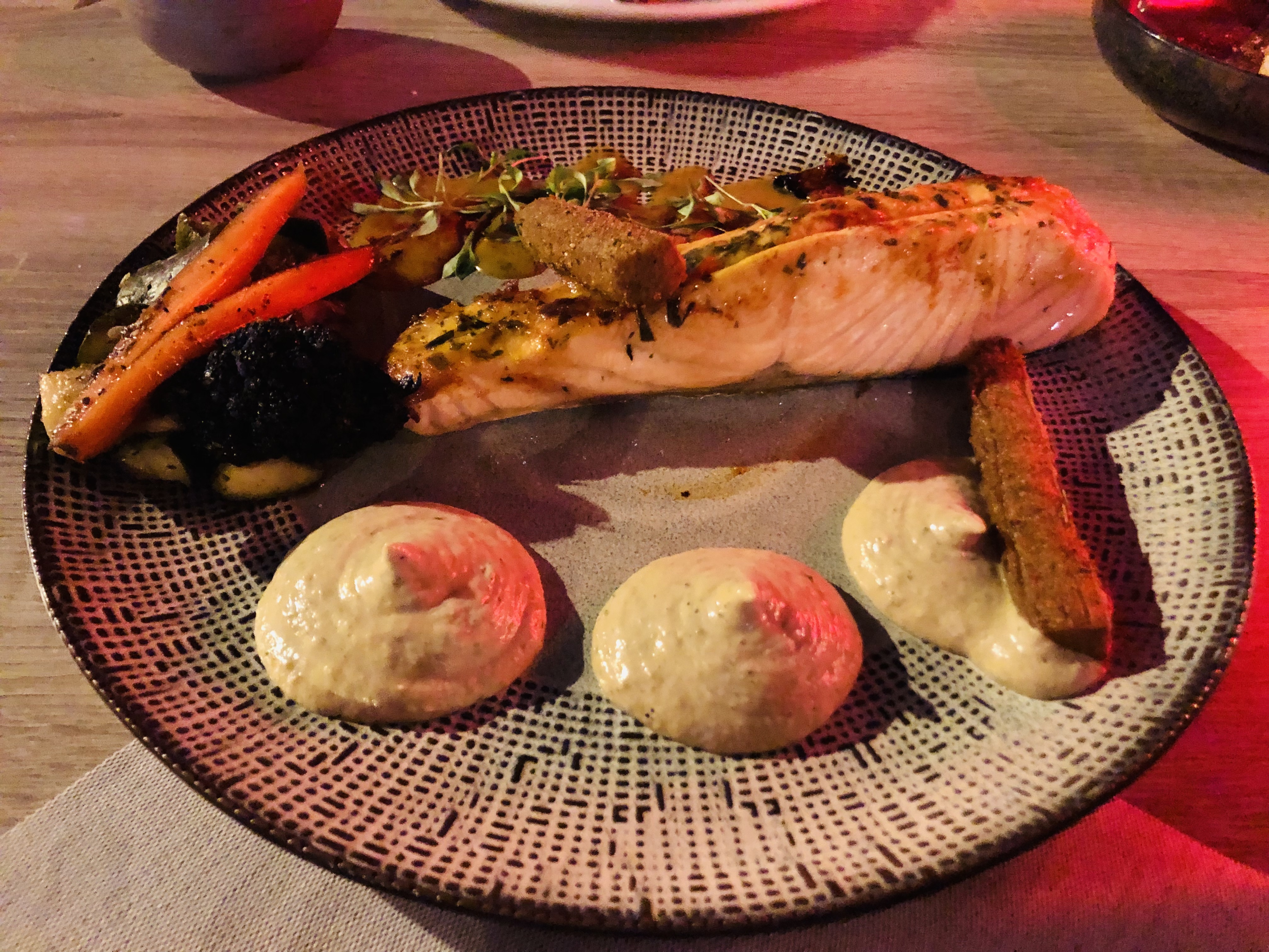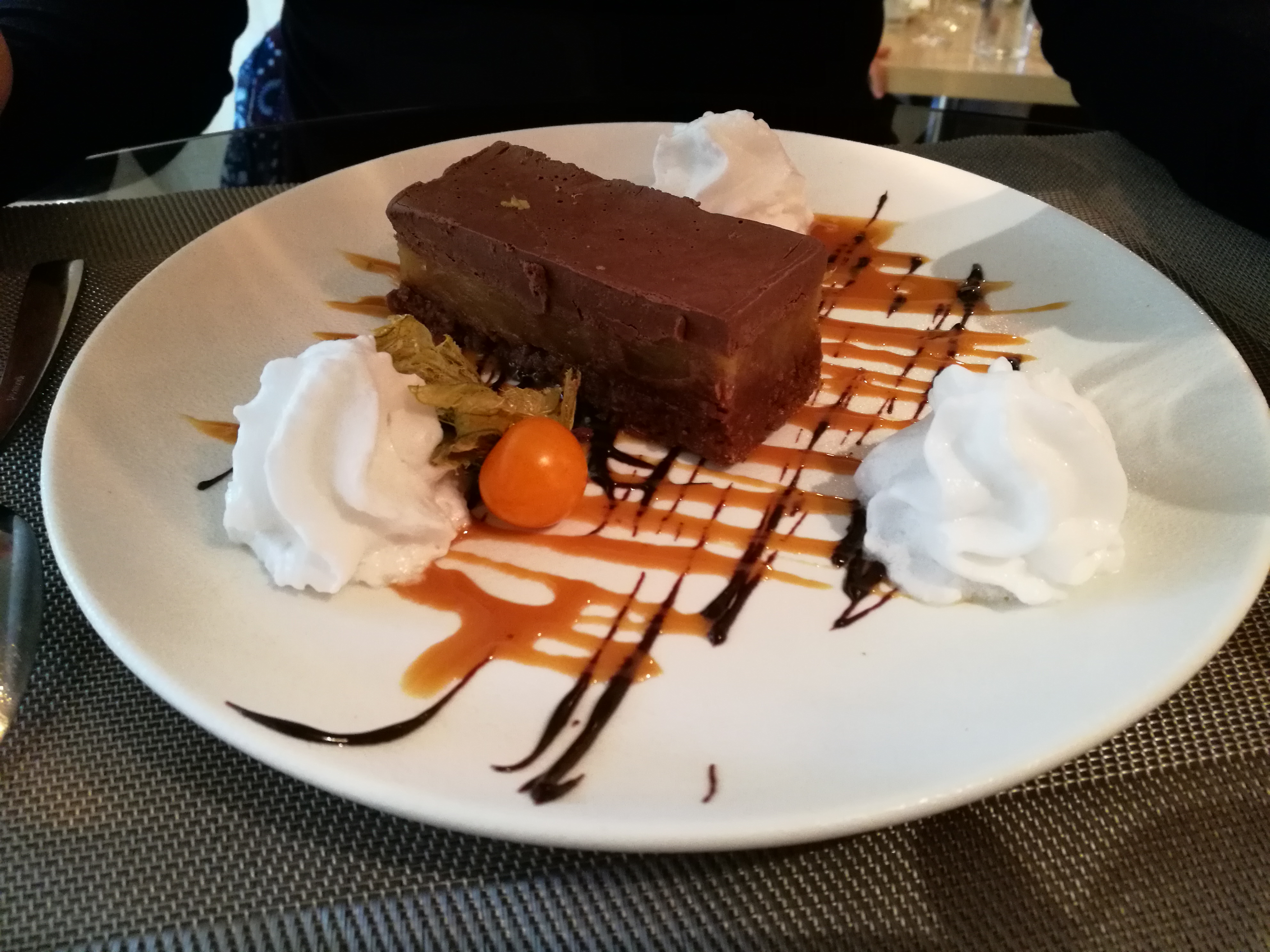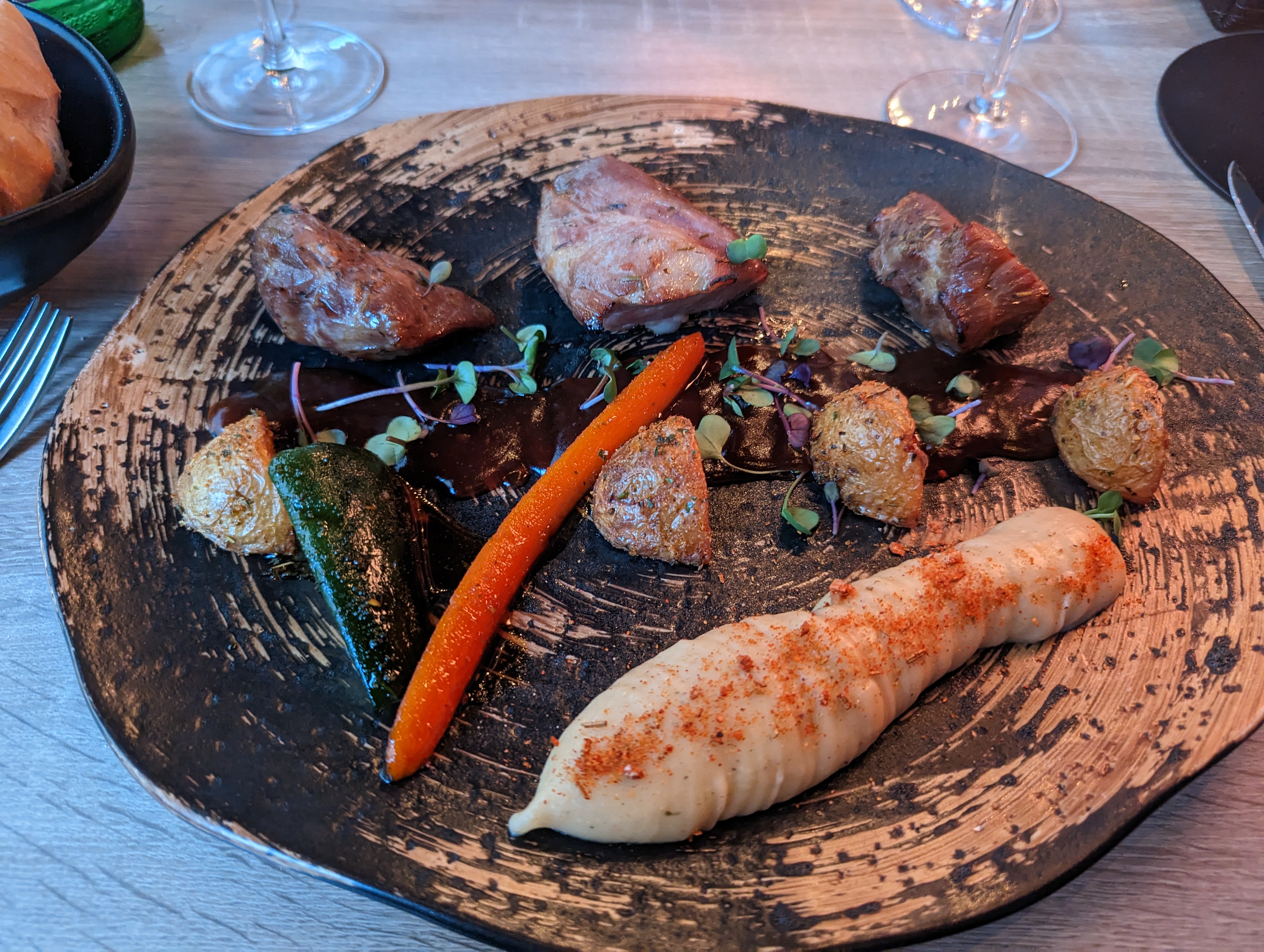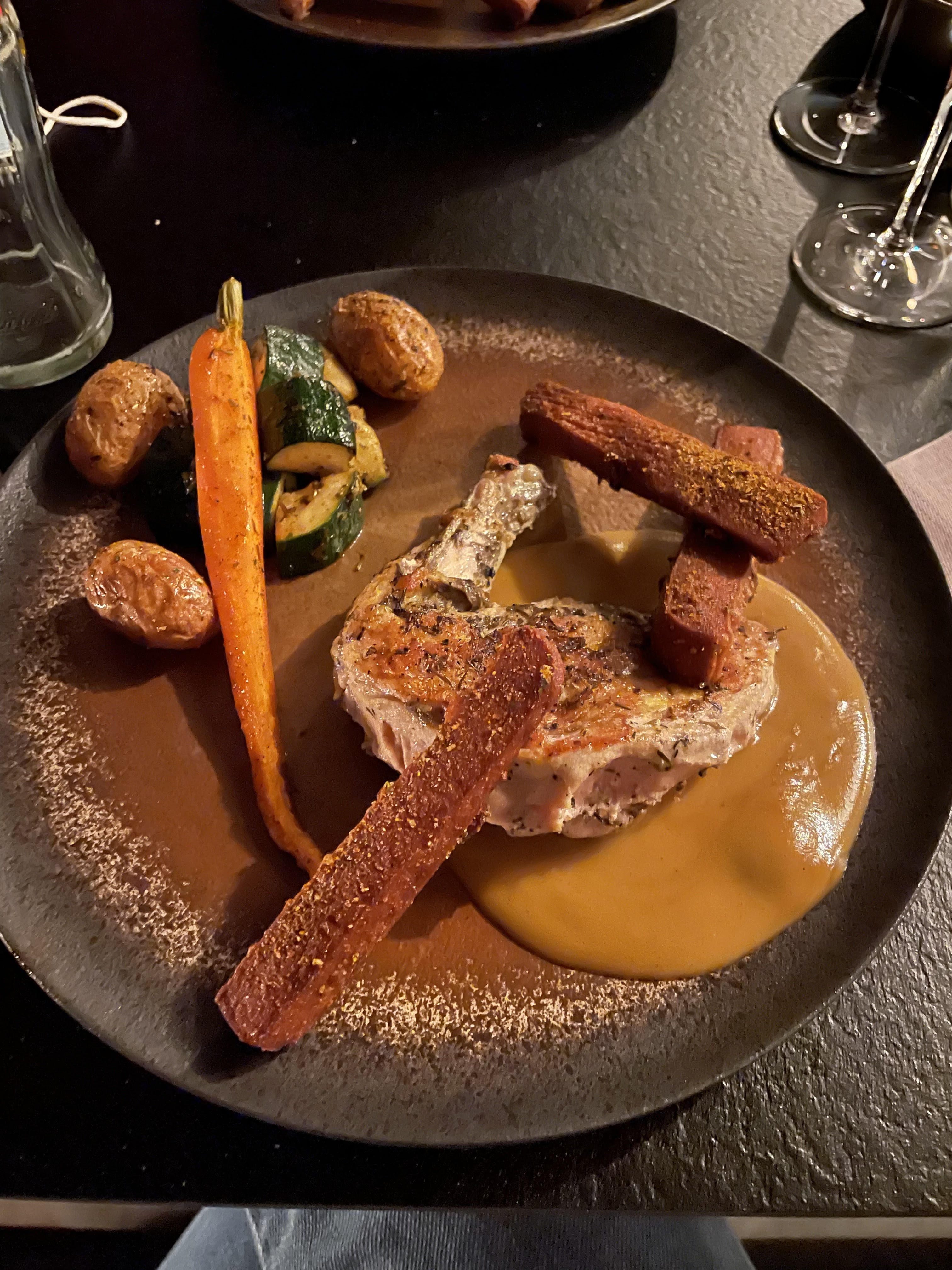 Conseillé par des sites touristiques comme Yonder.fr ou le Gault & Millau, je pensai vraiment découvrir une cuisine plus fine et originale. Tout est confus, trop chargé, noyé dans des saveurs de noisette ou de paprika qui étouffent tout, beaucoup trop présentes. Les assiettes sombres vont de paire avec la déco du resto, sans âme. A défaut des autres qui conseillent l’endroit, je n’y retournerai pas.
