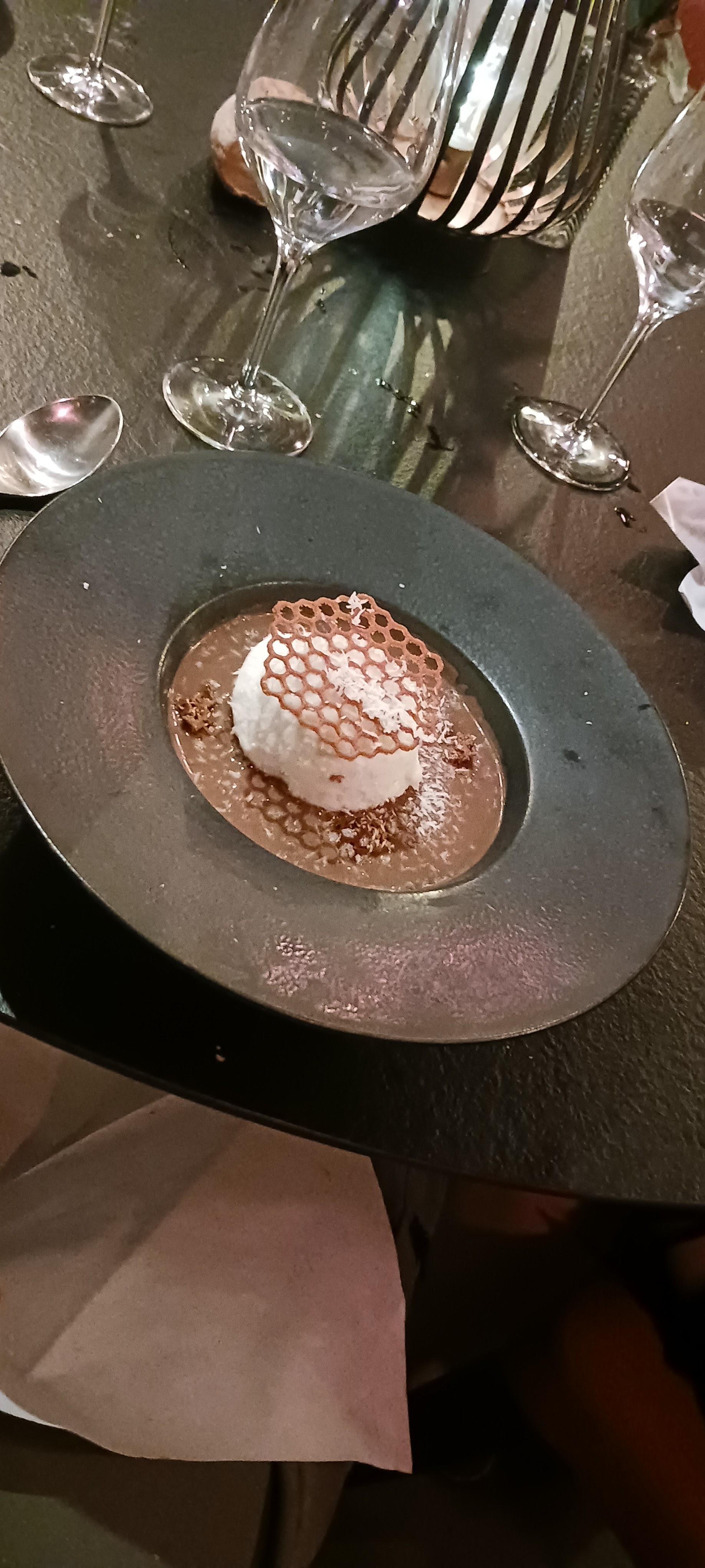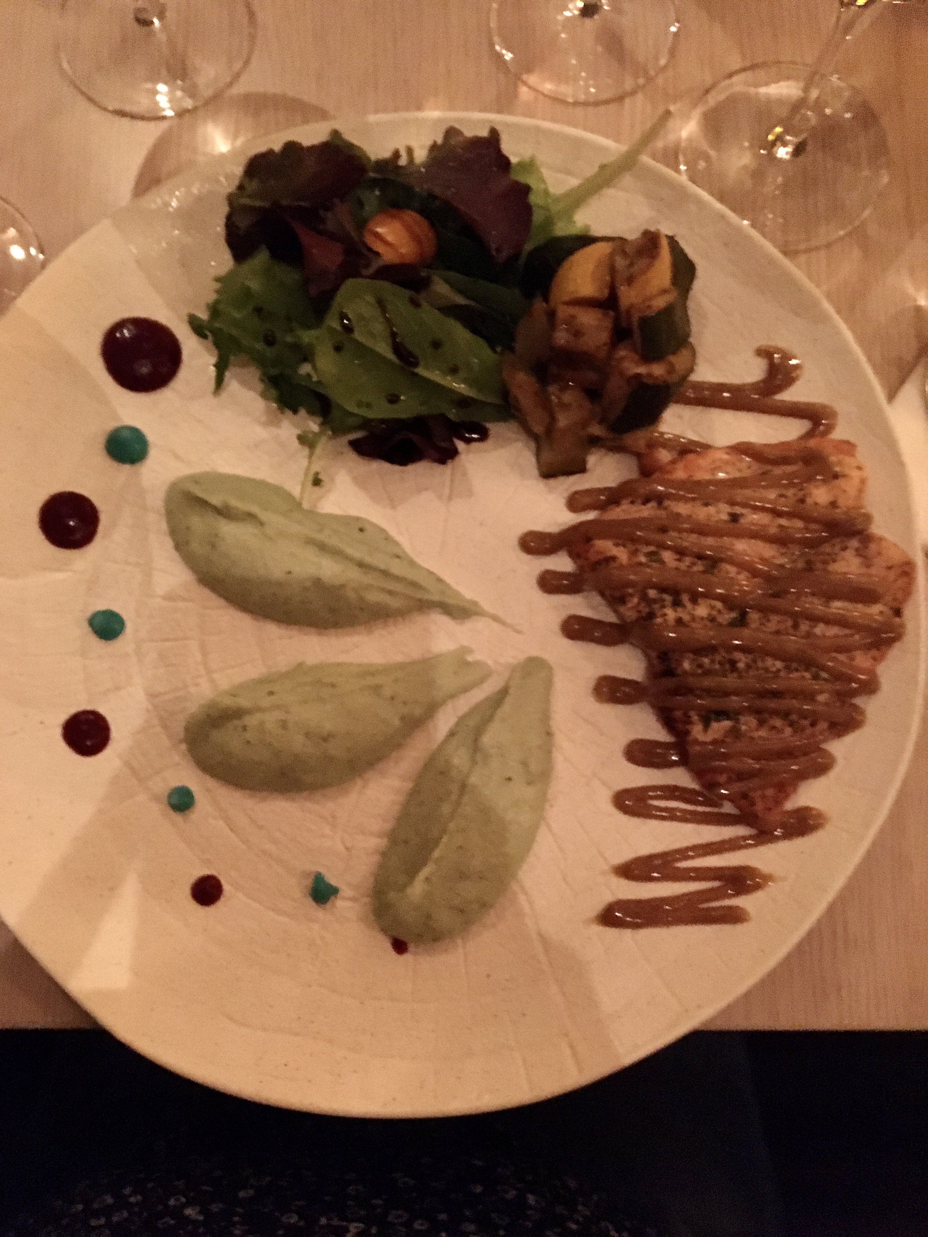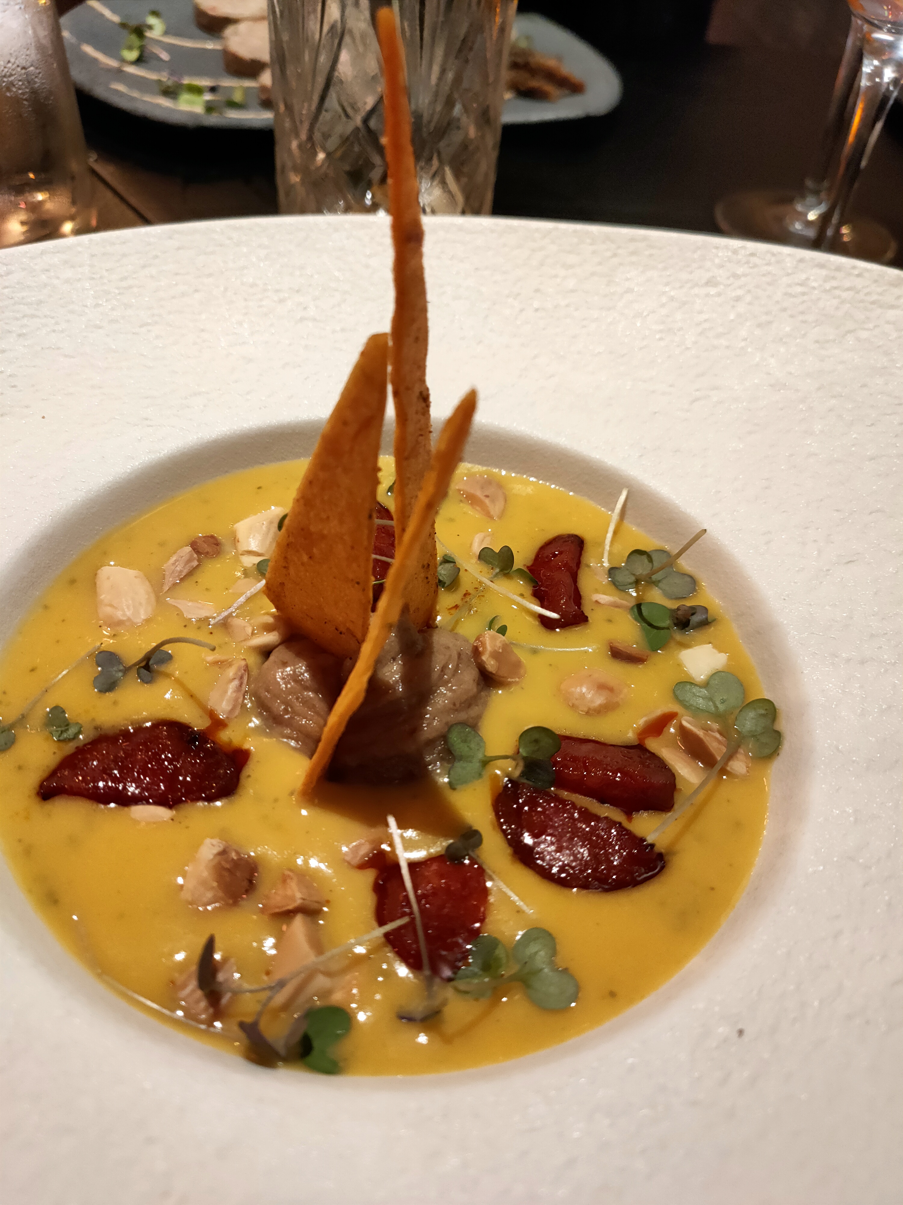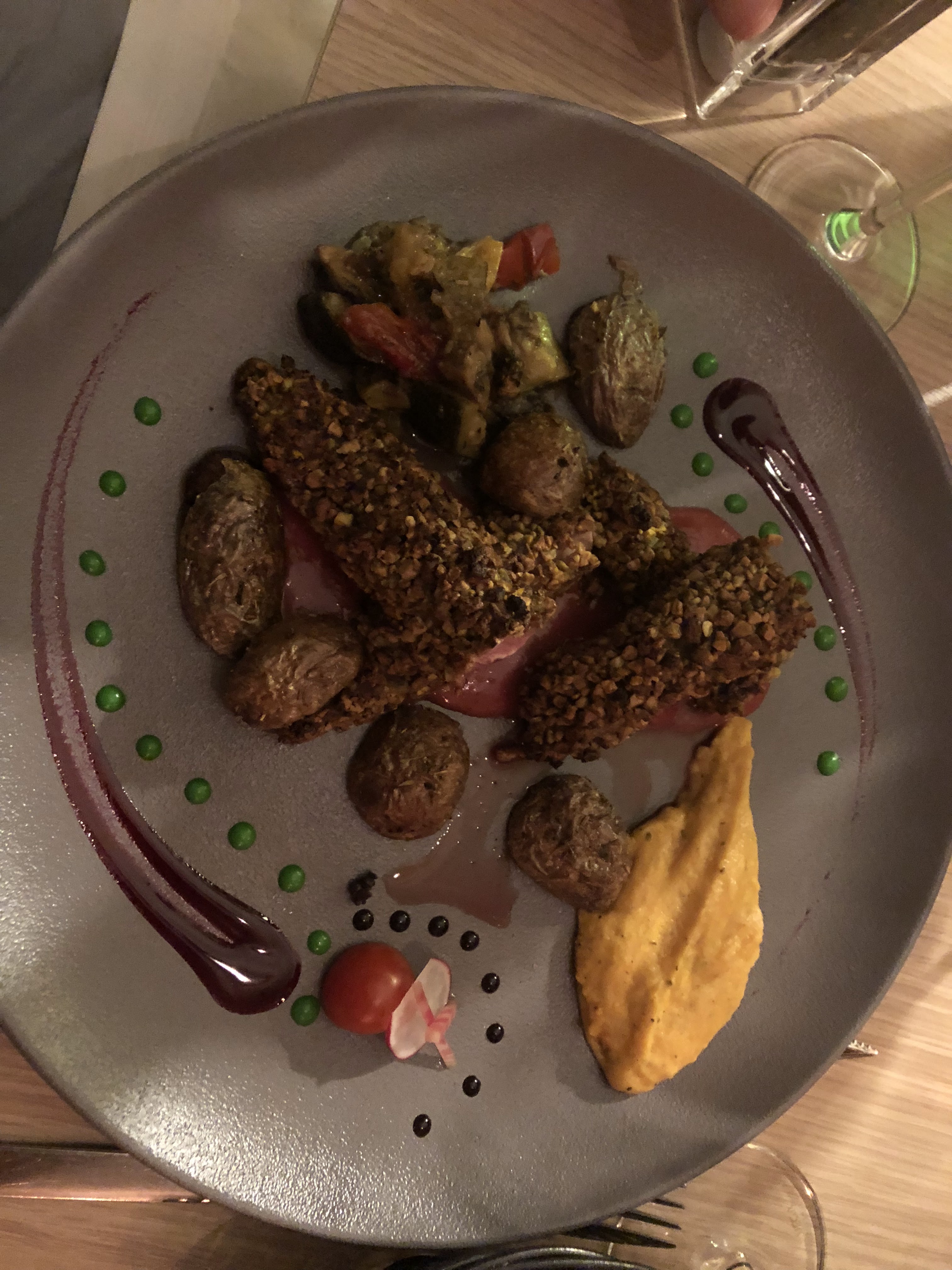 Tout était parfait ! Ambiance tamisée et bougie, la serveuse est un amour, très attentionnée, aux petits soins. J'adore les petites cartes gagent de qualité et de produits frais de saison . Ici pour 32€ le restaurant propose 2 entrées, 3 plats et 4 desserts mais également des olives en apéritifs et un velouté en amuse bouche pour nous faire patienter avant l'entrée qui était excellente comme tout le reste d'ailleurs. De superbes associations de saveur (le magret pistache framboise est juste à tomber !). Quelques touches de sucré-salé qui changent vraiment tout, la decoration des plats est au top, digne d'un restaurant semi-gastronomique.