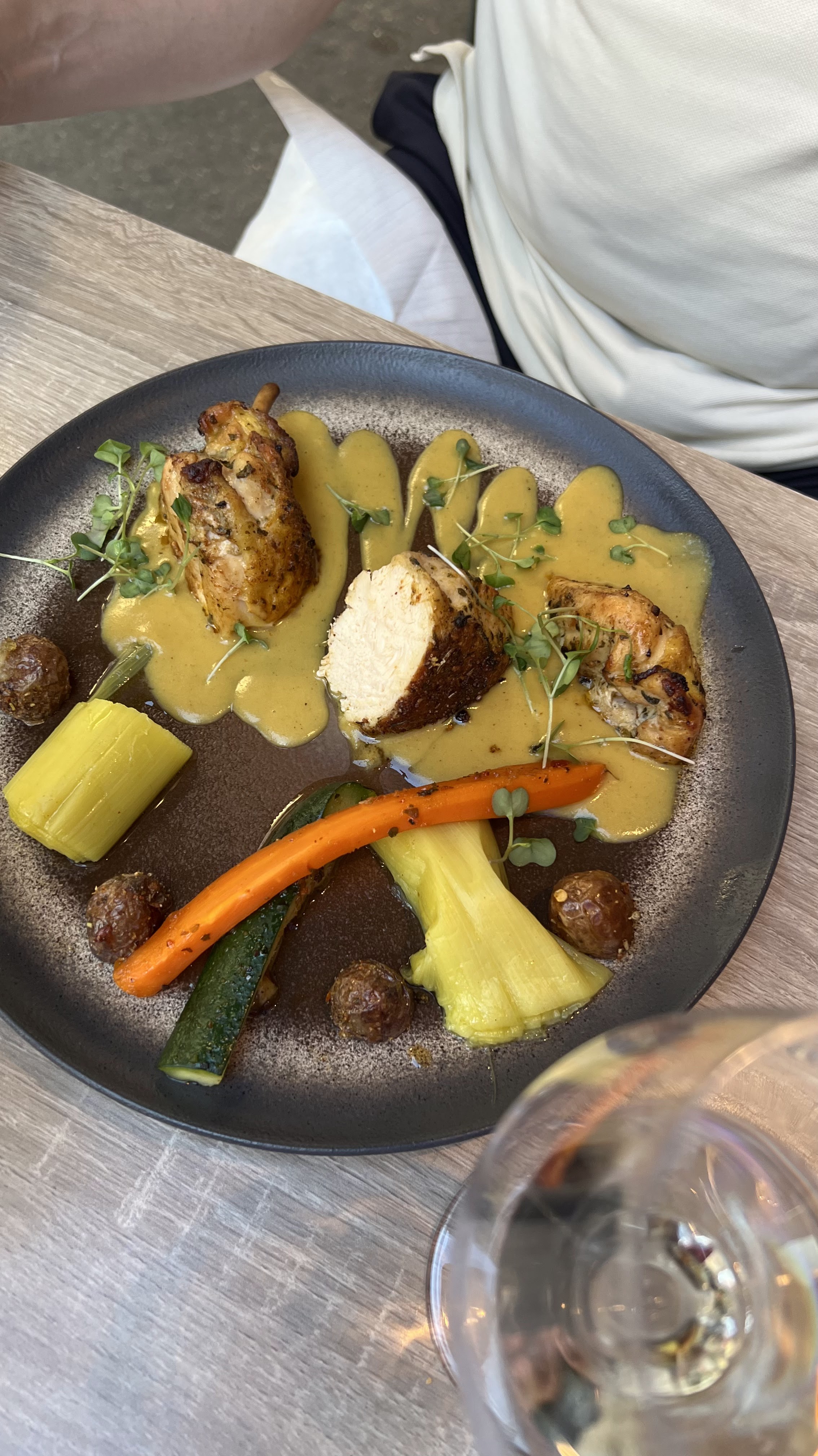 Accueil et service parfait..le suprême de poulet, sauce citron gimgembre avec ses petits légumes et sa purée céleri noisette excellent!! produits frais savoureux bien équilibré plat plus dessert 16 euros.. sur Aix c très rare..