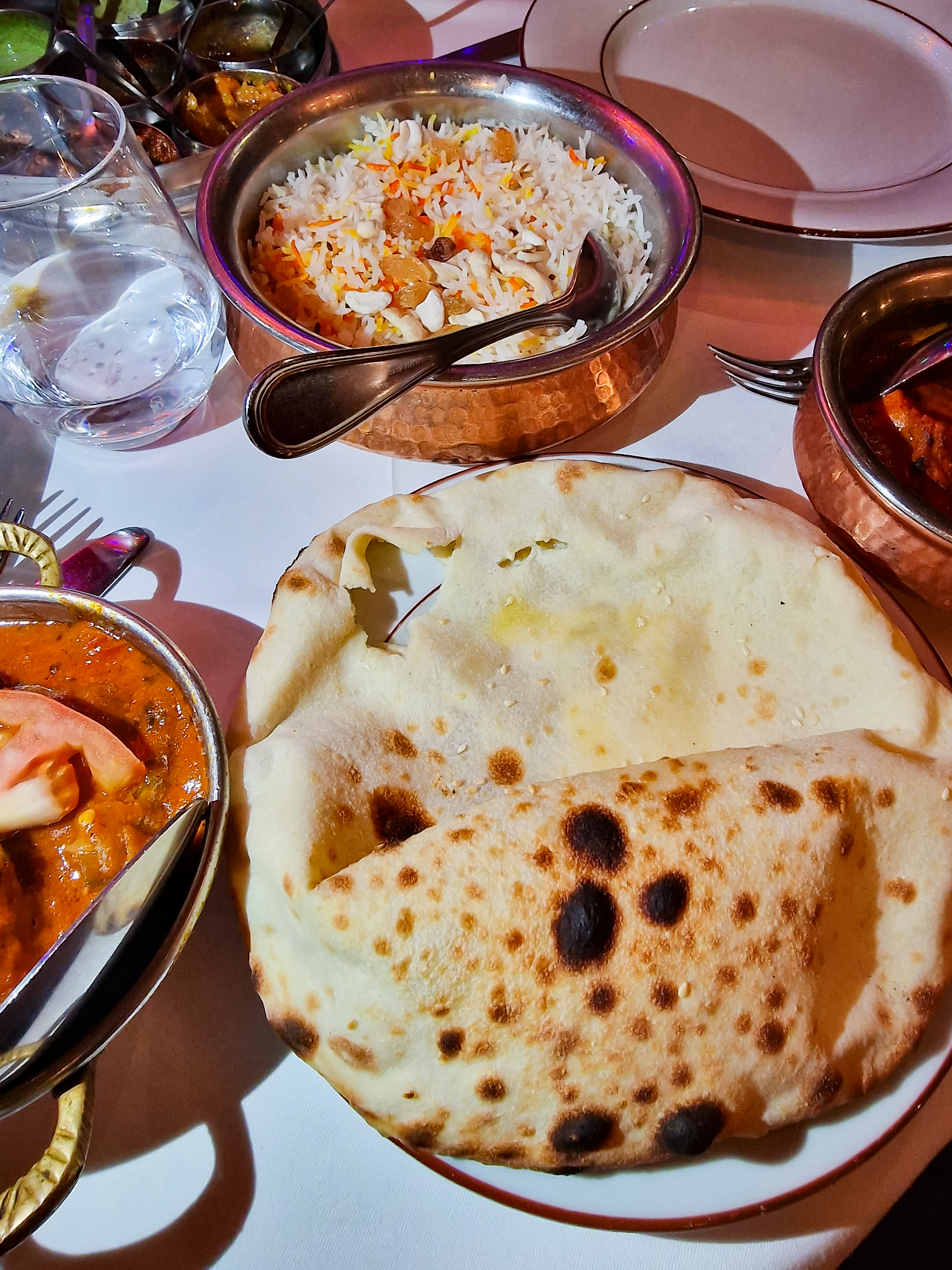 Le cheese naan est succulent! Les plats sont très bien cuisinés, on peut demander épicé comme non-épicé, il y en a pour tous les goûts, poissons, poulet, agneau et même plats végétariens. L’ambiance est très immersive, on se croirait vraiment en Inde!