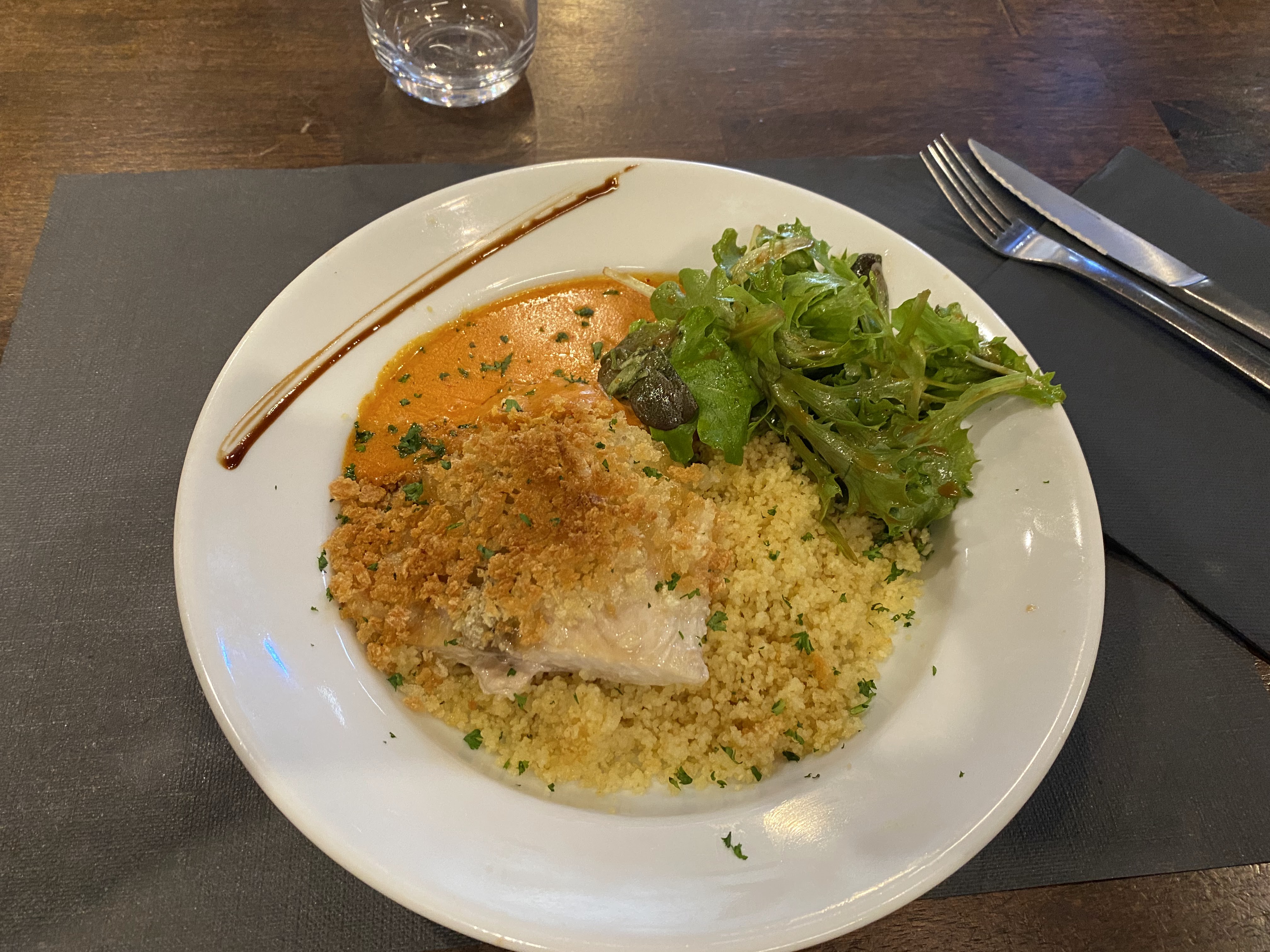 TROP bon. Le plat du jour risotto butternut et duo de poissons : un régal. Serveuse super agréable et souriante. Je recommande et je reviendrai.