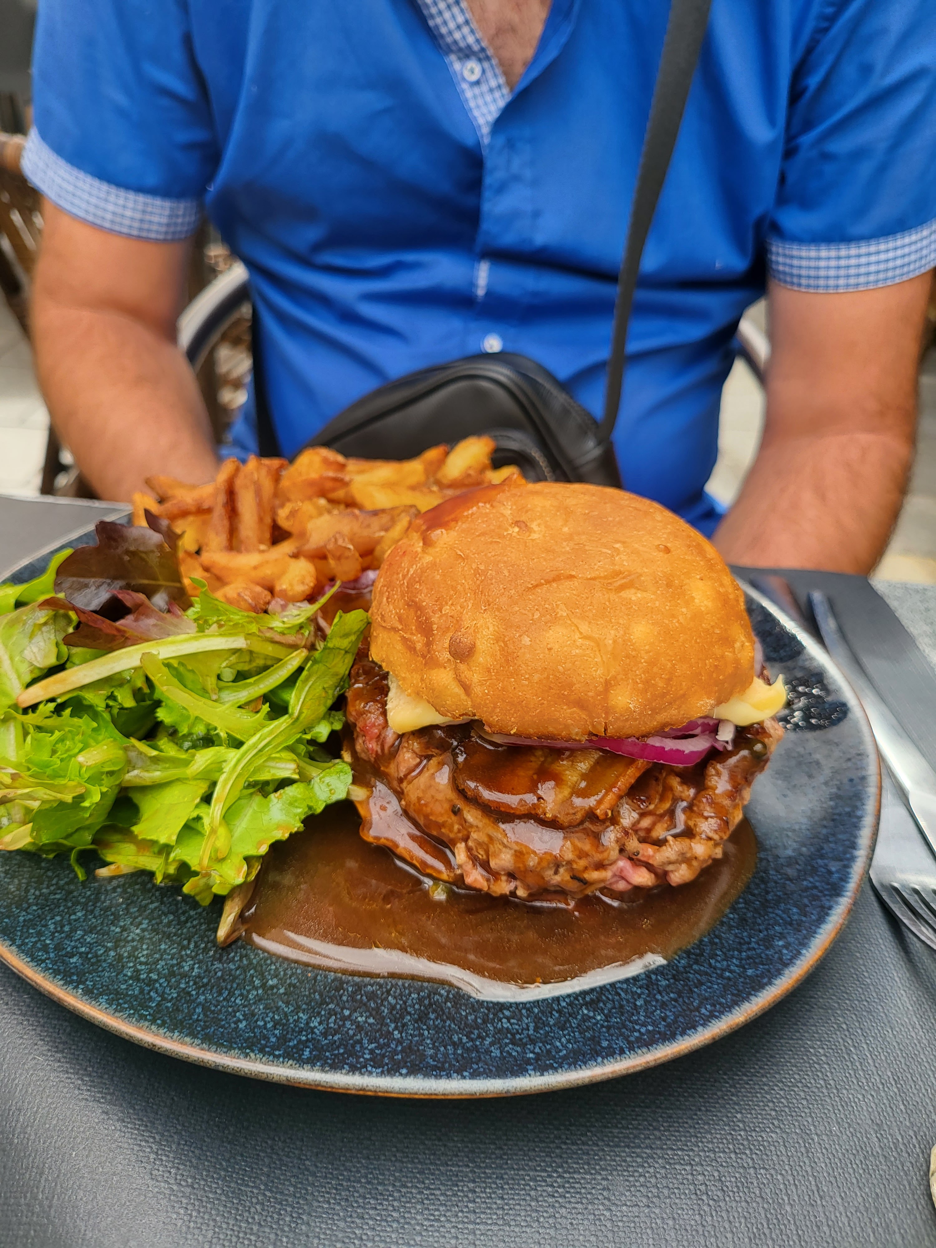 Le bœuf no comment : Pain burger, steak haché, tomates concassées, bleue brebis, ventreche, oignons rouges, sauce poivre. (16.00€) Salade césar : (14.00€) C'est mon premier restaurant à Pau, le service impeccable et le serveur très drôle. Insta : minhfitcook