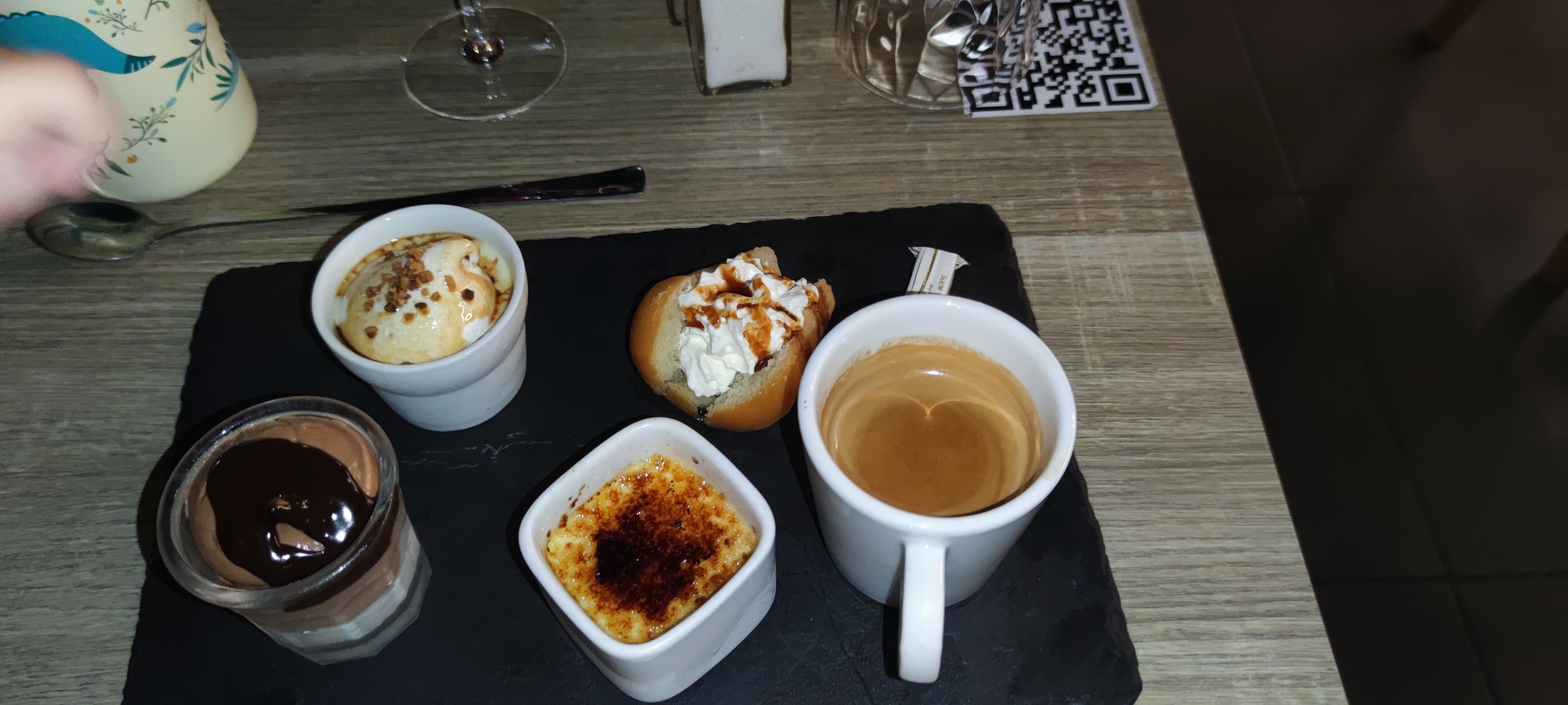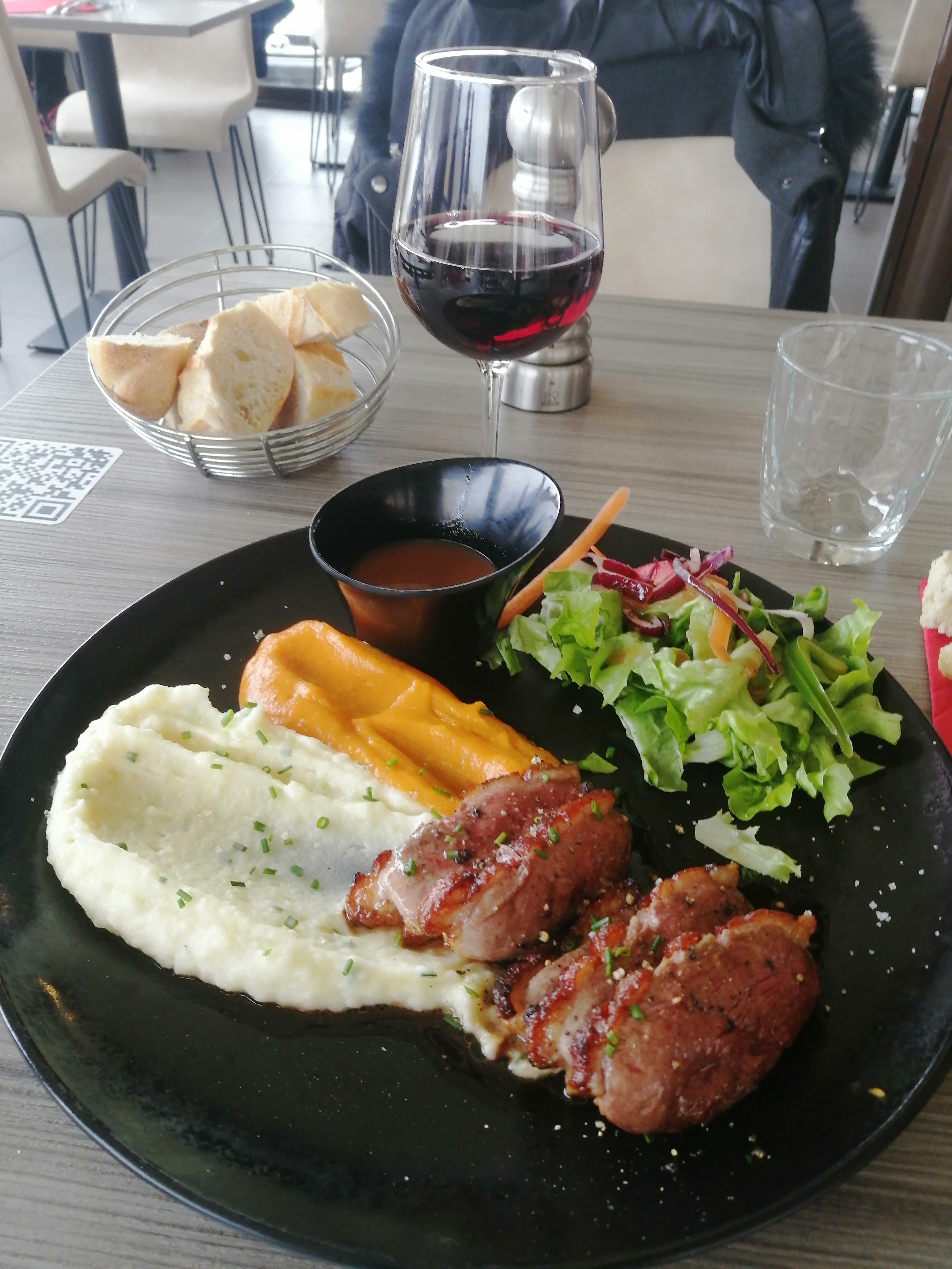 Bof, déçus. Nous avions repéré le menu plat plus dessert 19,80 euros, arrivés à table, nous n'avons pas eu le temps de scanner le QR code que le serveur nous demandait notre choix, nous lui précisons que nous sommes intéressés par le menu à 19,80 euros, il nous fait des propositions sans préciser que ces plats étaient hors menus. A la fin du repas, devant notre étonnement concernant la facture il nous a précisé que les plats étaient hors menus et le vin qu'il avait proposé à mon mari à 18 euros était facturé 21,80 euros que c'était une erreur et il nous a déduit 2 euros. ? En résumé ça fait attrape touristes. Nous n'y retournerons pas.