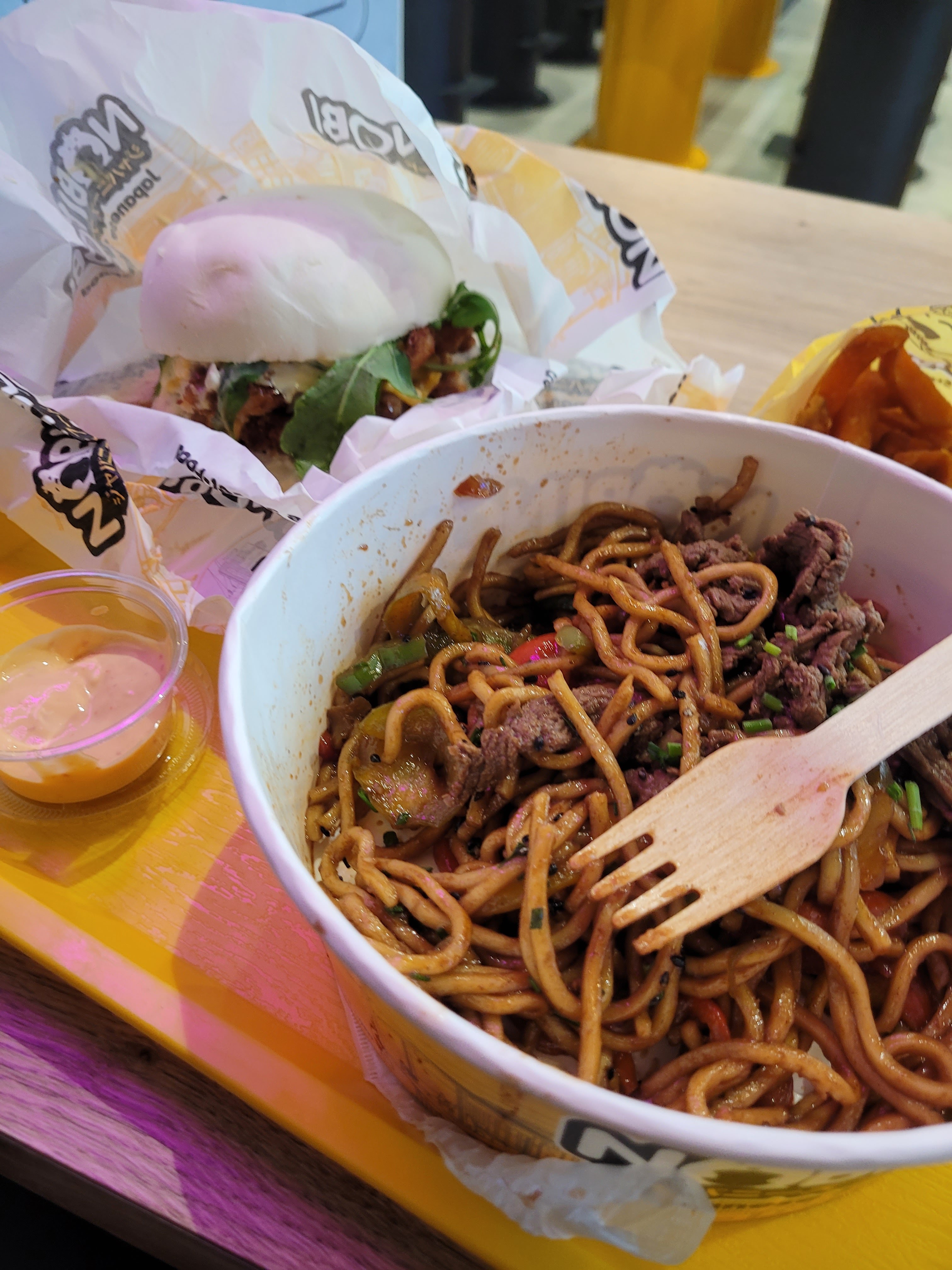 Le riz est très bon mais les nouilles .. pas ouf... Elles sont collante et la sauce n’est pas bonne. Le burger est bon et les gyoza aussi ! Dommage ..