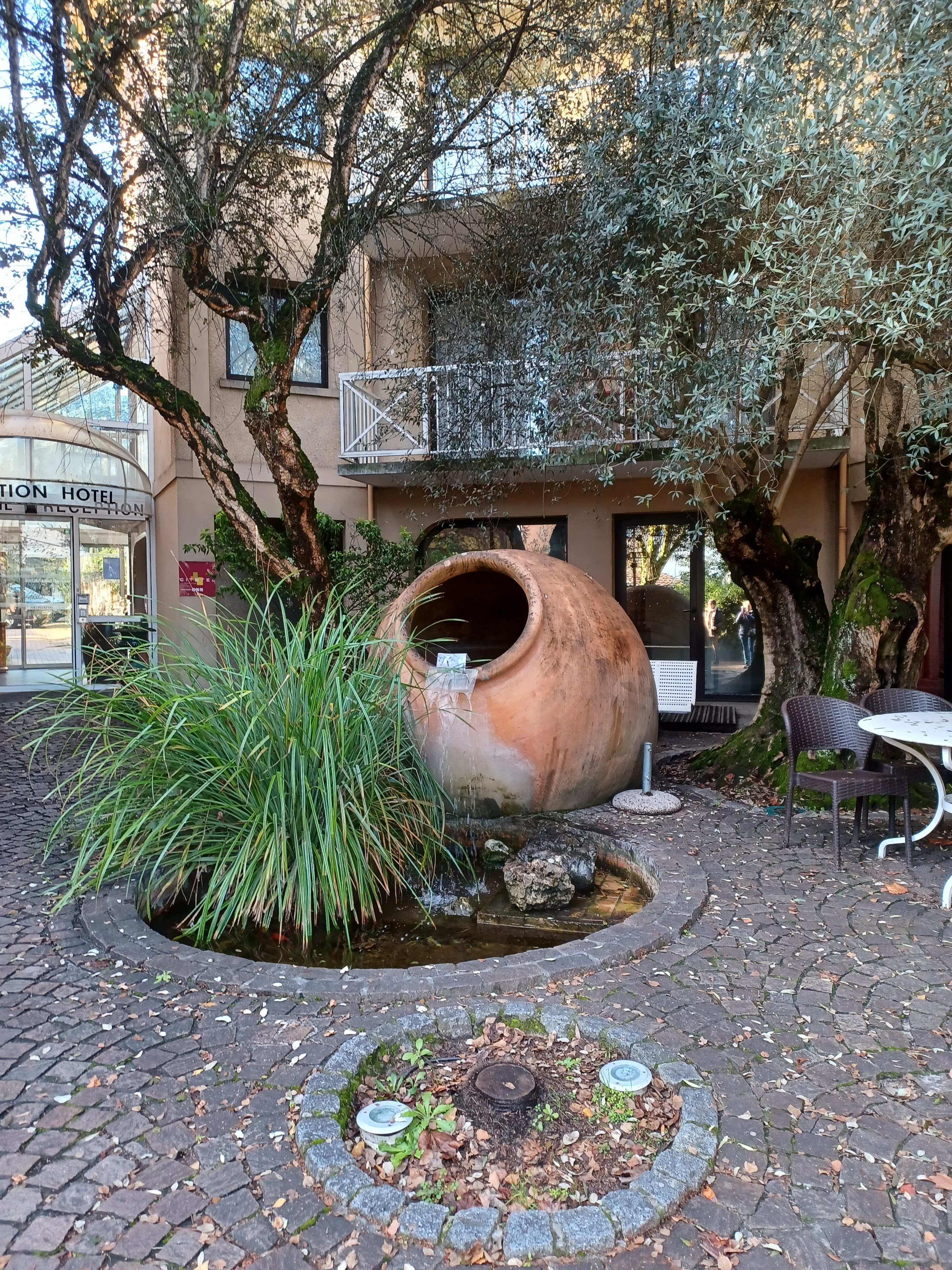 J'y suis venue dans le cadre d'une formation. Salle de réunion très agréable. Nous avons mangé à la brasserie (pas au restaurant gastronomique, car ils font les deux) chaque midi. L' espace extérieur est superbe, extrêmement agréable ! Les deux immenses oliviers et la jarre géante qui verse dans un bassin aux poissons, donnent à ce lieu charme et sérénité. Un havre de paix où l'on mange très bien !