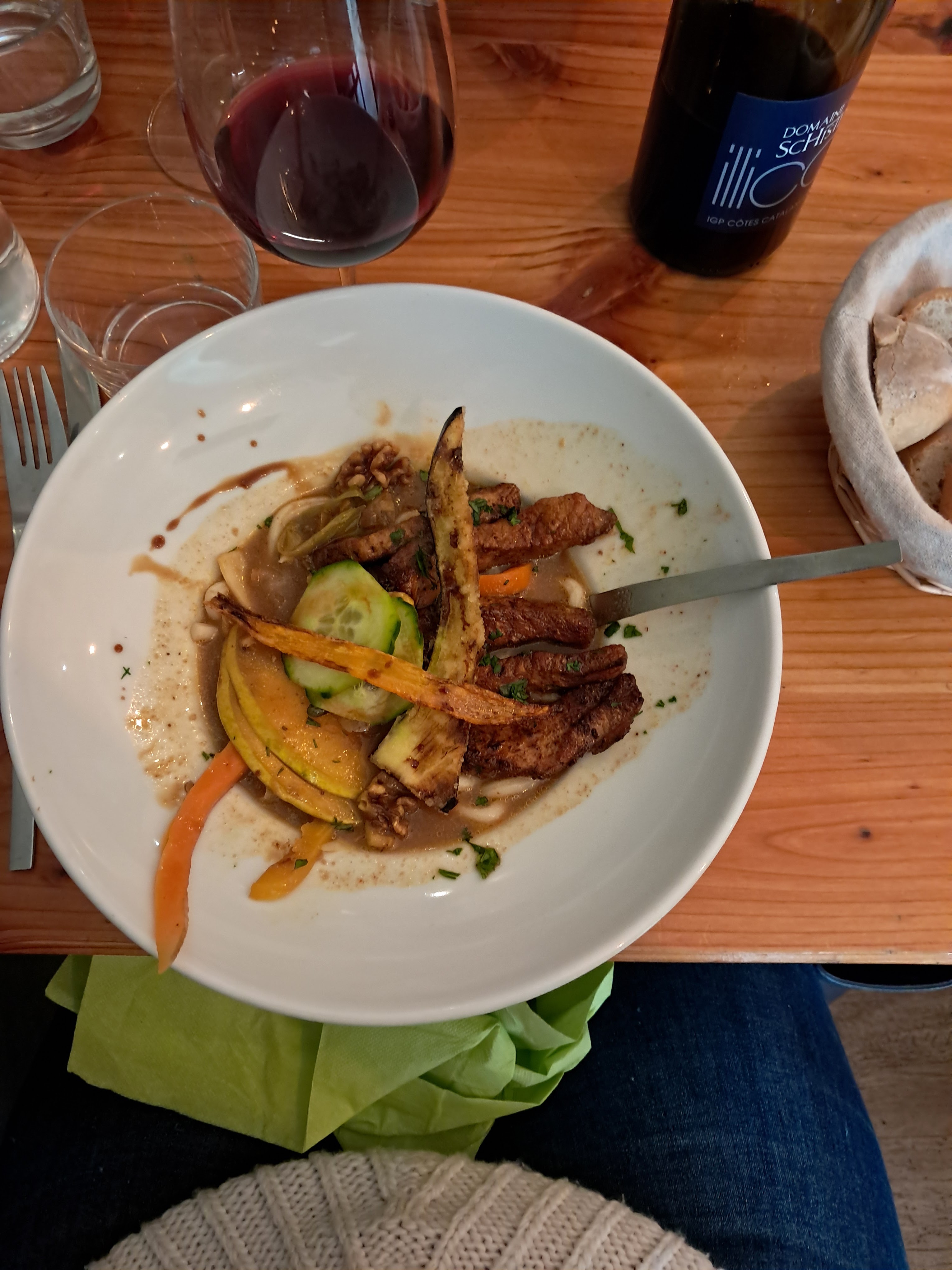Succulent !! Que vous ayez faim ou pas, allez y! Pour 20€par personne, aujourd'hui : une excellente soupe aux haricots rouges : un peu relevée, très parfumée, bouillon parfait et haricots moelleux. Une recette arménienne. Du porc Ramen: grillé, parfumé, bouillon très goûteux, et des légumes parfaitement cuisinés ( bien cuits, comme le poireaux, ferme comme la carotte, l'aubergine frite est un petit bonheur...) Et pour dessert un feuilleté banane noix de coco qui a fondu tout seul dans la bouche : pas trop sucré, savoureux, léger. Le tout agrémenté d'un vin des hautes Corbières ( estagel) dont le prix était tout à fait correct. Les propriétaires ( serveur et cuisinière) vous expliquent leurs plats, Mme la cuisinière rentre de son marché les bras chargés d'herbes aromatiques... Il nous tarde d'y revenir