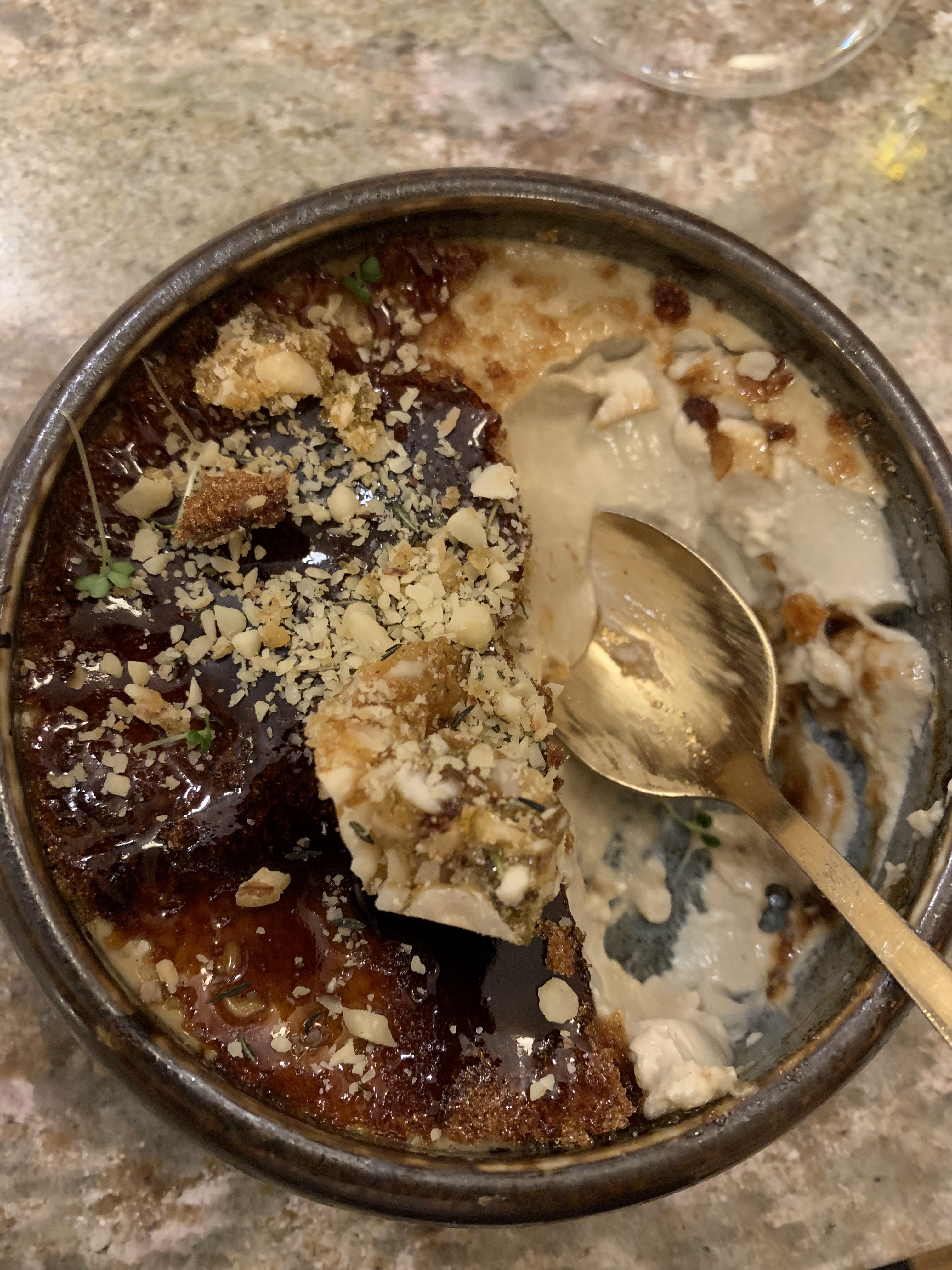 Tout est délicieux, de l'entrée au dessert en passant par le pain (venu d'une très bonne boulangerie locale). Petit coup de coeur pour la crème brûlée du moment : la meilleure que j'ai eue l'occasion de goûter. Foncez !