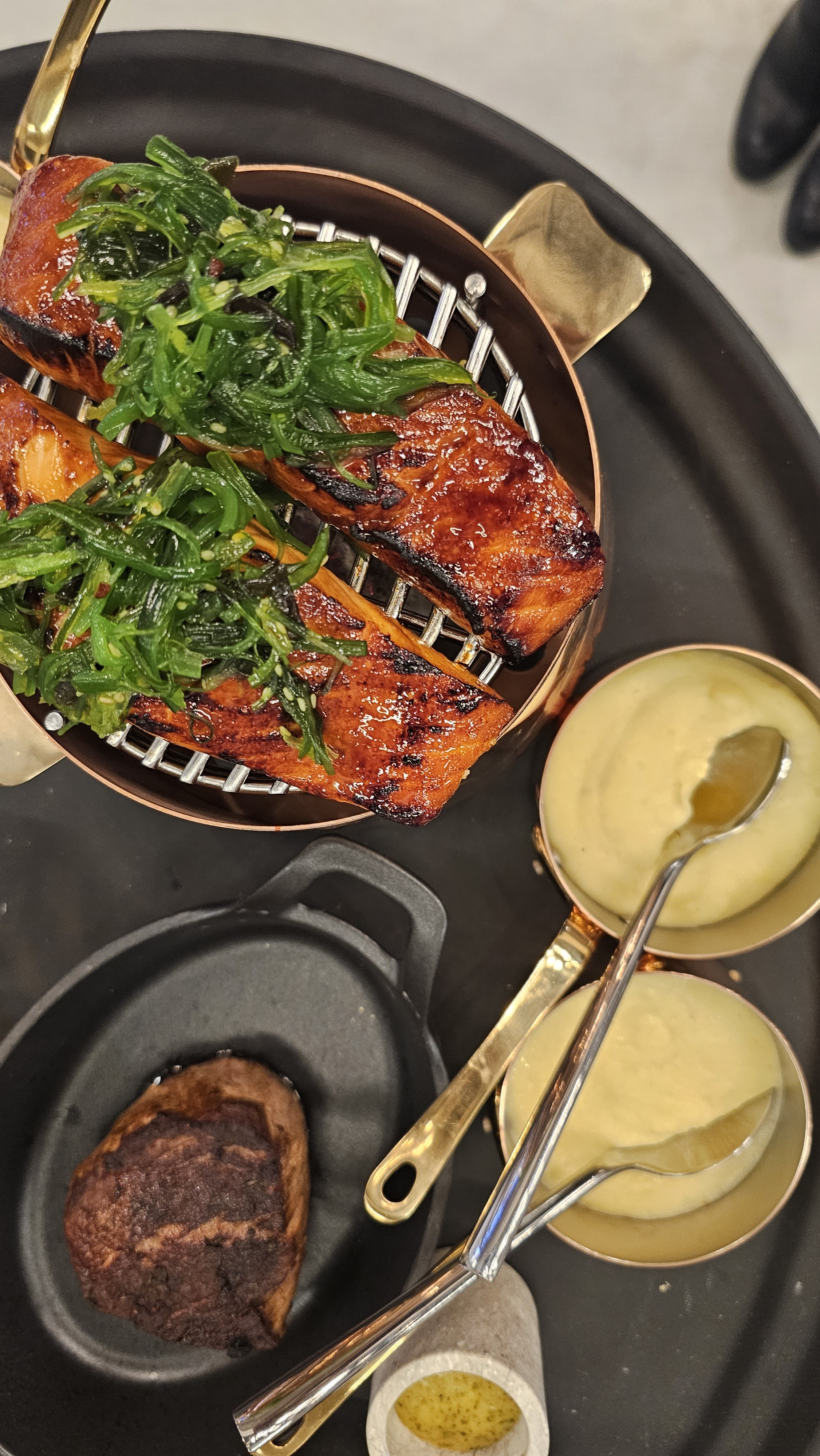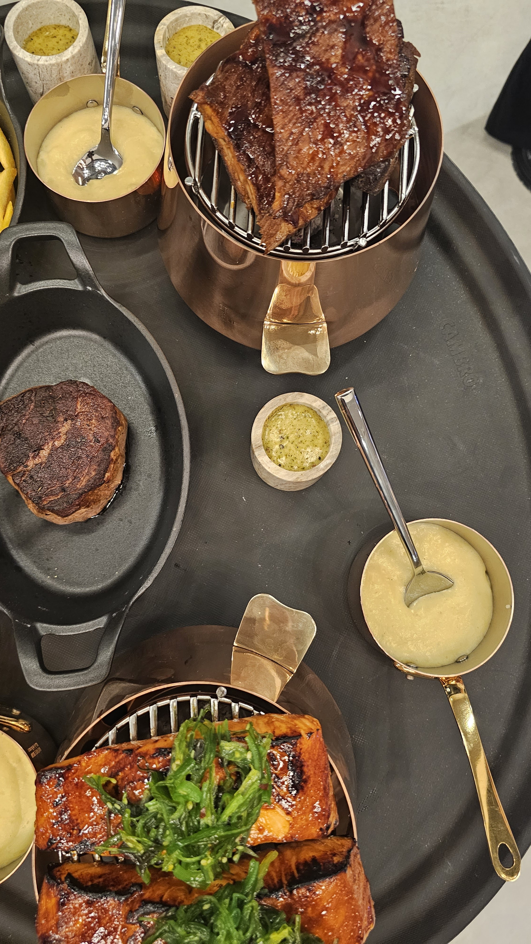 Bel espace, bonne décoration et calme. Tables séparées pour être à l'aise. Excellente viande et très bon saumon également. Des accompagnements délicieux. Desserts, assurez-vous de les essayer. Le service attentif et sympathique.