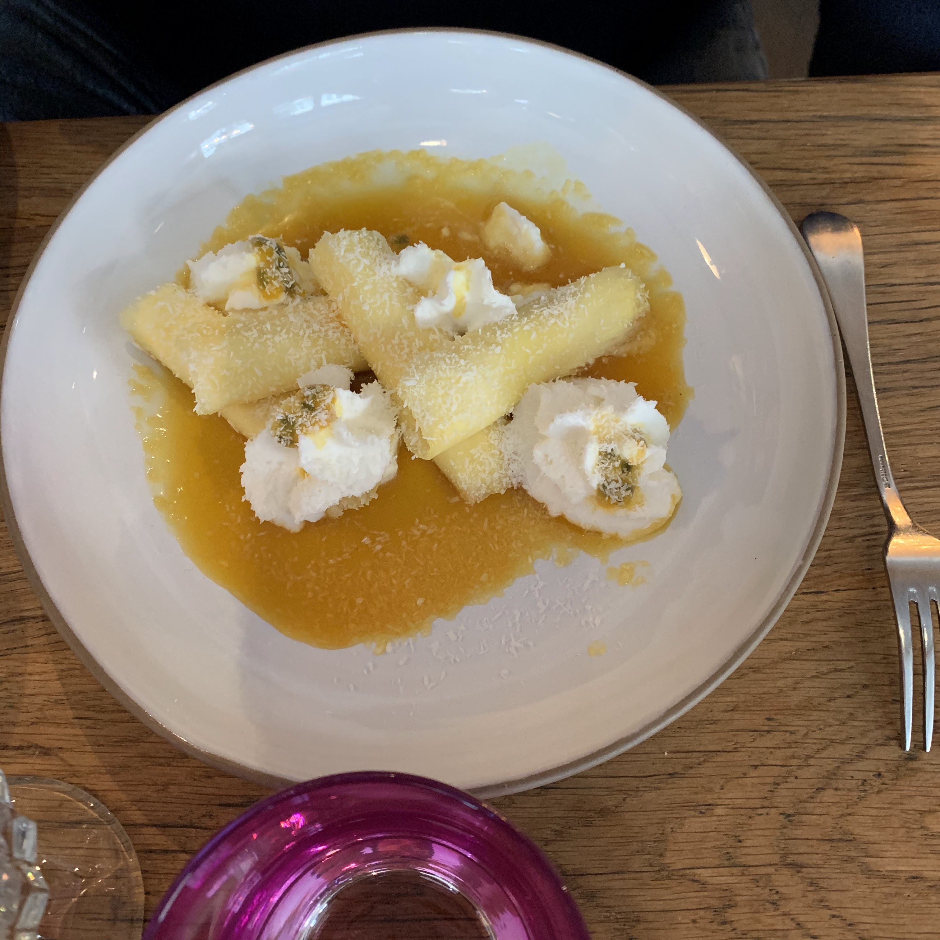 La terrasse et la salle ouverte sont colorees et acueillantes. La cuisine inventive et raffinée ce qu il faut! jolies assiettes appétissantes, fusion mais pas trop Et Pavlova pour finir et beaute et en légèreté Bravo ,et merci pour ce lieu