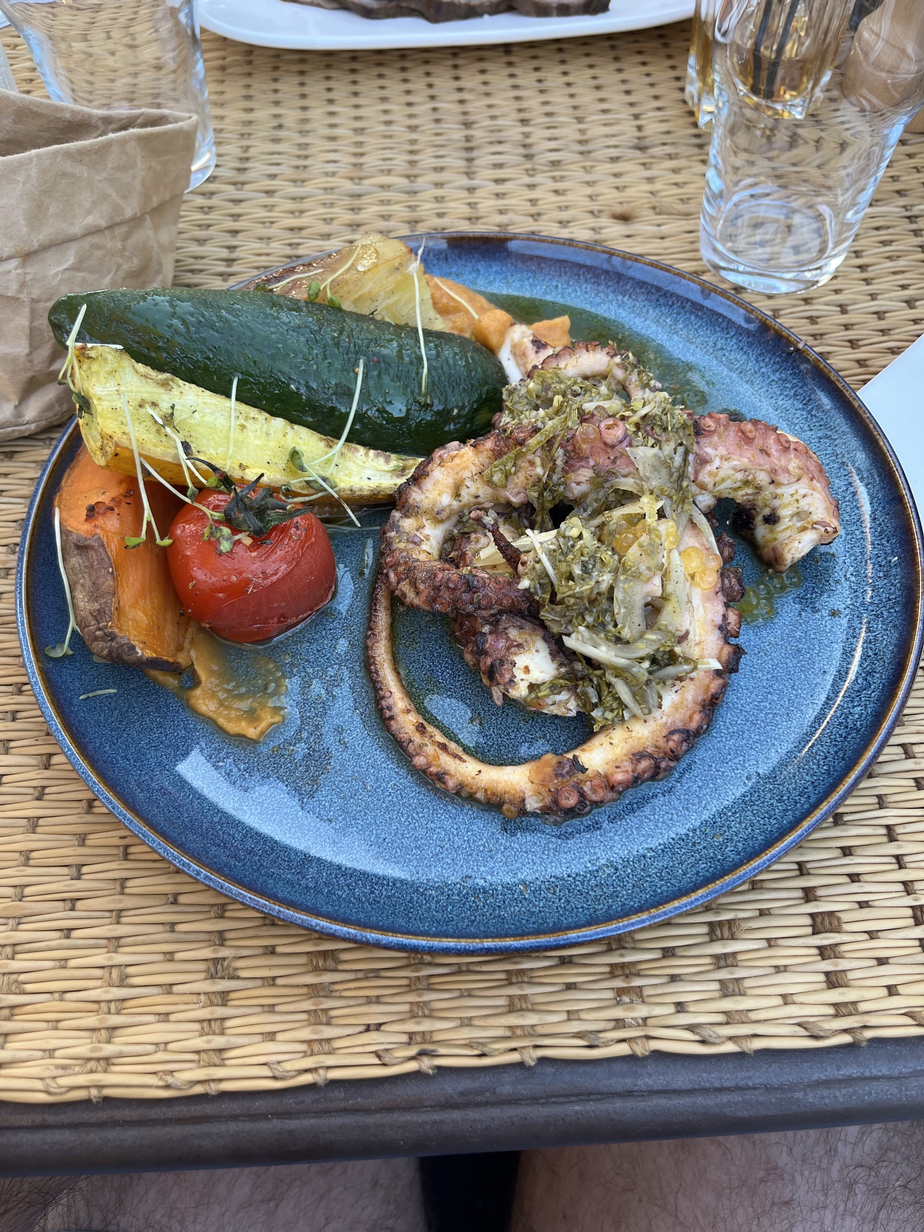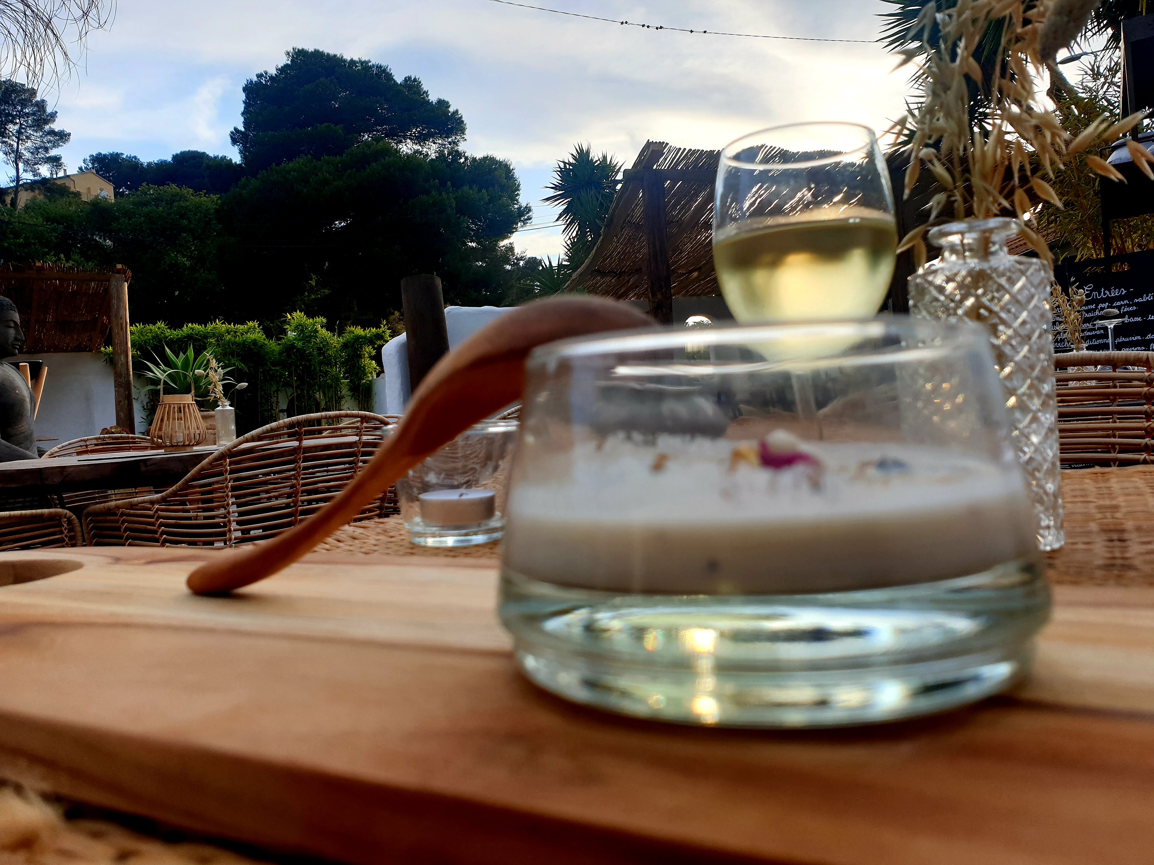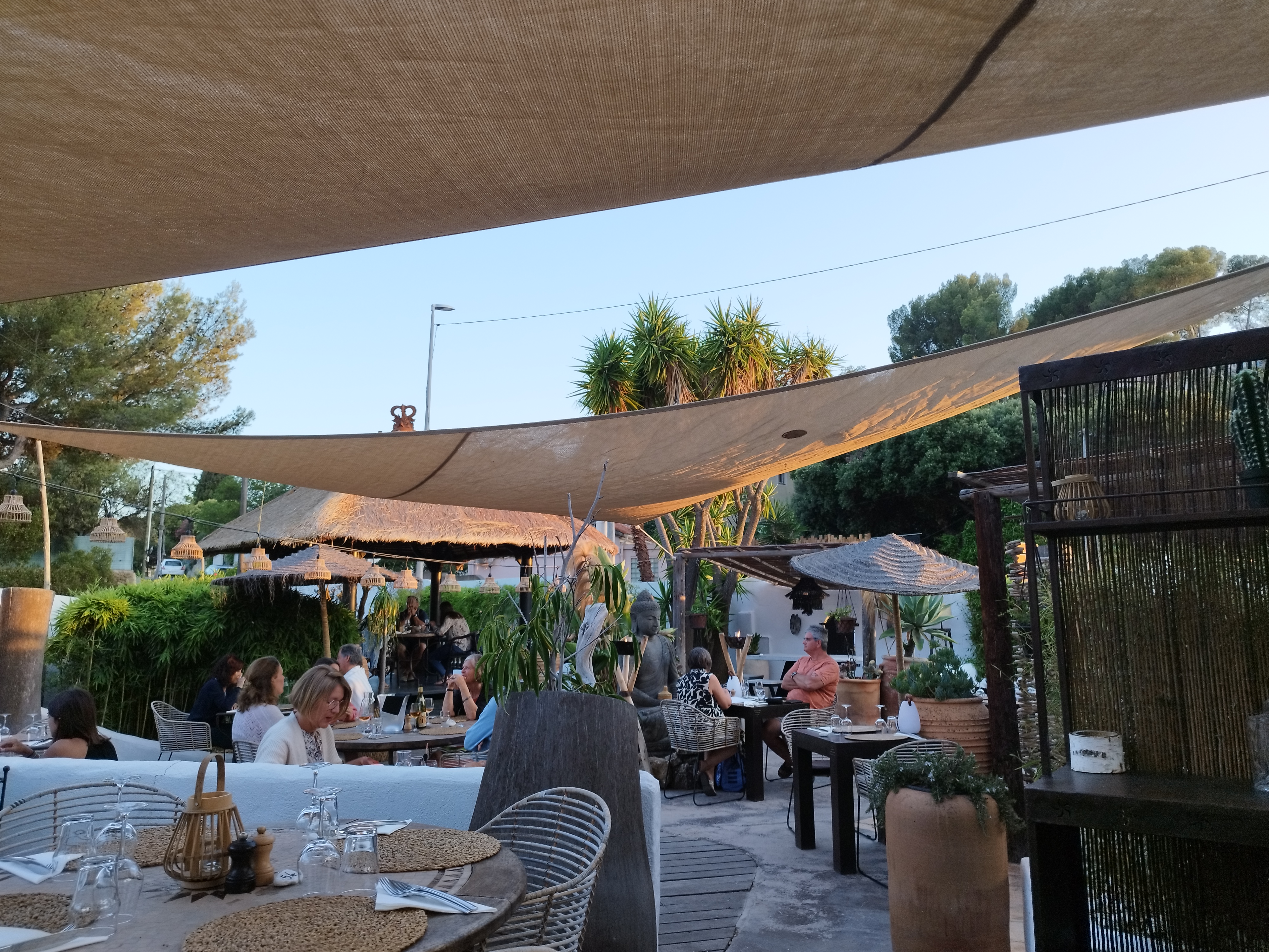 Nouveau concept très chic. Apéro sur les restanques très agréables avec une déco style grecque. Un décor qui fait voyager entre l'Indonésie, l'Afrique et la Grèce. Repas de qualité. Je le recommande fortement. Surtout en amoureux