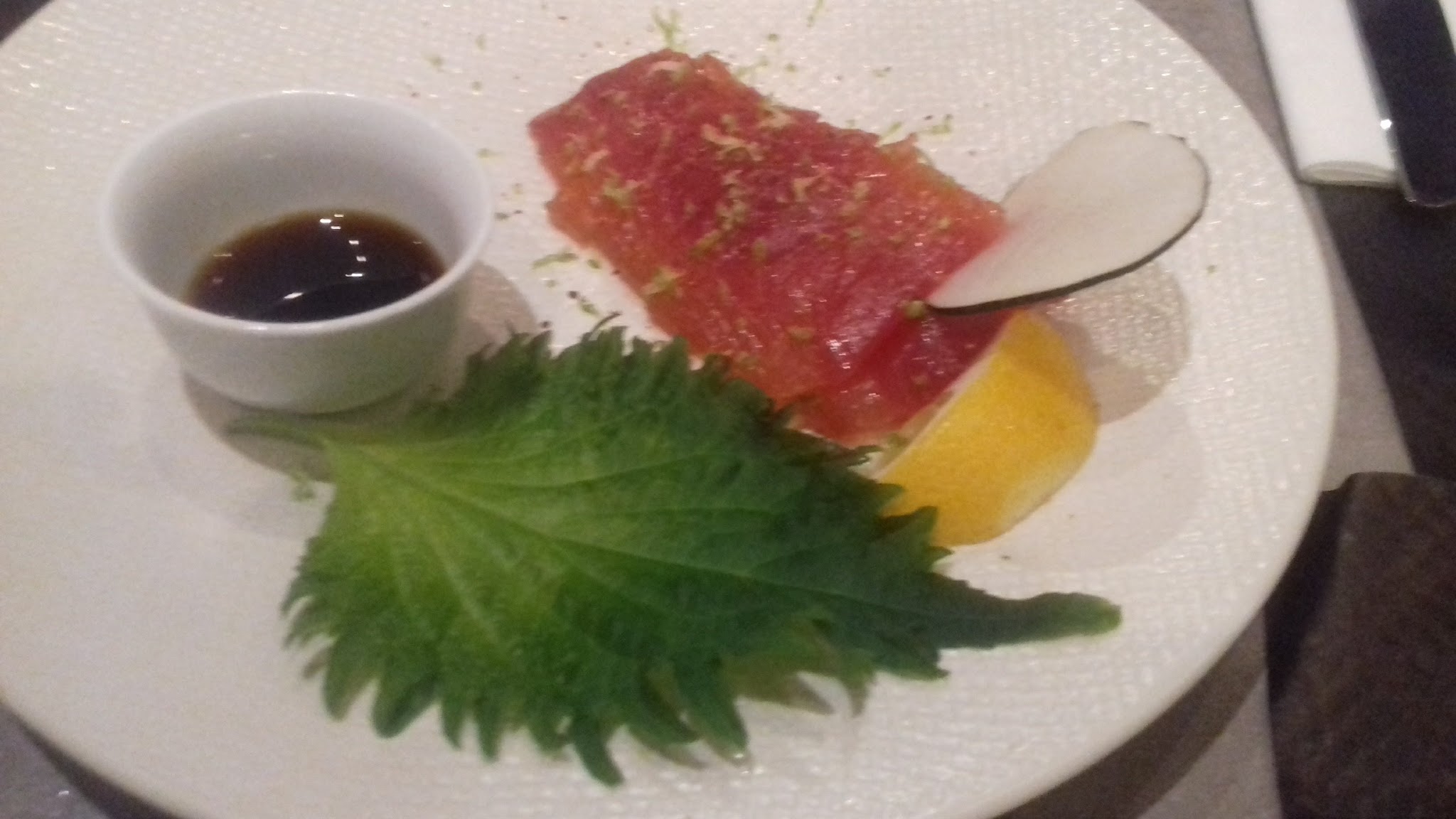 Gravlax de saumon tataki de boeuf crème yuzu. Dans l'assiette tout est fin tout est beau. Mais la qualité a un prix