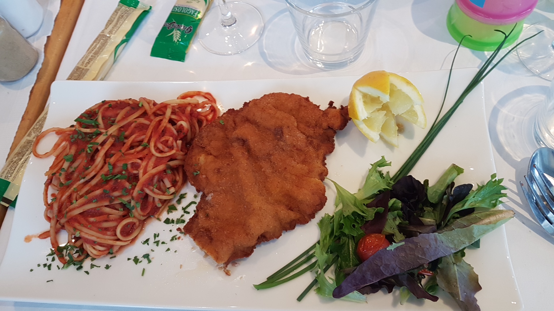 Bon service excellent emplacement. Pas assez de sauce sur les pâtes donc un peu sèches. Le veau milanais était un peu trop cuit.