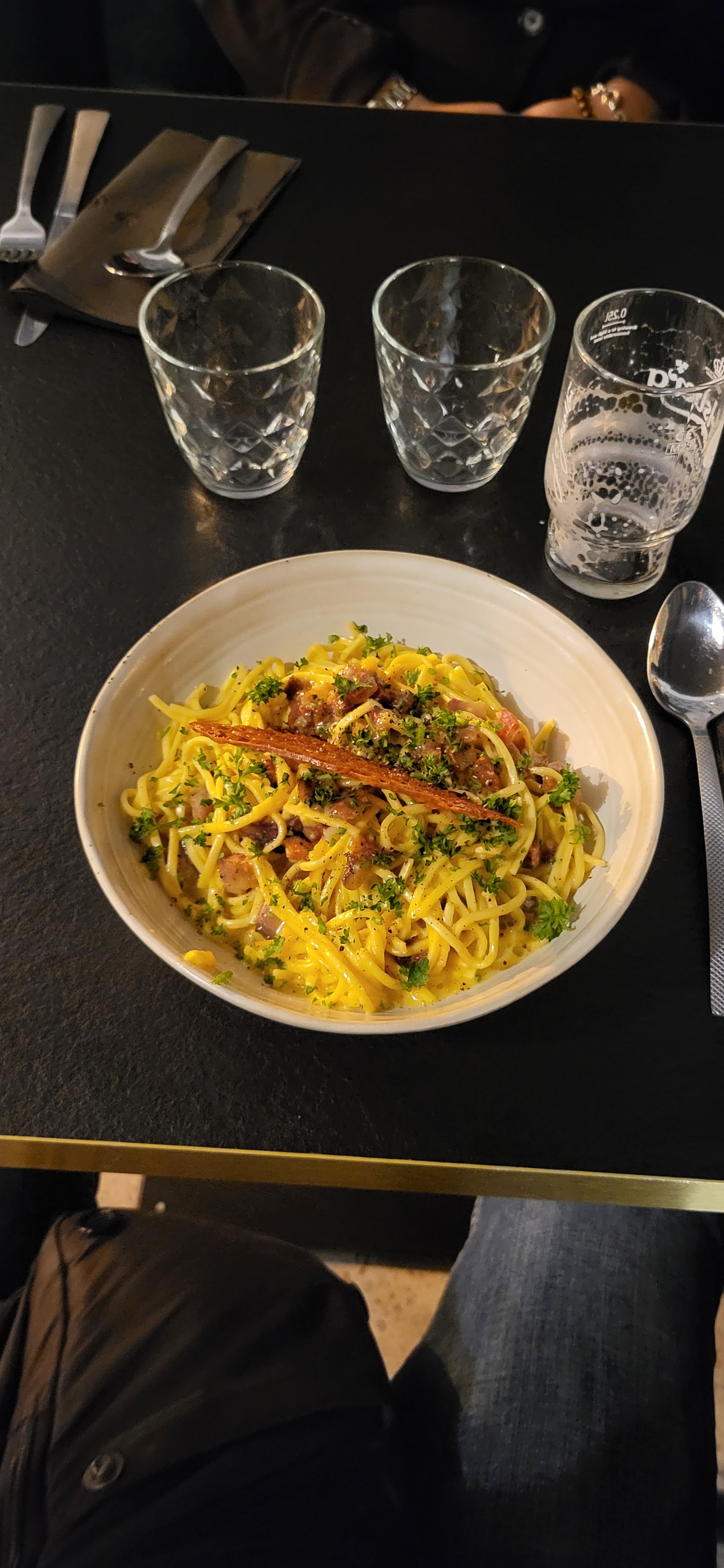 Quelle déception... Personnel incompétent et cuisine moyenne... Nous sommes arrivés à 21h15. La serveuse nous amène une carafe d'eau au bout de 30 minutes mais pas de verres. Une heure plus tard, on nous annonce une panne d'imprimante (?) qui expliquerait soit disant le retard... Quelle surprise se fut quand la serveuse nous a demandé si nous avions reçu notre entrée ! Nous avons répondu que non et elle avait l'air étonnée ! 1h15 après notre arrivée (à 22h30 donc), nous recevons enfin notre entrée. Un gravalax de saumon très bon. Puis place au plat : pâtes à la sauce tomate, ail et buratta. La serveuse nous dit qu'elle va également nous apporter des cuillères à soupe, du parmesan et du pain... Autant vous dire que si nous avions attendu cela pour commencer à manger, nos plats auraient eu 10 fois le temps de refroidir. Le plat en lui même n'avait rien d'exceptionnel : pas d'assaisonnement à part les morceaux d'ail, pâtes encore dures... Par dessus tout, nous avons eu la désagréable impression d'être totalement délaissé au profit de tables plus grosses qui consommaient plus que nous. Aucun geste commercial et presque aucune excuse.