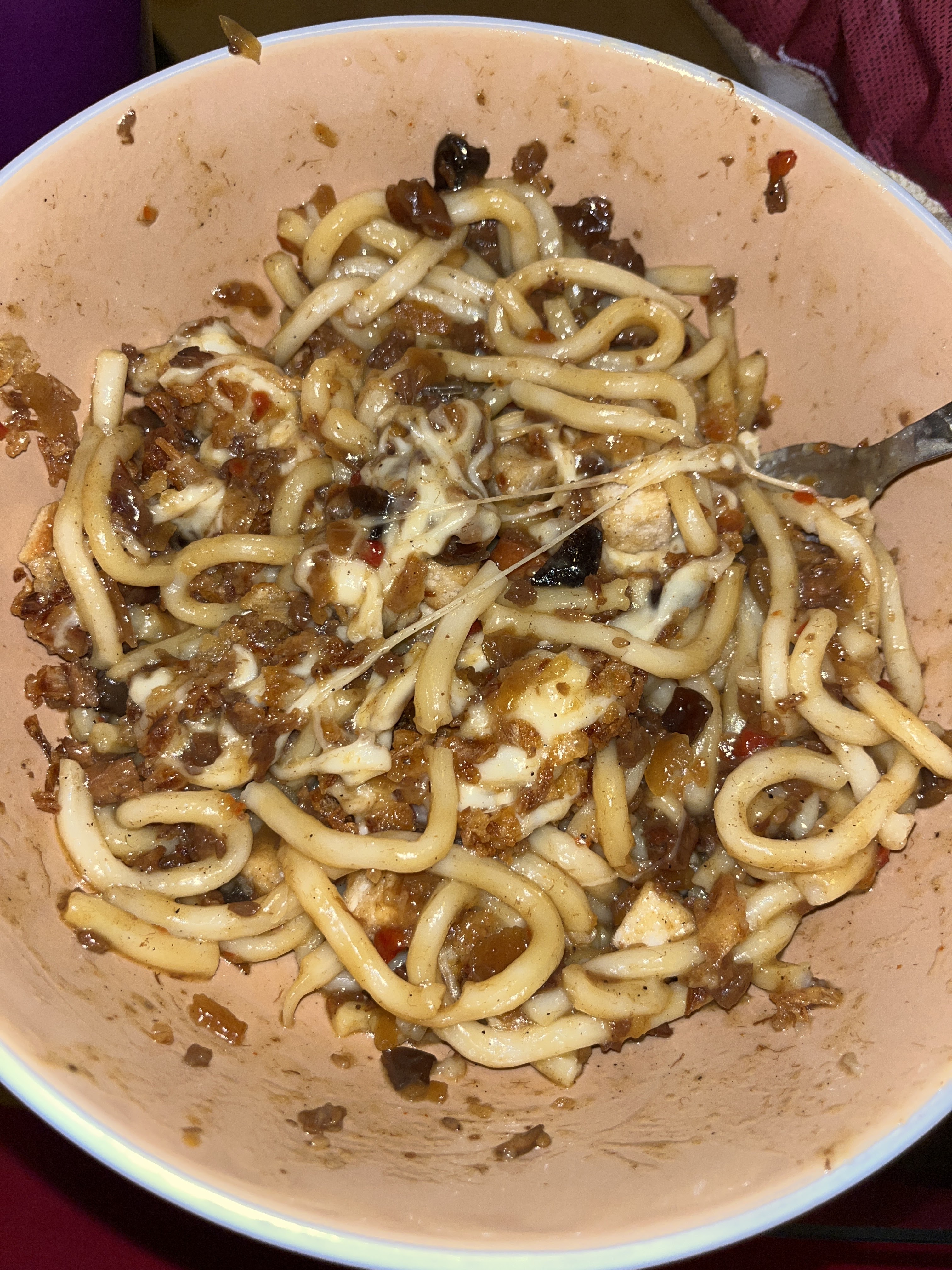 Les pâtes UDON avec sauce Pékin une dinguerie , oignon frit et croûtons ! Je recommande !!!