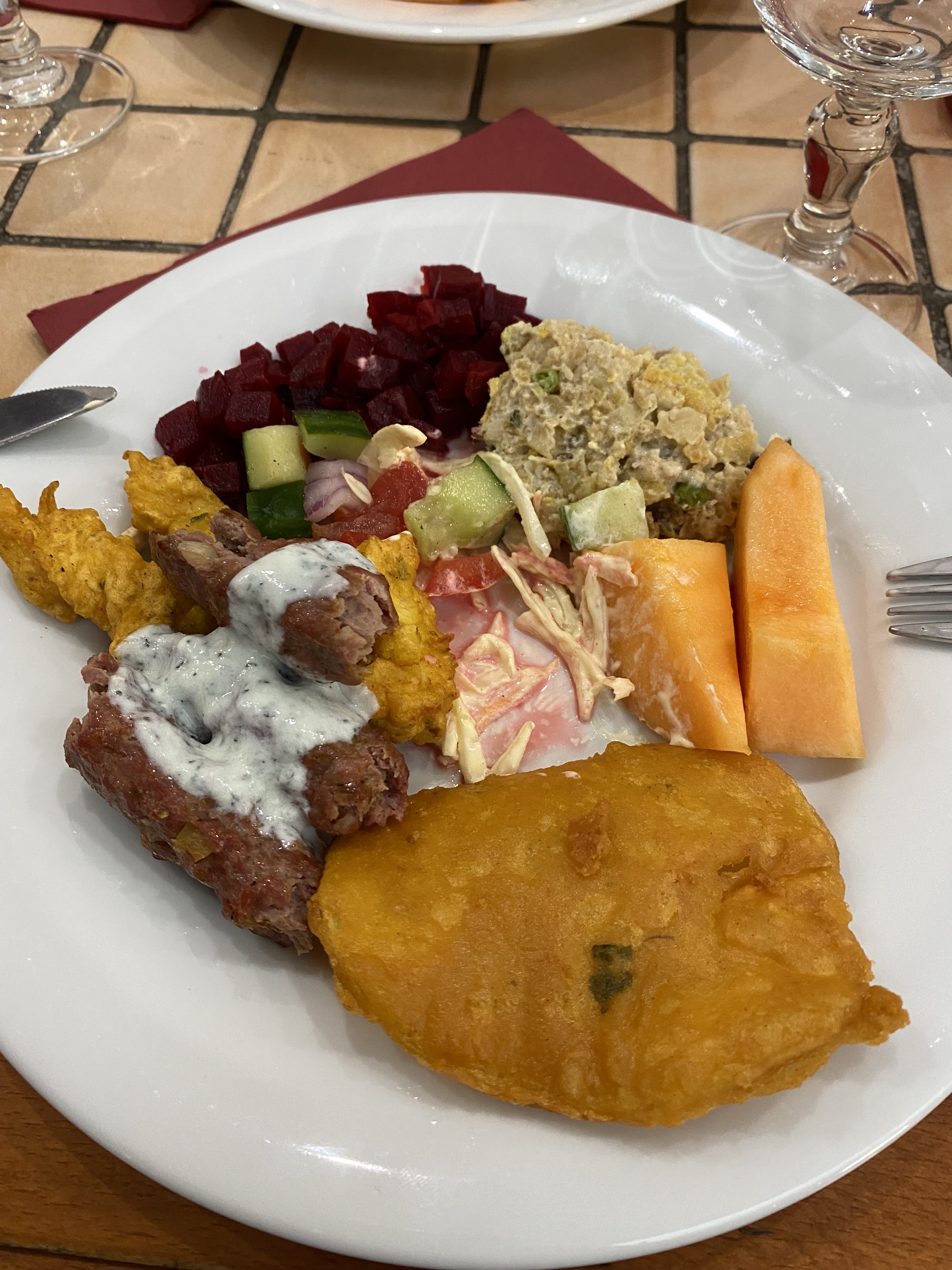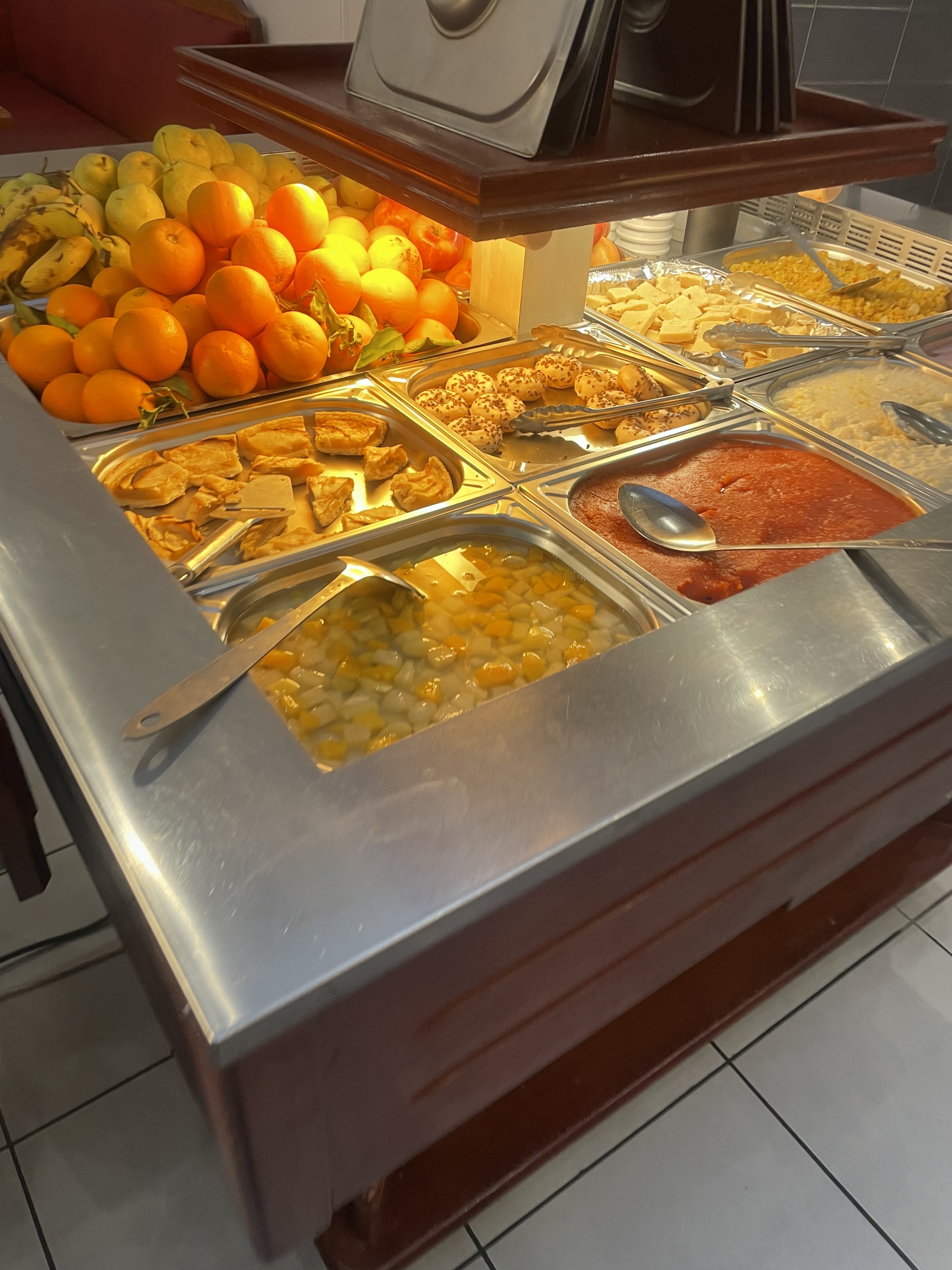 Accueil et service très agréable! Le personnel est souriant et disponible. La salle est grande et propre . Pour ce qui est de la cuisine , le choix du buffet est suffisant ainsi que celui des sauces ; nous avons préféré les beignets , kebab et salades plutôt que plats chauds et desserts que nous avons trouvé trop sucrés.