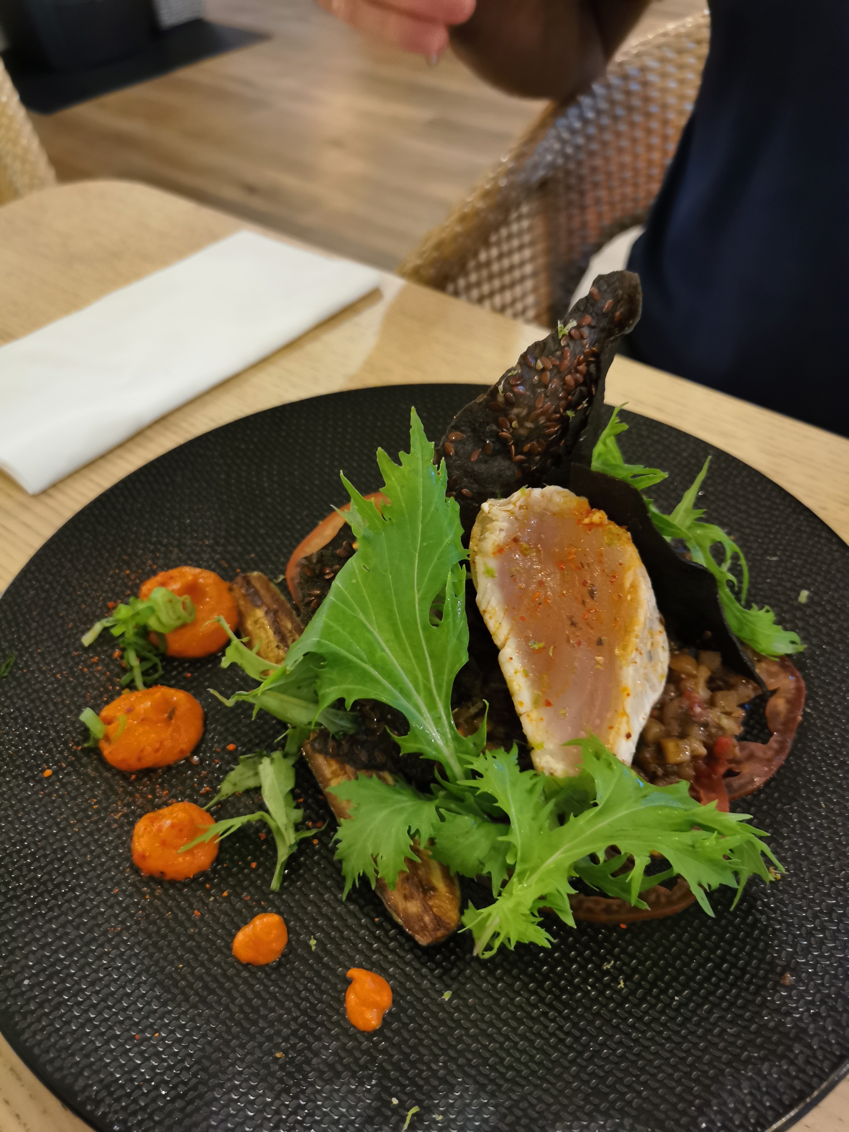 On y a déjeuné à midi, d'où les 3 étoiles pour l'ambiance ! Autrement les plats sont élaborés, produits frais, merci pour la délicate attention pour mes allergies alimentaires. Je recommande !
