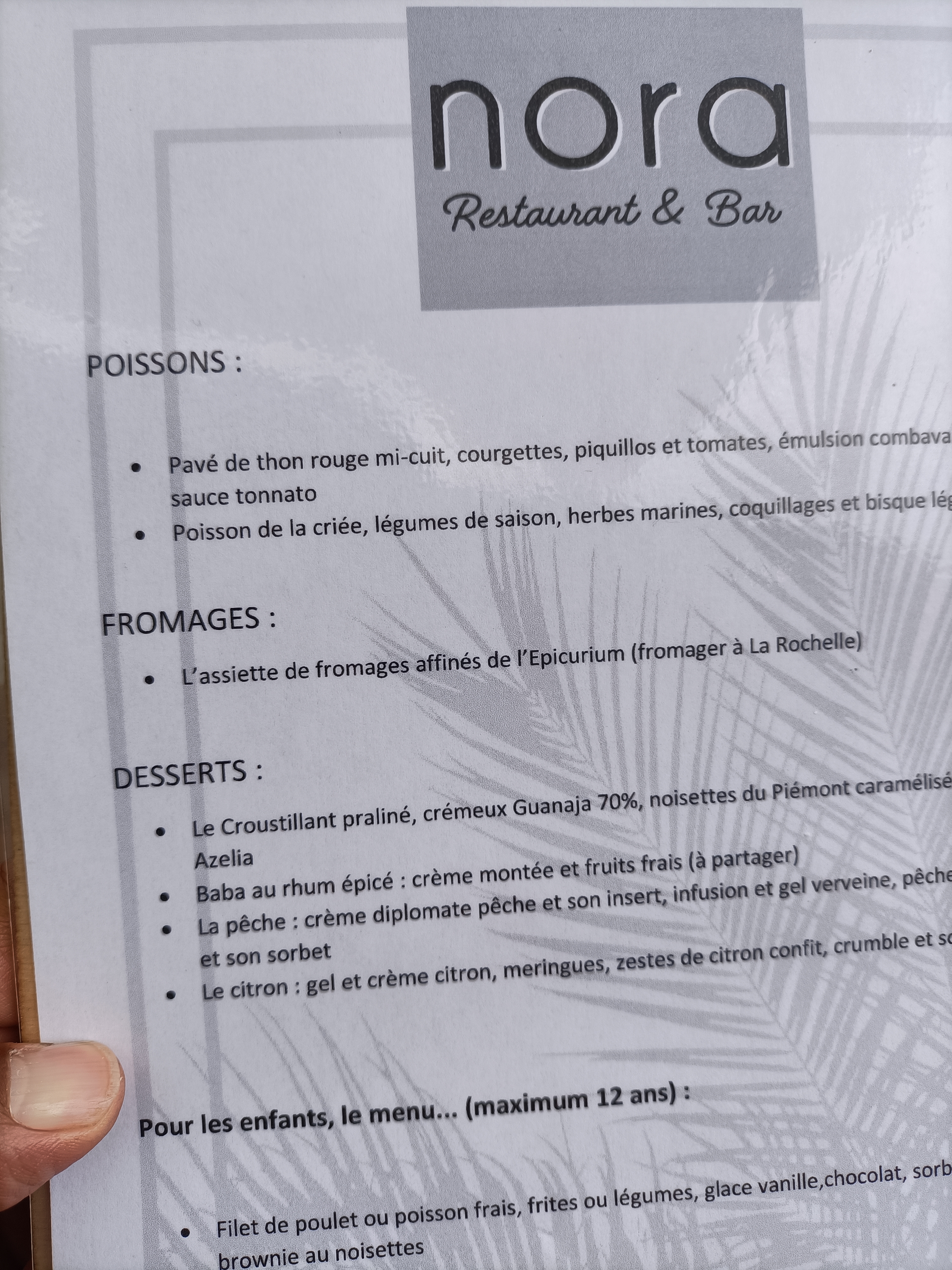 Chez Nora vous trouverez une cuisine raffinée, de saison, et surtout delicieuse!! et je ne parle même pas du service de qualité ! Pour les enfants , ils proposent jusque 12ans un menu avec poulet ou poisson, frites (maison) ou légumes! Bref il y en a pour tout le monde et on adore !