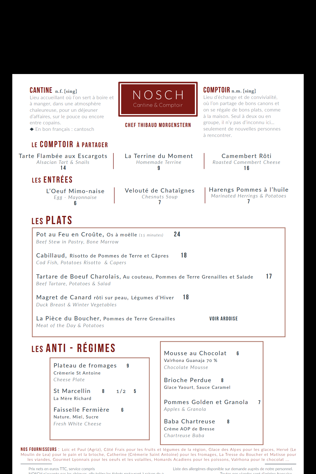 Nosch c'est le lieu idéal pour venir passer un bon moment entre amis. La cuisine est simple : produits frais de saison très bien cuisinés. Service impeccable, conseils pour le choix des vins remarquable. Portions généreuses, amis sympathique. Vous n'avez aucune chance d'être déçus. L'os à moelle est un délice !