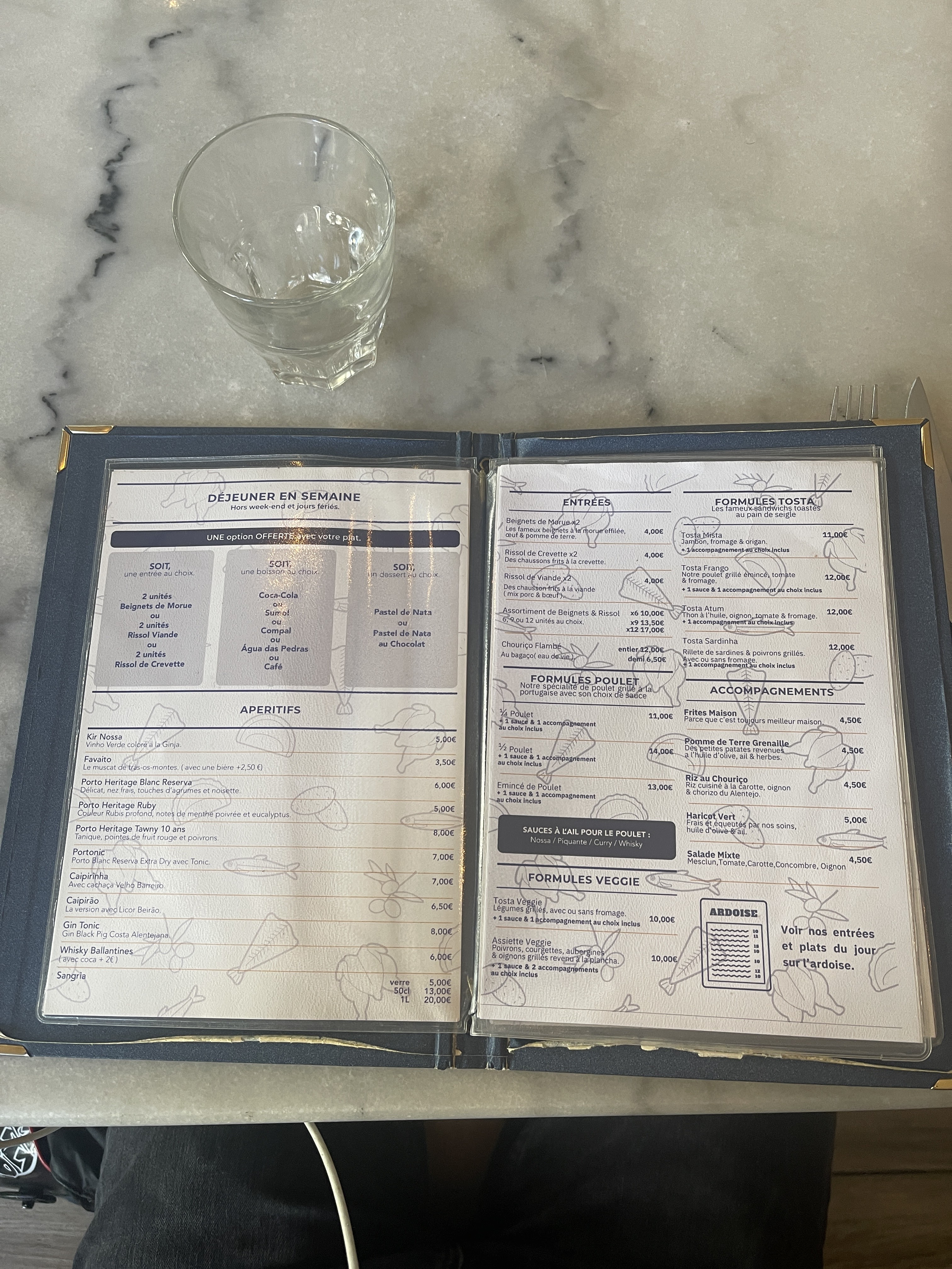 Très bon accueil. Une serveuse adorable et tout le personnel est souriant et efficace. Les plats beignets, poulet, gratin de morue étaient délicieux et la sangria pétillante avec de vrai orange accompagnait très bien. Juste été surprise de la mini quantité d'un apéro choisi au hasard, le Porto 10ans, excellent mais se savoure par toute petite gorgée. Là réduction des yums était bienvenue. Pas de photos cette fois-ci, on a été trop gourmand ☺️😋
