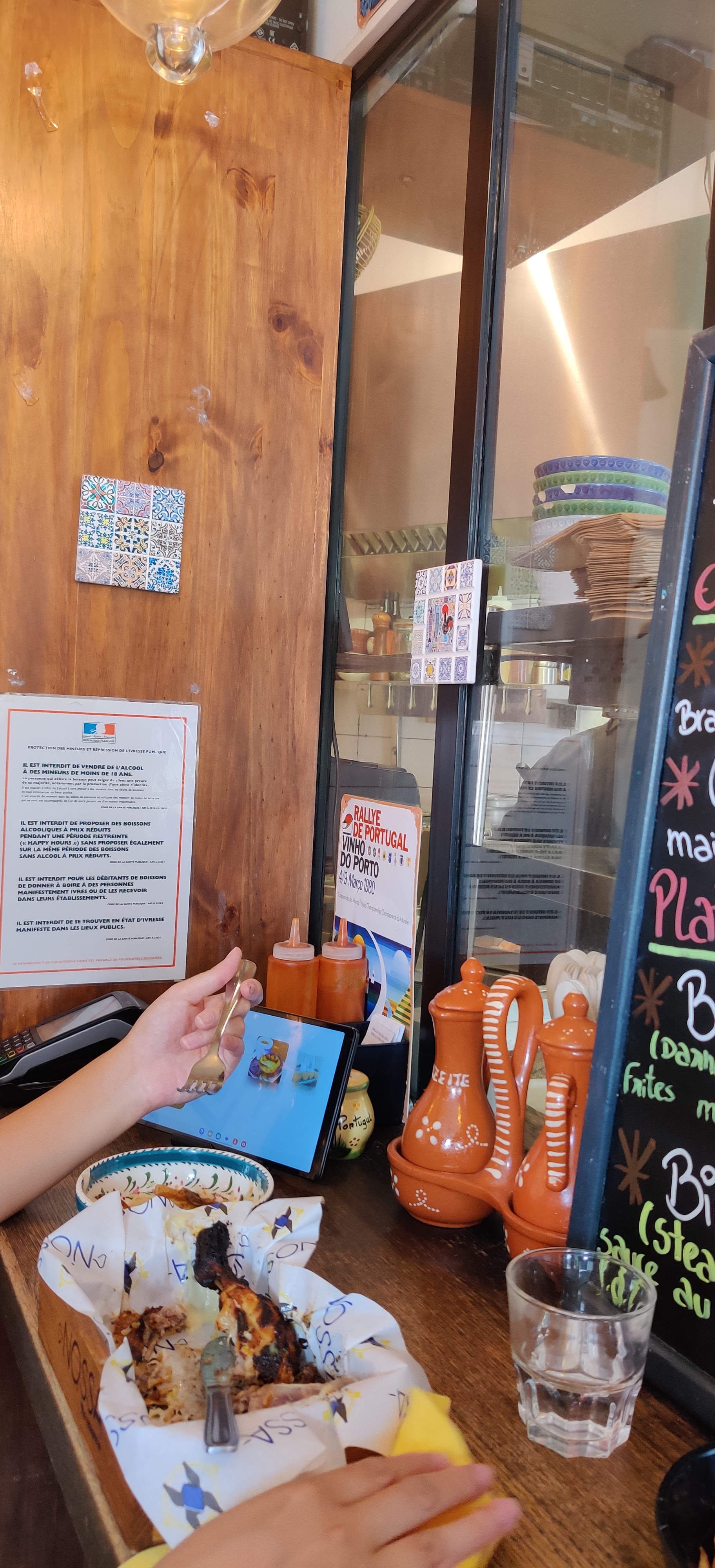 -Plats : j'ai pris du poulet (1/4) et du riz chorizo carotte. Au premier abord, très déçu d avoir du blanc que je n'aime pas trop car souvent très sec. Et bien pas du tout, le blanc avait très bon goût et était très tendre. La sauce piquante par contre n'était pas assez relevé à mon goût. Concernant les pastei de nata, c'est les meilleurs que j'ai mangé dans ma vie. -rapport qualité prix : très correcte. Je vous conseille le demi poulet plutôt que le quart -service : accueillant et de bons conseils -cadre : plongé au Portugal. Attention, le restaurant est cependant très petit et si vous n'arrivez pas en avance, vous risquez d'avoir de l attente.