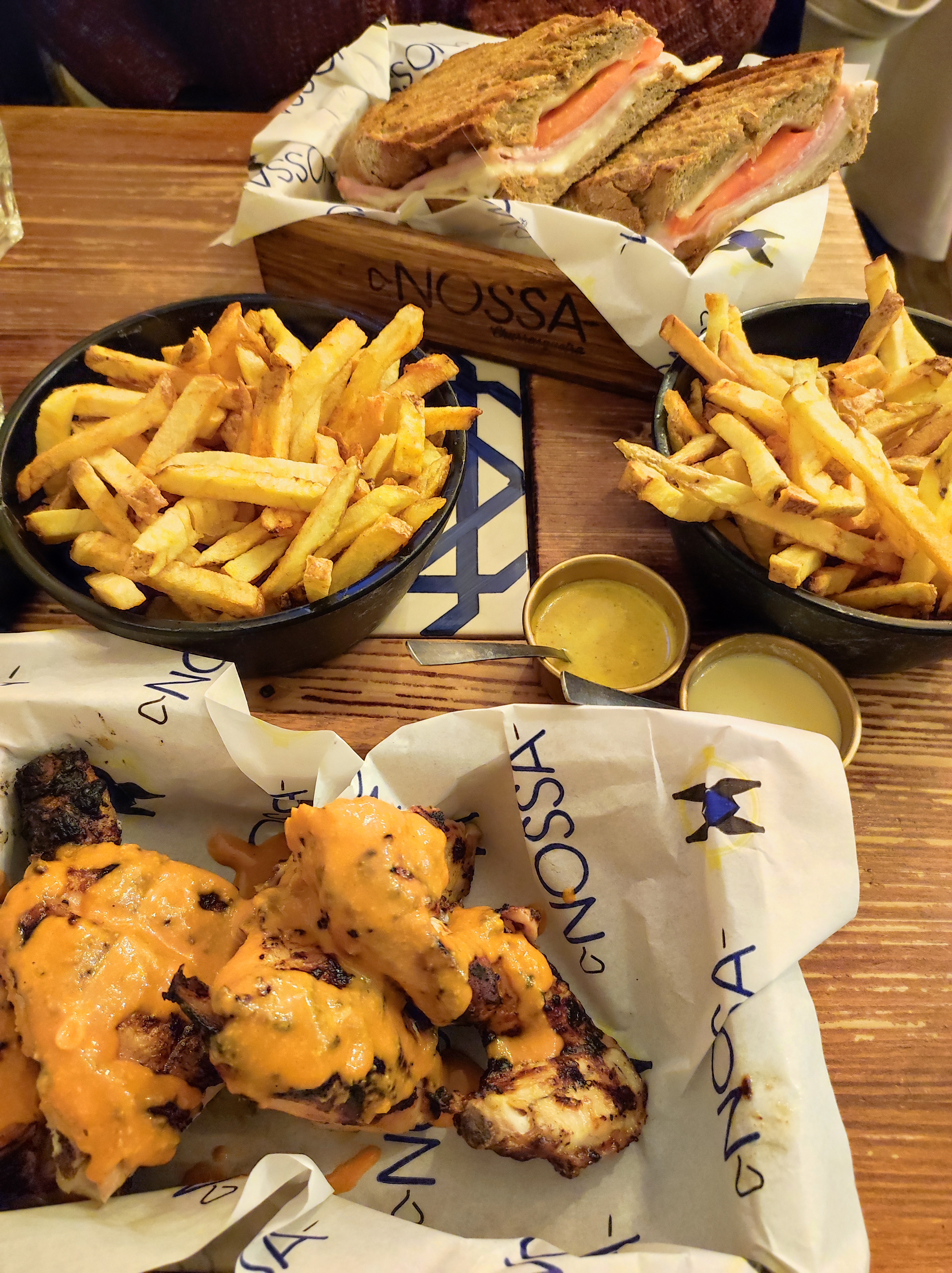 Bon resto mais pas non plus exceptionnel. La formule déjeuner (plat + entrée/boisson/pastel de nata + accompagnement pour le prix du plat principal) est très avantageuse. Mes beignets crevette étaient bien frits et pas huileux; la tosta de frango (sandwich au fromage, tomates et poulet) était bien croustillante mais il manquait une sauce plus riche et crémeuse pour lier les ingrédients. La sauce Nossa à l'ail était un peu trop liquide et concentrée à mon goût. Les pasteis de nata, petits flans aux œufs légèrement caramélisés avec leur pâte feuilletée, étaient comme au Portugal. Le service est impeccable et les serveurs très amicaux.