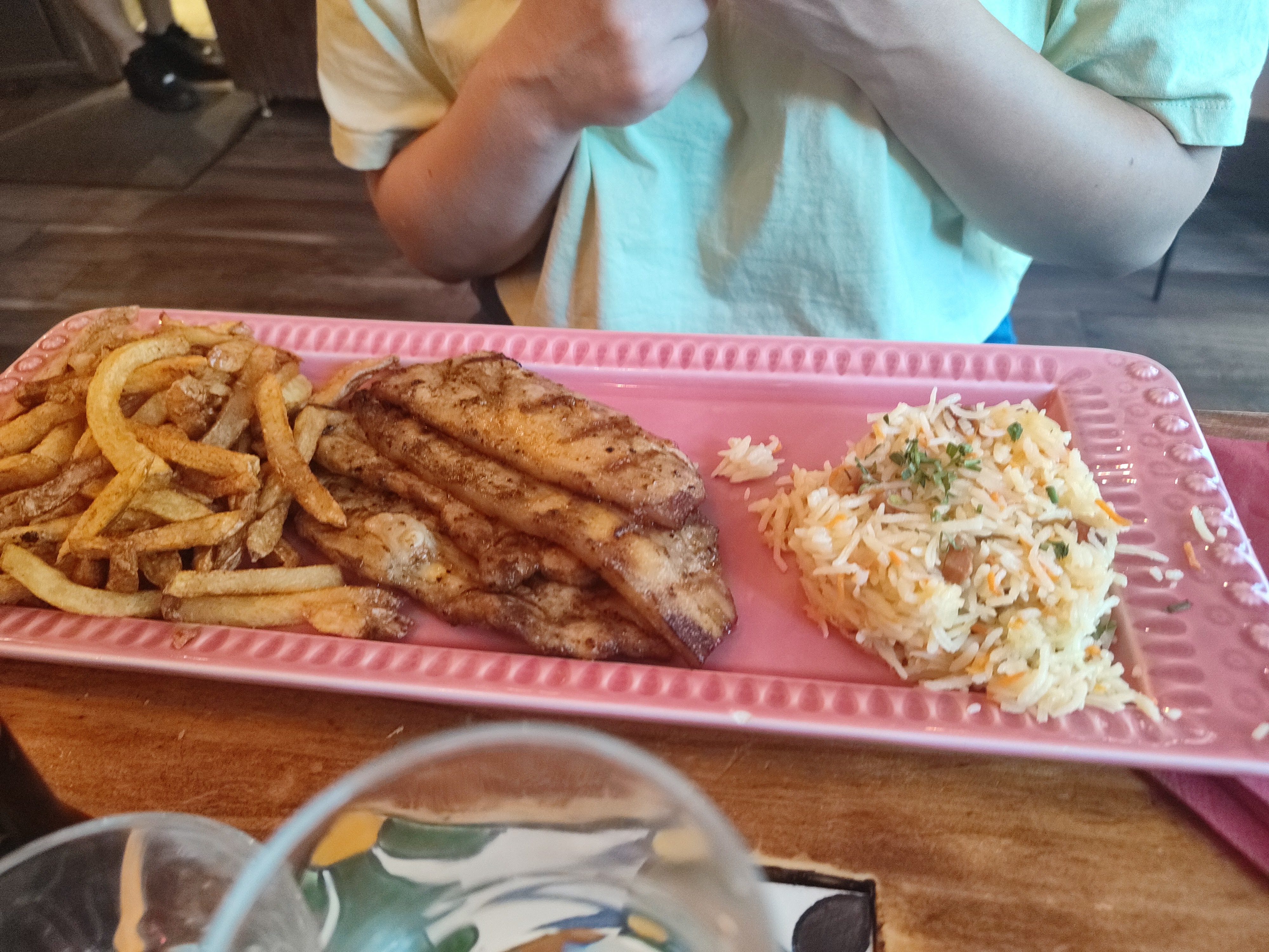 En plus de nos commandes (pour moi et ma femme), nous avons demandé 1 portion de poulet à partager entre nos 2 jeunes enfants et la serveuse nous a dit « normalement nous n'acceptons pas que les clients partagent l'assiette »… Les boissons ont mal tourné, mais c'était vite corrigé. Le Bacalhau a Bras était très savoureux ! Le poulet était bon mais le service n'était pas très agréable.