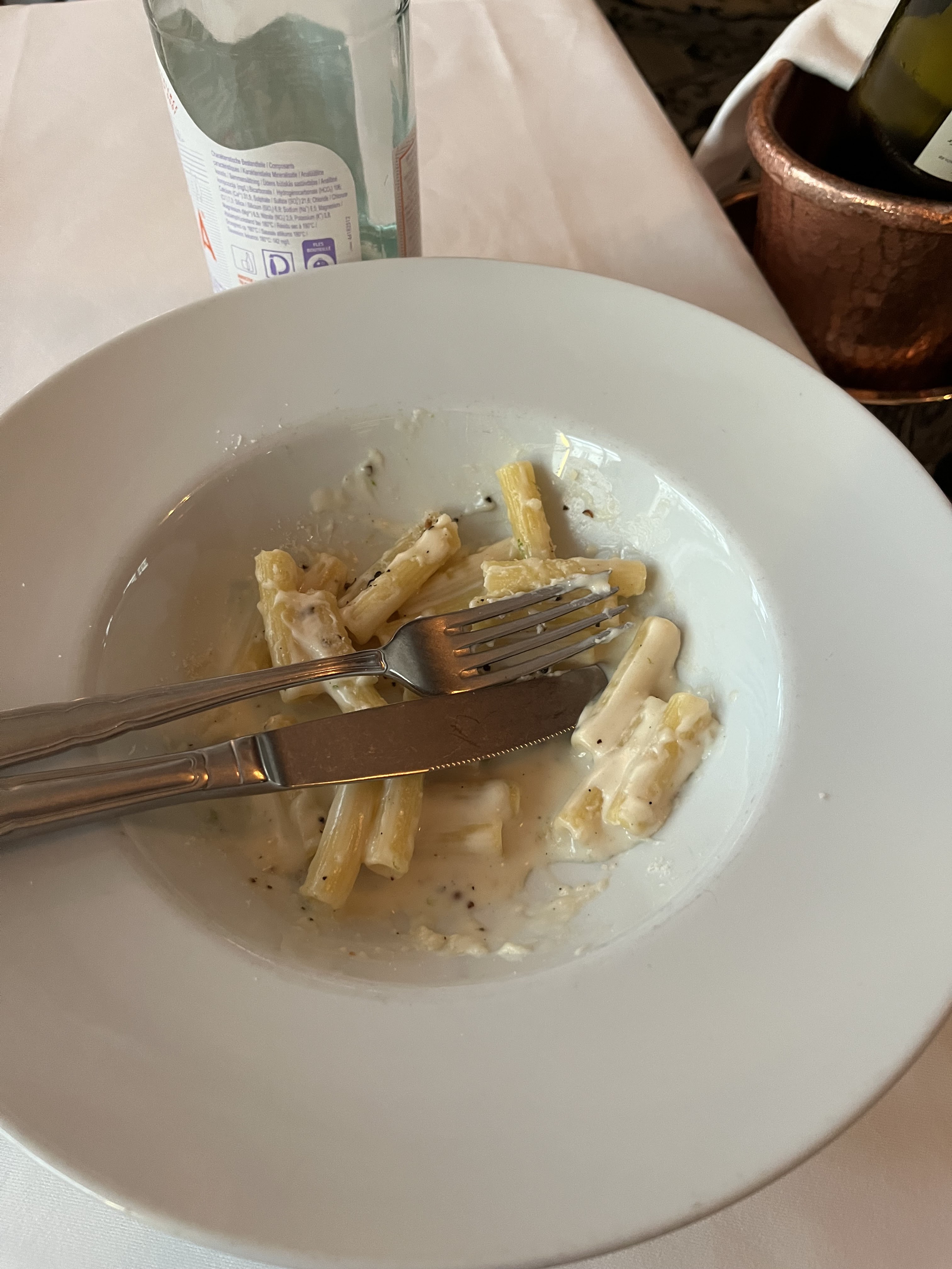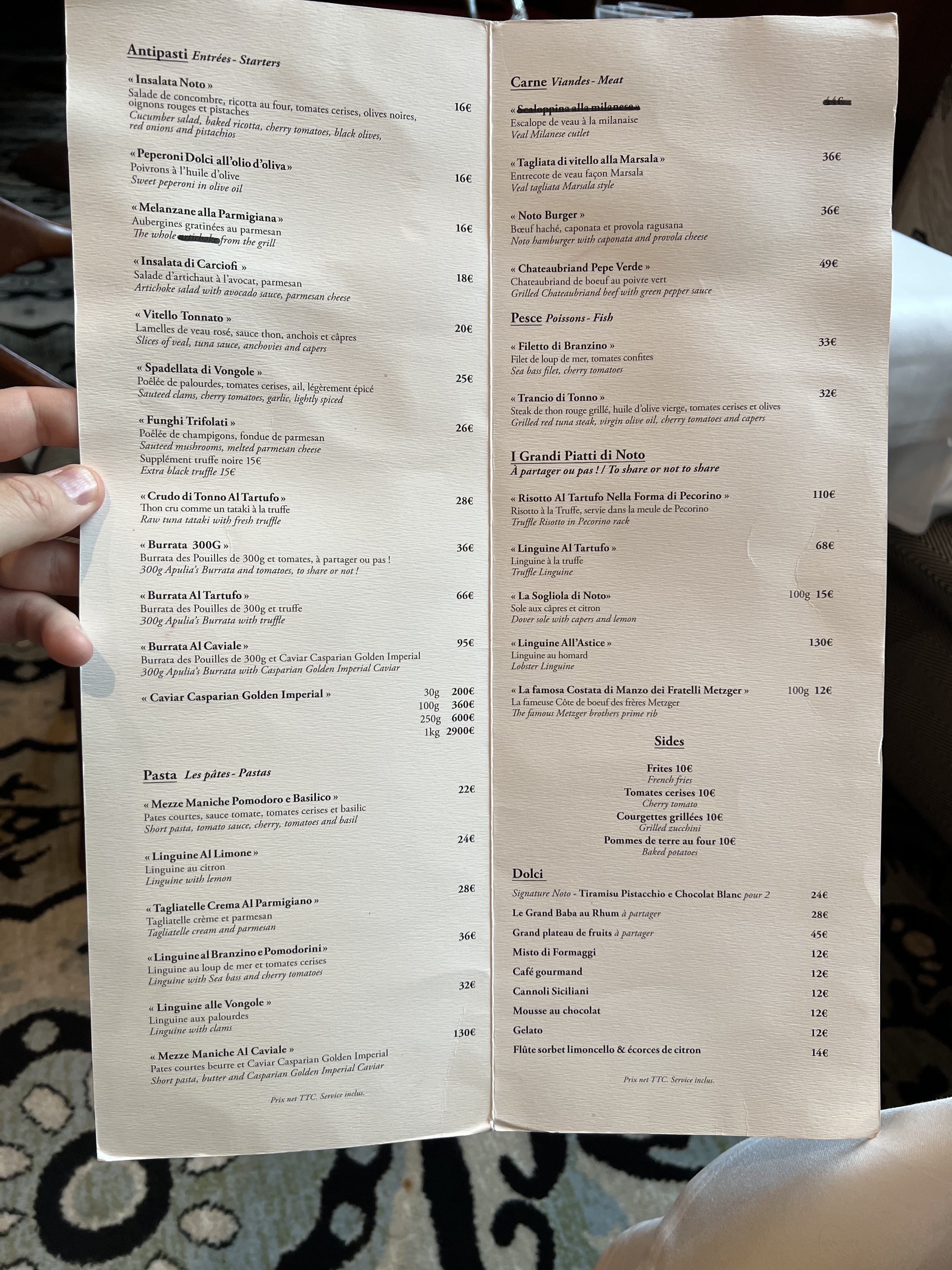 La carte des vins m’a été donné sans la proposer à Madame. Manifestement, la carte n'est plus à jour puisque le serveur nous indique que la bouteille choisie n'est plus disponible... Après sélection d'une nouvelle bouteille (plus onéreuse), le maître d’hotel me fait goûter directement, sans que l'idée de proposer à Madame ne lui effleure l'esprit... S'agissant des plats, le Vitello Tonnato laissait à désirer. Il est en de même pour le plat de pâtes aux palourdes, sans grand intérêt. Enfin, le dessert demandé n'était là encore, plus disponible. Il nous a alors été proposé un autre dessert, plus cher, pour notre plus grand bonheur. Finalement, constat d'un restaurant surfant sur sa réputation et n'assurant pas le service de qualité qu'il affiche pourtant ouvertement.