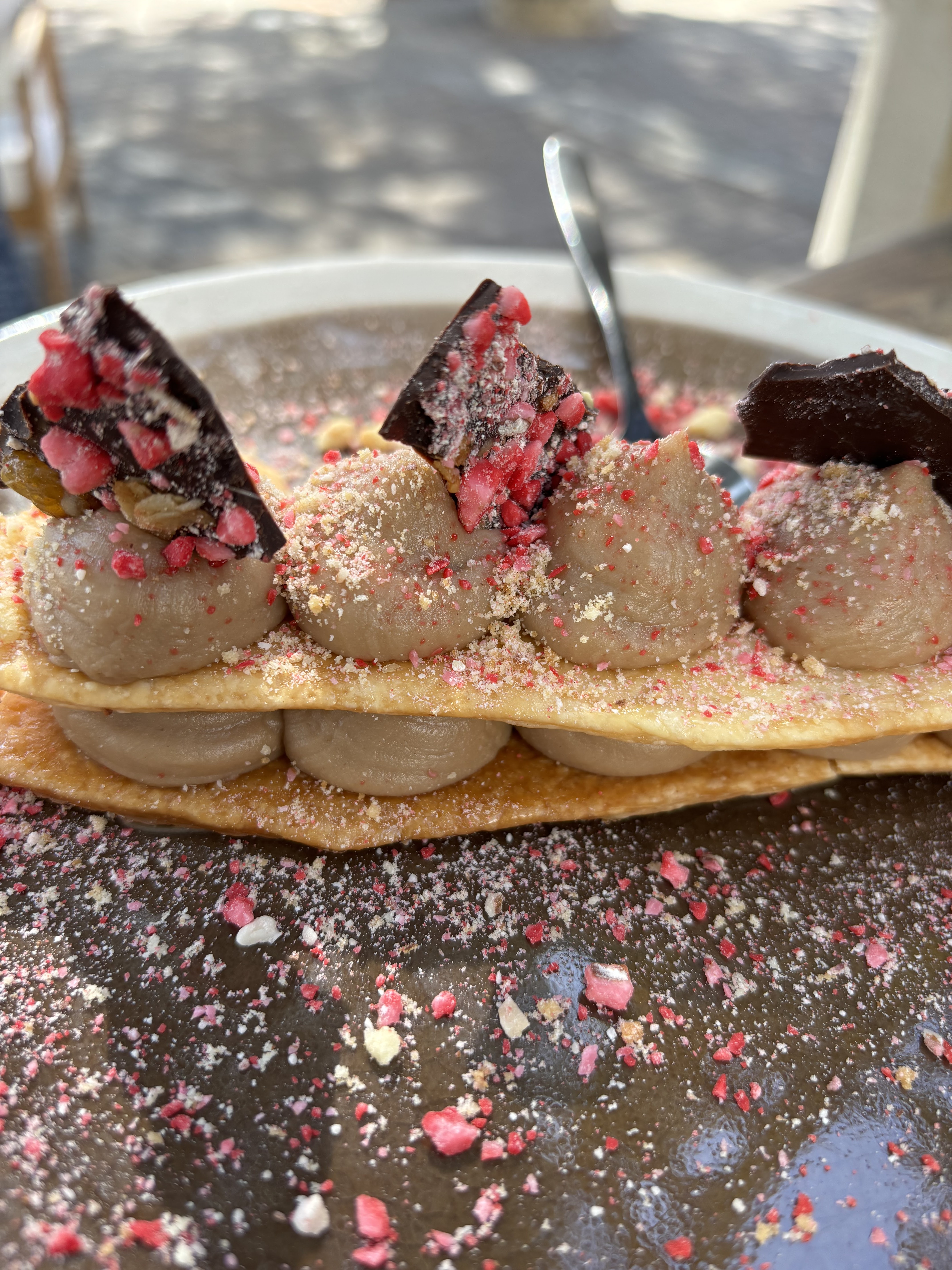 Avis mitigé pour les raisons suivantes: Pas d’amuse-gueules proposés avec l’apéritif, attention aux tables sous les pins qui abritent des tourterelles qui fientent sur nos têtes! (Les terrasses à côté ont toutes des parasols pour éviter le pire), les portions sont minimalistes, la présentation d’ un dessert au chocolat ne donne pas envie, des arrêtes ont été trouvées dans le saumon. La note finale est salée. Le personnel est sympathique par contre et les couvertures proposées sont une bonne idée. Le cadre est sympa et les plats dégustés étaient excellents malgré quelques petites fautes de jeunesse.