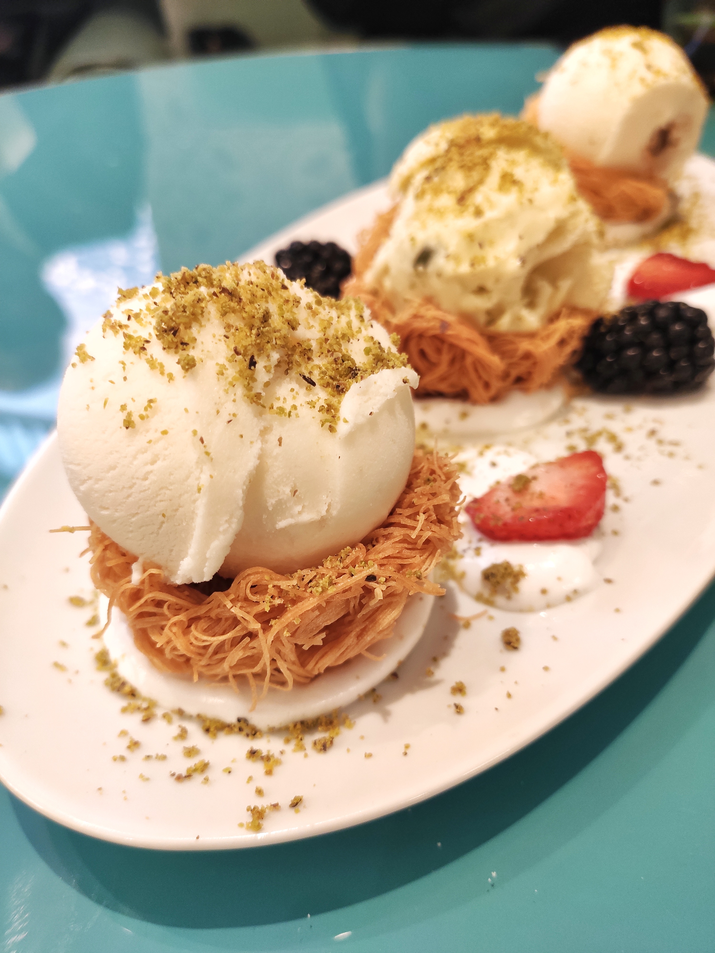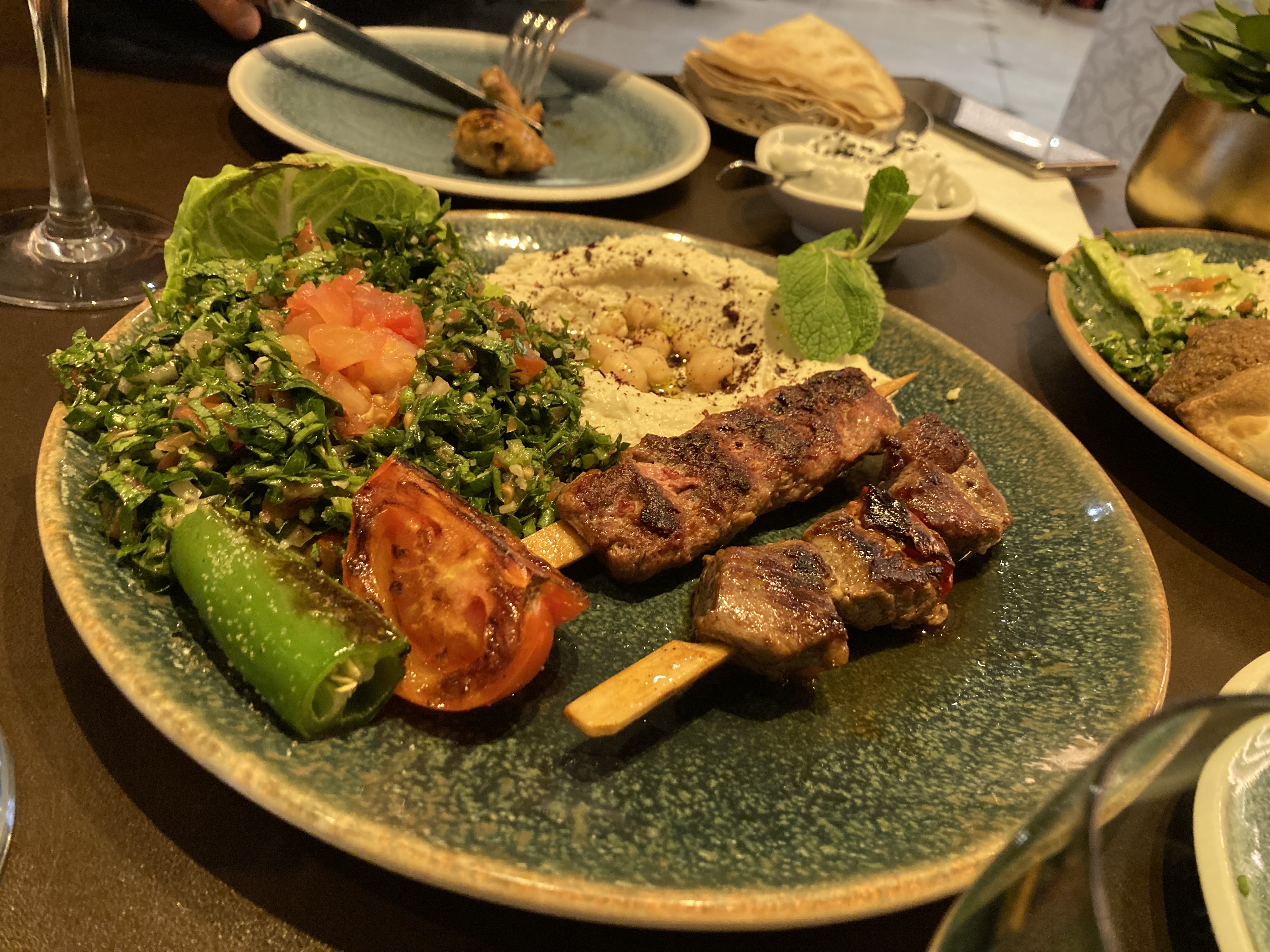 Nous avons passé un moment assez sympa. Nous avons eu l'assiette de mezze royale, le halloumi et le tzatziki pour un déjeuner plus léger, avec un kir royal et une rose de champagne. Après le déjeuner, nous avons dégusté la pistache en sablé accompagnée d'un digestif libanais. Les boissons étaient délicieuses tout autour. La nourriture était bonne, rien de particulièrement remarquable. Le pita était médiocre. Mon préféré était le baba ghanoush - doux, pas fumé, mais plutôt sympa. Le service n'était pas idéal. Ils n'ont pas été particulièrement réactifs malgré une après-midi tranquille et ont semblé un peu vexés de ramener nos menus de dessert. Lorsqu'un de nos menus a été déposé par inadvertance dans un petit déversement de houmous, ils ont été désemparés avant de l'essuyer. Je dois noter que même si le dessert était trop sucré (je ne vous recommande absolument pas de prendre quoi que ce soit avec de la meringue), le vin de dessert, si vous aimez ce genre de chose, a été pour nous une surprise amusante que nous réessayerons. L'ambiance est presque sympa. Mais c’est dans un centre commercial, ce qui est une expérience étrange au départ, et il n’y a pas de fenêtres. Entre les repas, les tables sont aspergées de spray classique anti-COVID, le tout équivalant à une sorte d'expérience neutre.