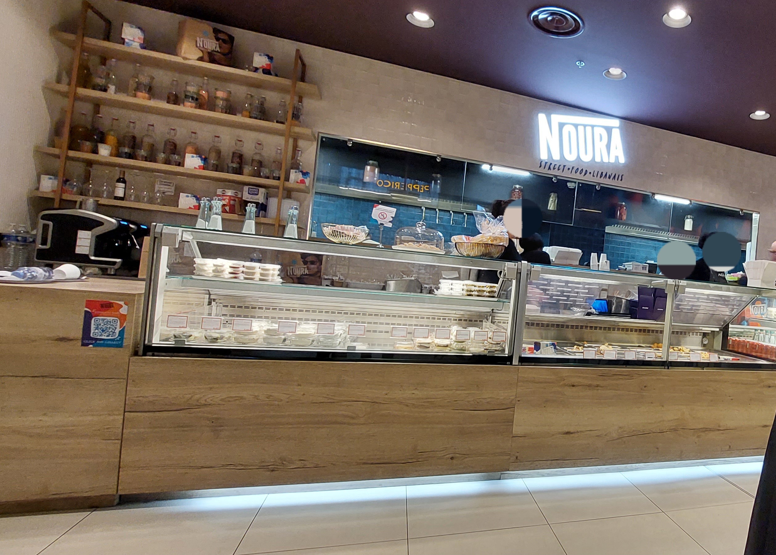 Restaurant en formule ćommandes sur borne .la salle est grande et spacieuse avec le covid de prime zbord peu de monde comme partout a la defense .cela me parait un peu froid mais c est peut etre juste une impression .zone de restauration en travaux ,c est propre et net .noura a ûne reputation serîeuse c est un grand ĺibanais normalement