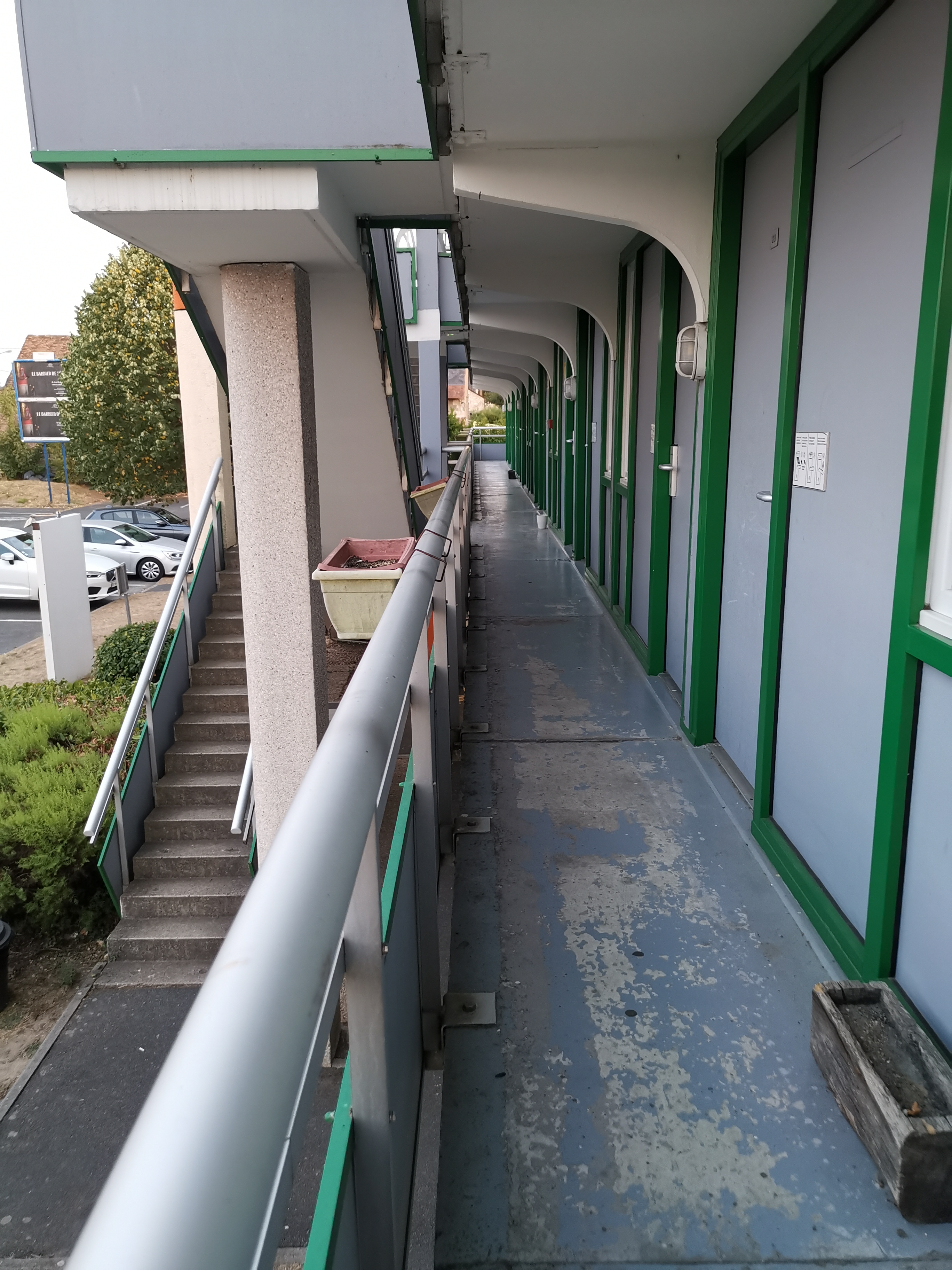 Cet hôtel me rappel ma jeunesse avec cette chaine d'hôtel pas chère connue pour la salle d'eau type cabine en plastique. Bien que très bien située proche de l'autoroute, d'une zone commerciale et de Châtellerault, google tentait de nous faire entrer par un accès qui n'existait pas (utilisez plutôt Waze lui il connait). Une fois sur le parking vue sur l'hôtel mais aussi sur un bâtiment annexe ouvert ou se trouve des vélos d'entrainement type salle de sport...me demandez pas le rapport entre un hôtel et des vélos je n'ai pas trouvé. Soit...arrivé devant l'entrée nous pouvons voir le panneau d'accueil (voir photo : chambres 1 personnes 4€ / 3 personnes 5 / petit-déjeuner 6,90€) .... déjà le p'tit dej' plus chère que la chambre c'est bizarre mais j'ai pas du tout payé çà !. Les extérieures ne sont pas très bien entretenus ou alors les propriétaires sont des écologistes pro araignées car il y a pas mal de toiles. L'accès à l'accueil était fermé ???? (un petit mot en notre absence veuillez composer le....06.... n'aurais pas été de trop) après avoir parcouru les différentes affiches nous avons trouvé un téléphone en cas d'urgence et nous avons décidé que c'était une urgence mdr. Le responsable au téléphone nous dit j'arrive quand ?, de ou ? ...pleins de questions surviennent alors. Le responsable arrive poli, courtois et nous voila rassuré nous avons notre chambre. Résumé : si ce n'est pas un 1er RDV romantique et que vous privilégiez le prix et l'emplacement géographique à l'esthétique cet hôtel est fait pour vous