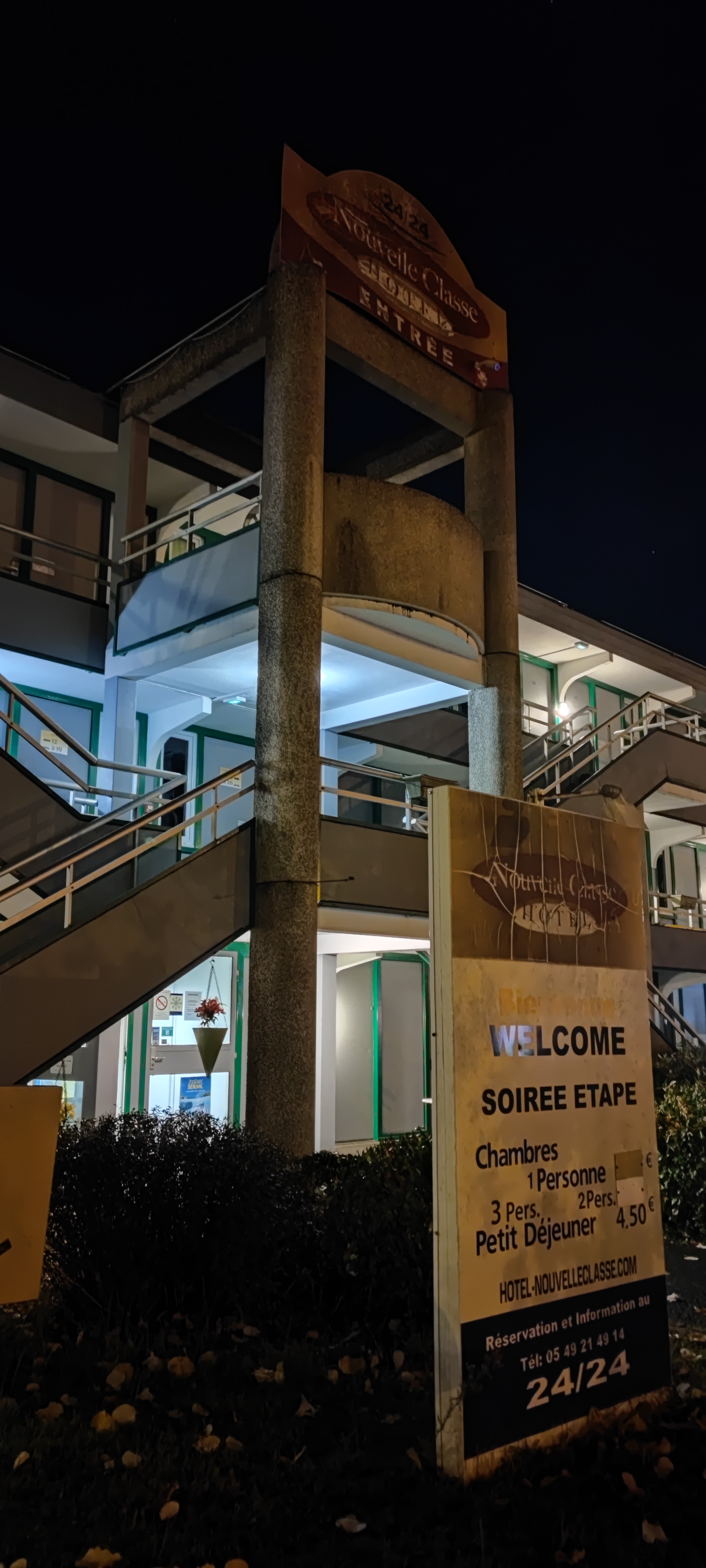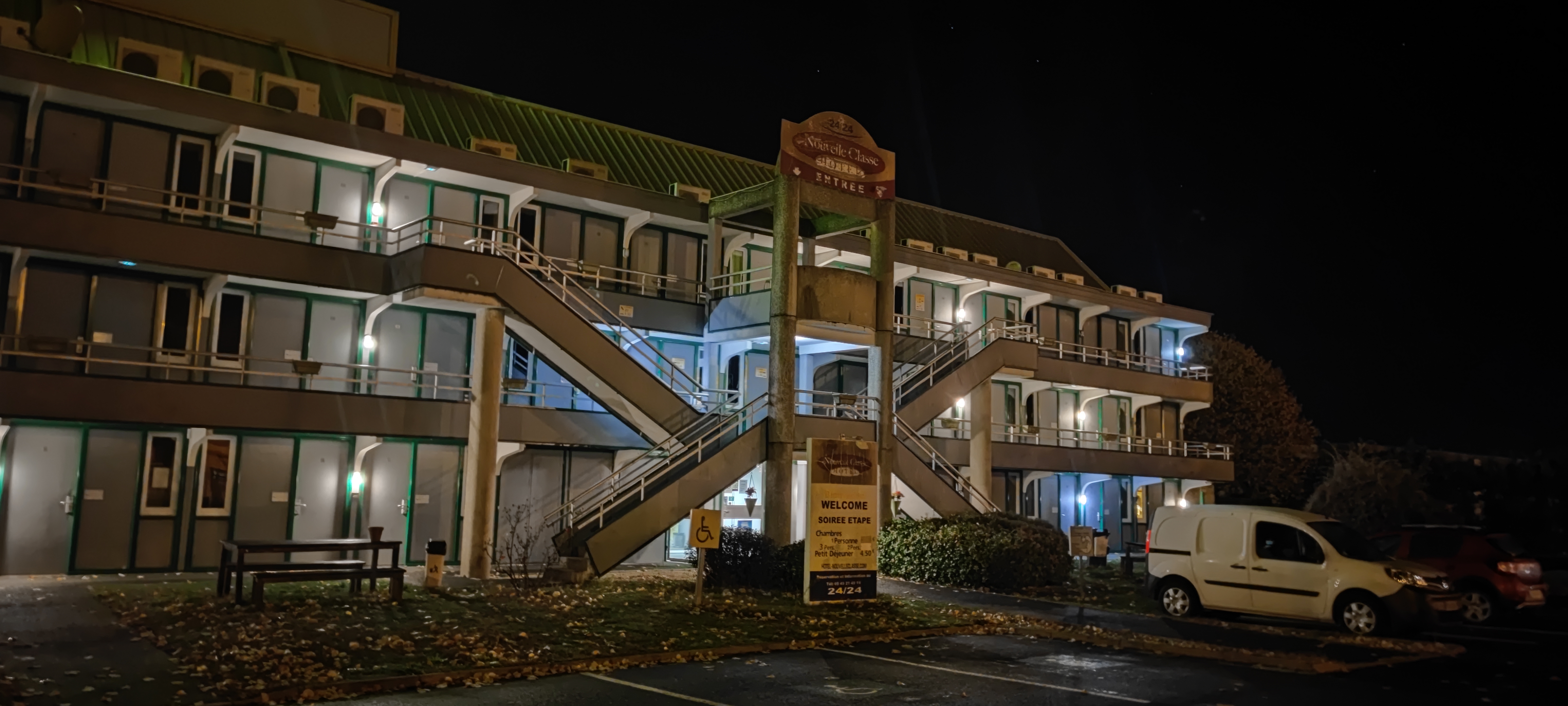 Je ne pensais pas qu’il existait encore des hôtels de la sorte en France. Je me suis cru dans un Motel du désert américain dans les années 70. A l’accueil il manque plus qu’un Hygiaphone La déco de la chambre date de la construction de l’hôtel donc au moins 40 ans. Le lit est aussi dure qu’une palette La salle de bain est équipée d’une douche est moins grande que celle d’une caravane et comme Il n’y a pas de bac à douche, la salle de bain devient une marre à canard. Et pour finir, le truc qui sert de chauffage fait un bruit pas possible et bien entendu il ne fait pas de chaud. Ah j’oublie le petit déjeuner avec seulement une cafetière, des morceaux de pain et de la confiture.