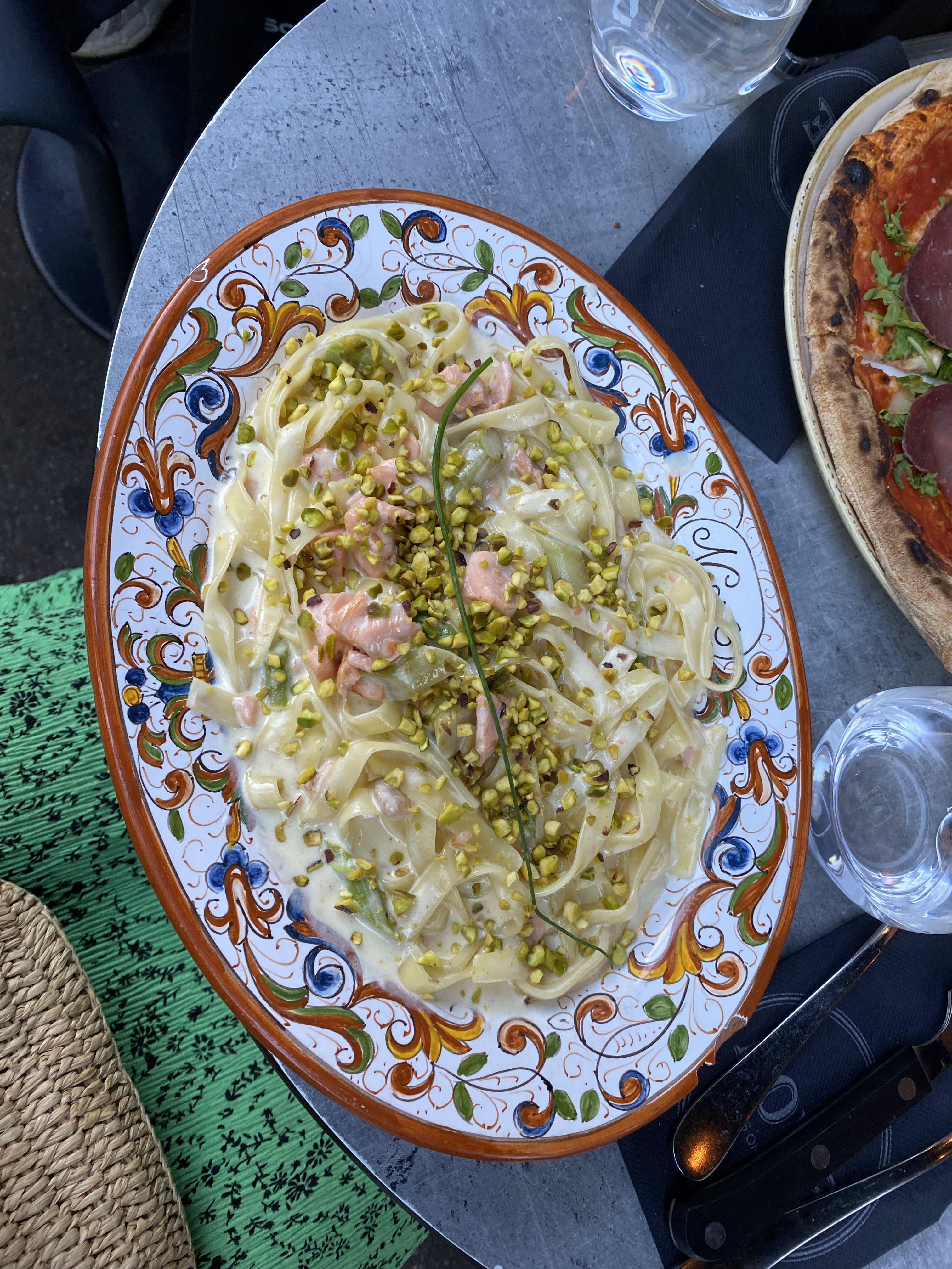Service sympathique et efficace, pizzas au feu de bois avec ingrédients de qualité. J'ai vu aussi passer des assiettes de pâtes qui faisaient envie et qu'il faudra que je teste. Le 50cl de vin à 17€ me paraît exagéré. Mais pour le reste, pas de regret.
