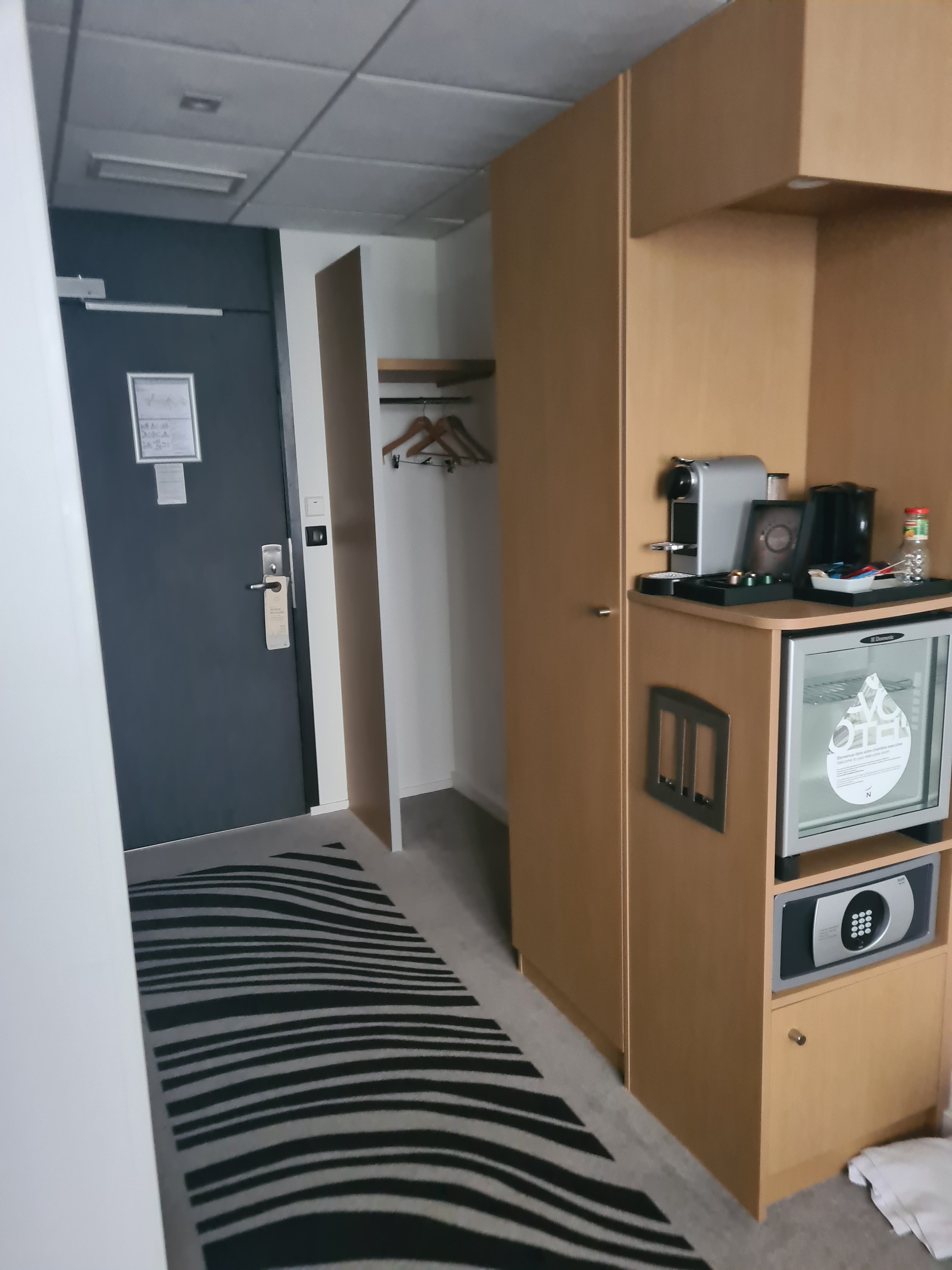 Pas satisfait de nos 2 nuits dans ce novotel. Le positif: emplacement et chambre très calme comme demandé lors de la réservation. Le négatif: la chambre exécutive est différente de la description du site : pas de bain à remous, une seule télévision qui se trouve donc très éloignée du lit et la télécommande qui donc a du mal à fonctionner, quasiment pas de séparation avec le coin canapé Alimentation en courant non protégée, moquette tachée , télévision bancale calée avec du bois, tarif de 2020 sur la porte bref on ressent un manque d'entretien général. Surprise au petit déjeuner, on doit maintenant mettre soi-même la table... tout se trouve dans la console comme indiqué par le personnel qui était pourtant en nombre suffisant ce jour-là. A quand les draps dans un roll à la sortie de l'ascenseur pour que le client fasse lui-même son lit?
