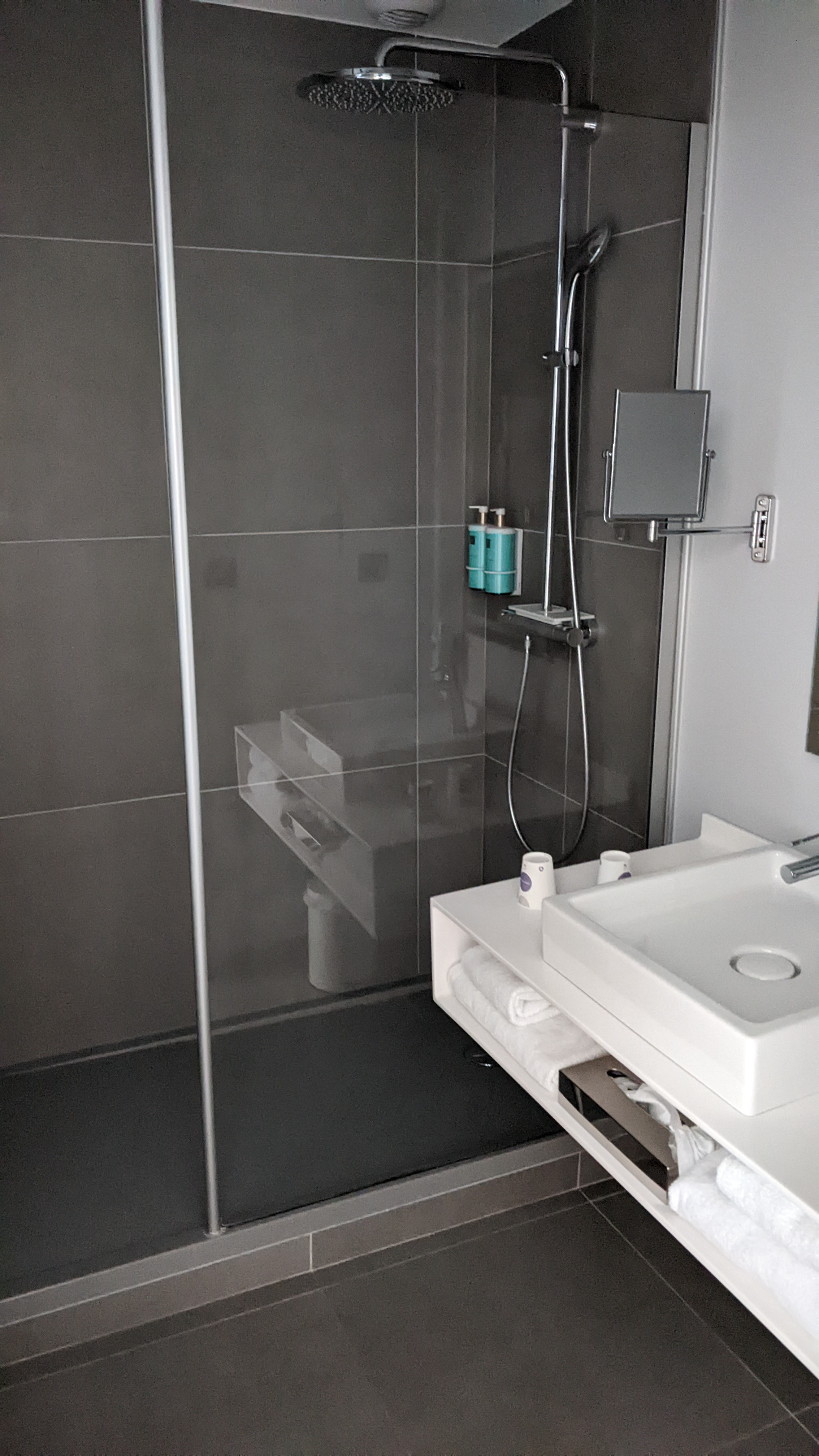 L'hôtel est bien situé à proximité du futuroscope. La chambre est spacieuse et calme. La salle de bains est équipée d'une douche à l'italienne pas du tout sécurisée voire dangereuse . Le revêtement de sol est très glissant et j'ai fait une chute en prenant ma douche. Ma tête a heurté la cloison et je me suis fait très mal avec une plaie ouverte au cuir chevelu. Je suis allé à l'accueil pour demander un désinfectant pour soigner la plaie. Ils ne m'ont rien proposé si ce n'est de prendre ma voiture pour aller à la pharmacie. Pas d'excuse ni de compassion.