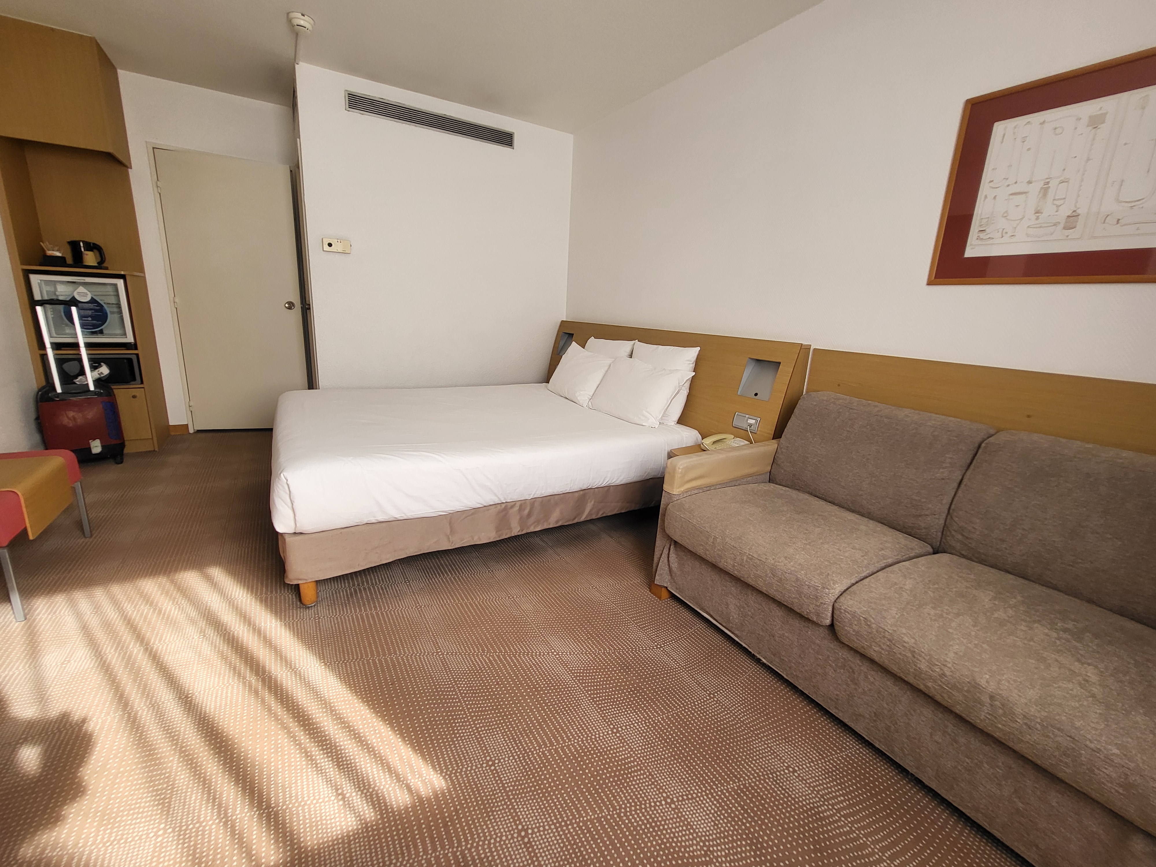 Belles promesses pour cet hotel. Le personnel est très accueillant et les équipements nombreux. Le hall est du standing des novotels, pas de surprise. Par contre arrivé à la chambre on déchante vite. On dirait que la chambre n’a pas bougé depuis 1990 et on se demande si on est au formule 1 ou au novotel. La moquette présente de nombreuses traces suspectes et on n’ose a peine marcher en chaussette. Ca sent le vécu dans toute la chambre et la literie ne fait pas rêver. On n’a même pas le droit à une brosse dans les toilettes pour le prix. Tout le budget rénovation est passé dans la télé, dommage… On nous annonce un petit déjeuner servi jusqu’à 11h, chouette c’est les vacances on va pouvoir dormir un peu. Arrivé à 10h15 dans le restaurant, le personnel commence à débarrasser dès 10h20… Bref autant prendre une nuit à l’ibis a côté pour moins cher. Nous ne passerons finalement qu’une nuit.