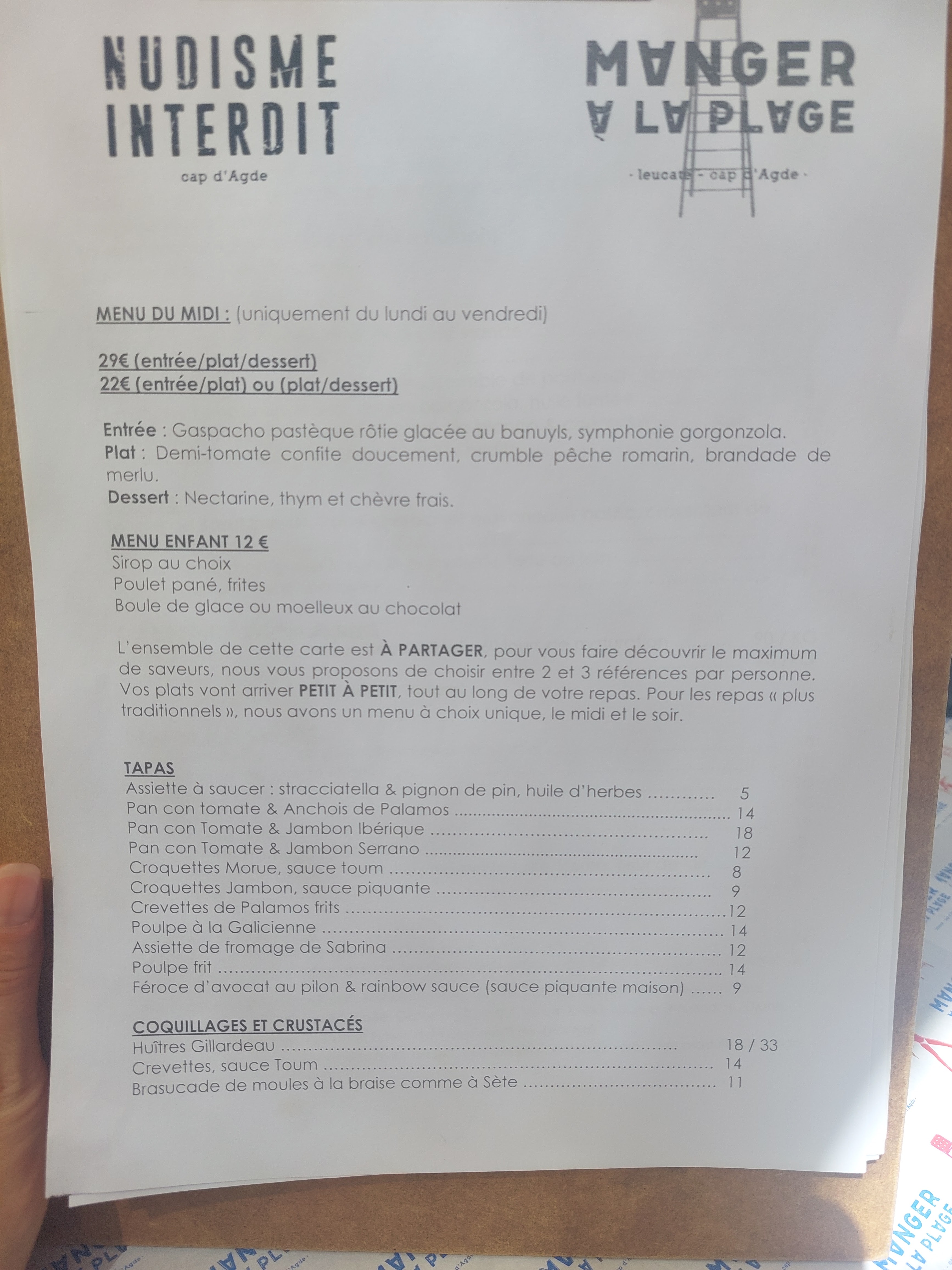 Accueil sympa c’est bien la seule chose correcte dans le nouveau restaurant *nudisme interdit* . Pas de serviette / nourriture moyenne / du sable dans les verres et j’en passe . La carte ne donne pas envie . Il y a de biens meilleurs restaurant au cap d’Agde .