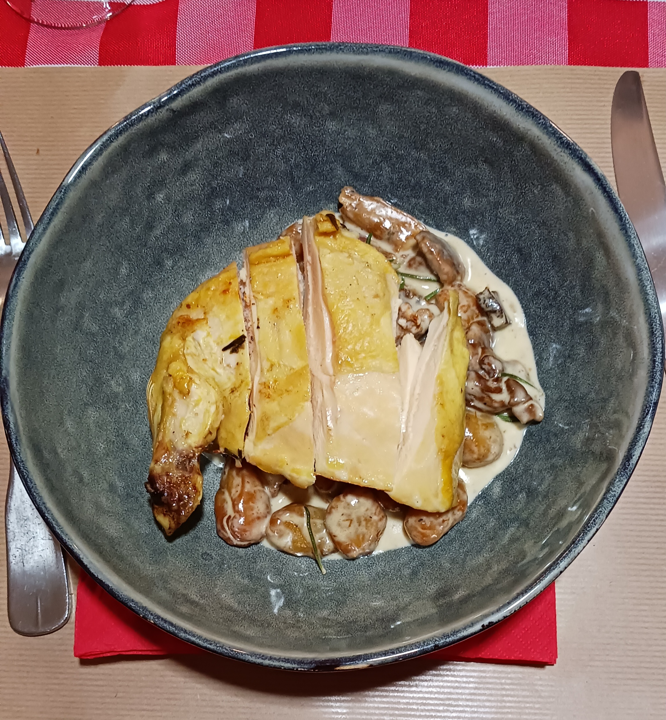 Serveuse peu aimable, suprême de poulet sûrement de la veille vu la sécheresse de la viande.