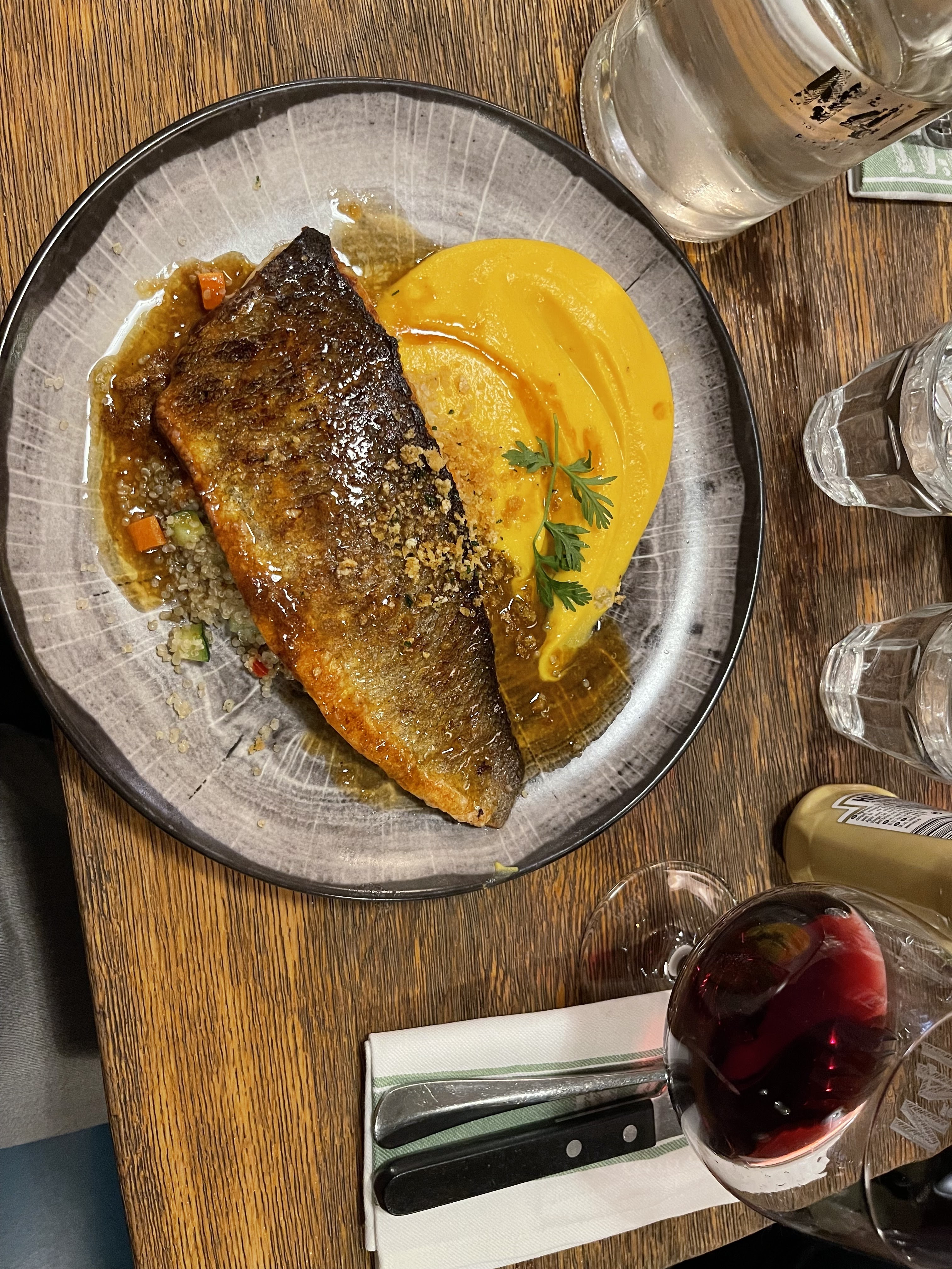 Je vends ma mère pour le filet de bar, purée de butternute !! Mention spéciale pour le serveur avec le tatouage à l intérieur en haut du bras.