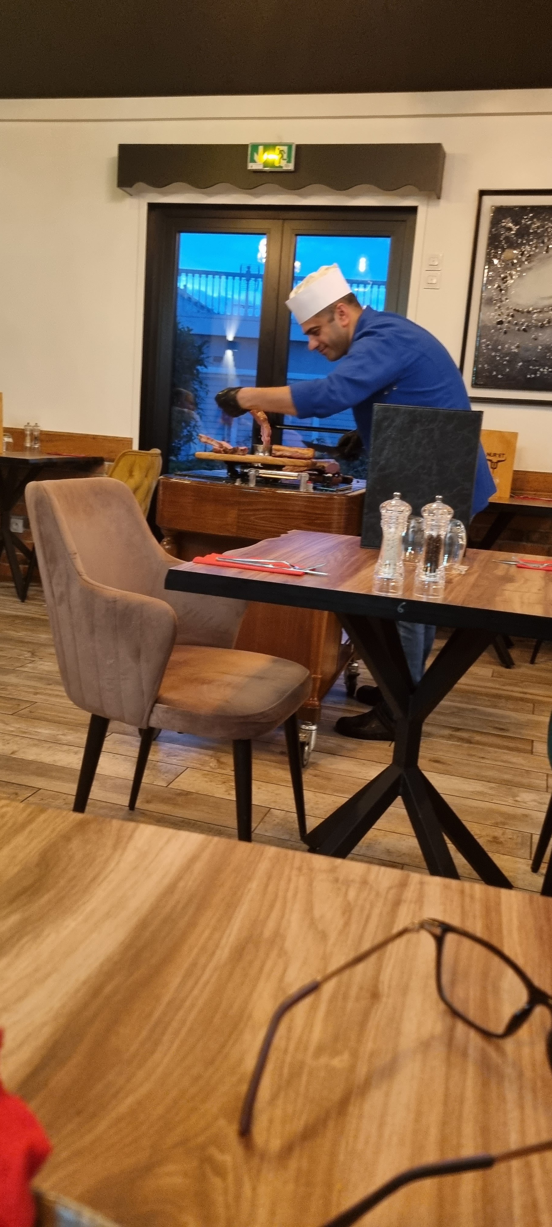 Agréable soirée 🙂 Bon accueil, l’équipe de serveurs est chaleureux.. Extérieur du bâtiment ne paye pas de mine, mais l’intérieur de l’établissement est extrêmement bien décoré, dès l’entrée vous allez être surpris par la décoration 👍🏻 En ce qui concerne les plats nous avons pris un tomahawk et un carré d’agneau, les cuissons sont très bien respectées et les viandes sont super tendres. Un choix d’accompagnements diversifiés notamment les frites maison aux épices ou la purée maison.. Les prix sont très très raisonnables pour la qualité des viandes et le show proposé par le cuistot 😜 Petit bémol sur l’organisation des serveurs qui reste à revoir, mis a part ça le reste est un sans fautes.