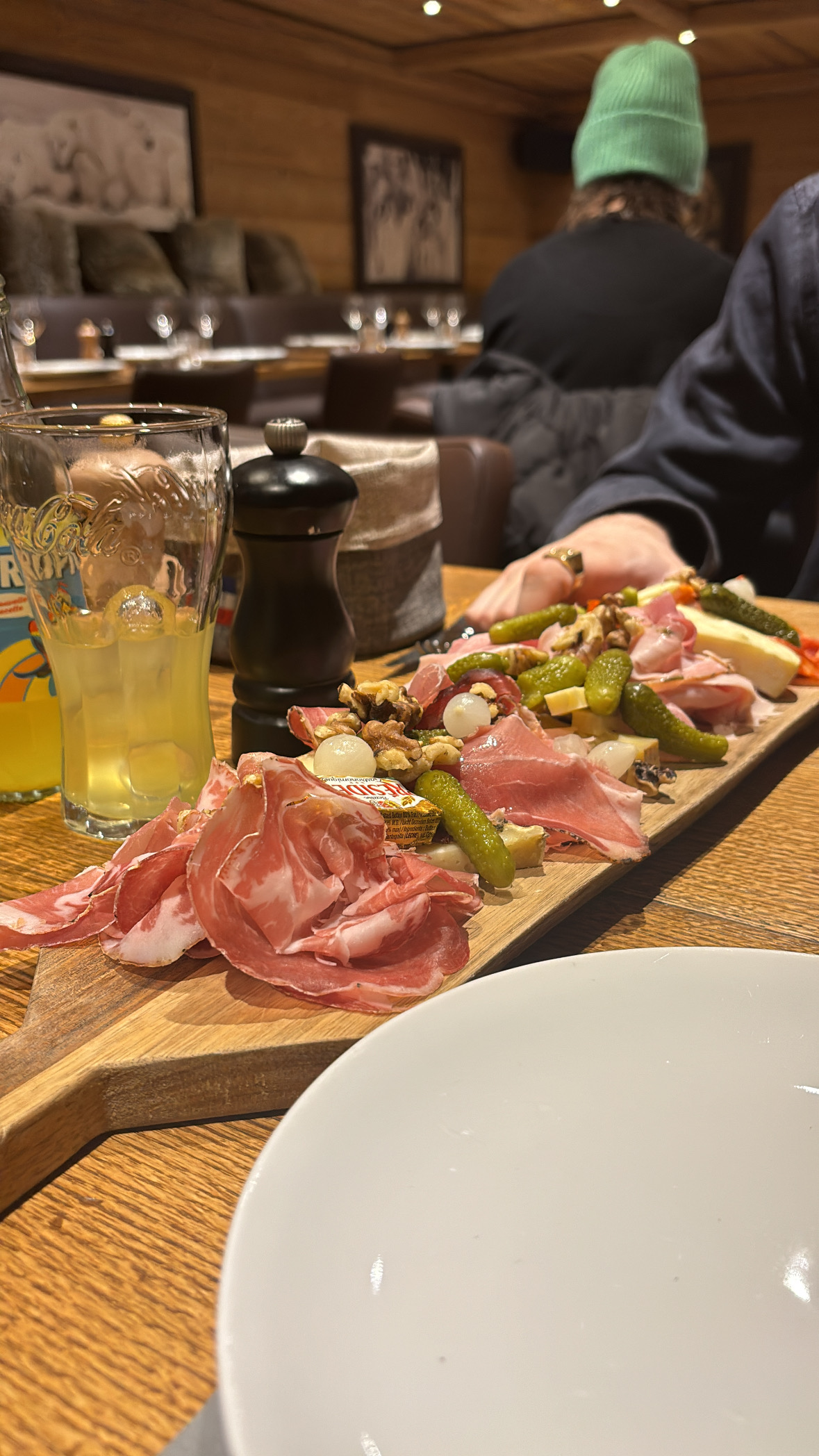 Cadre charmant pour prendre un verre après le ski et déjeuner. Nous avons eu de la fondue et de la charcuterie avec des bières et des aperol spritz. Les serveurs étaient sympas mais un peu difficiles à attirer l'attention. Note quatre étoiles car les portions étaient petites pour la charcuterie et assez chères. Belle ambiance.
