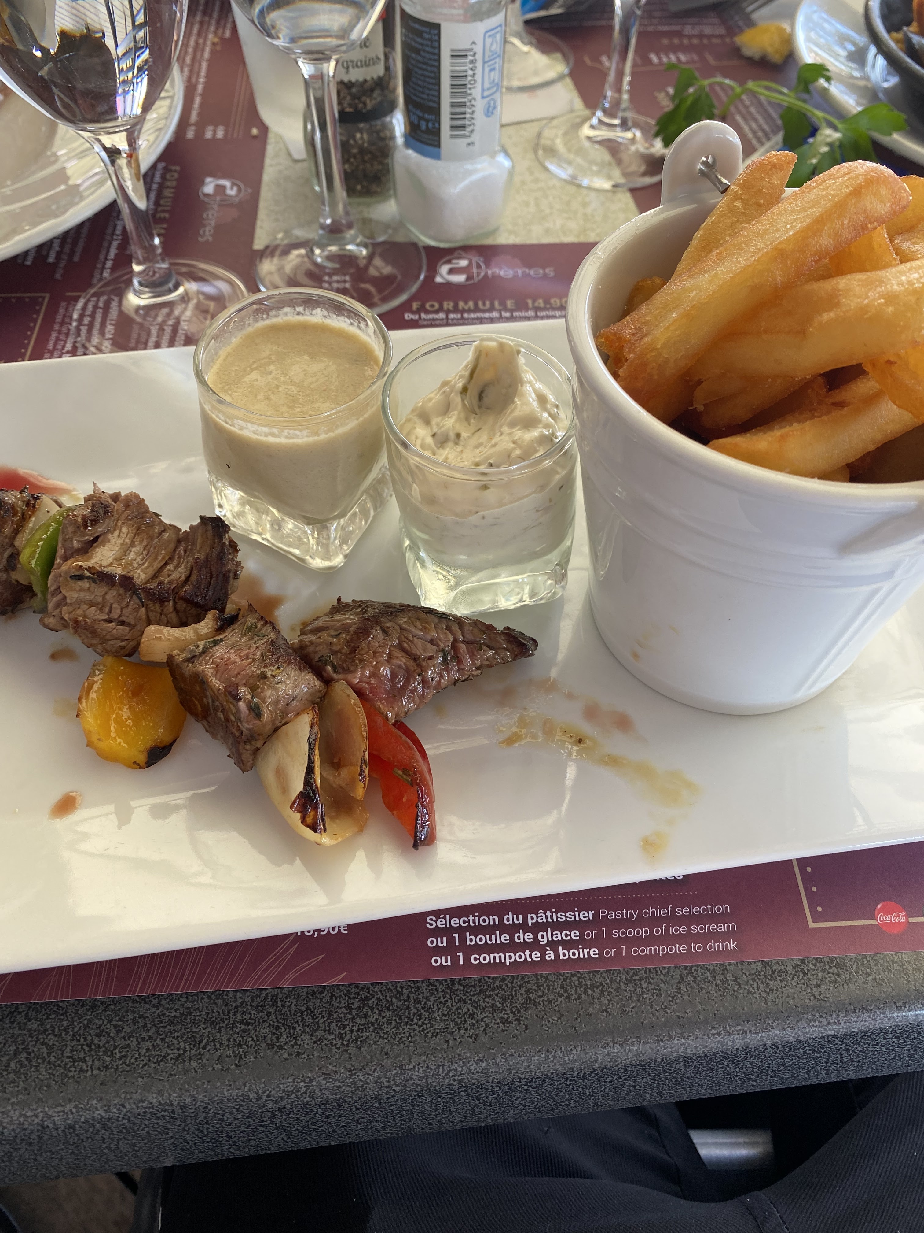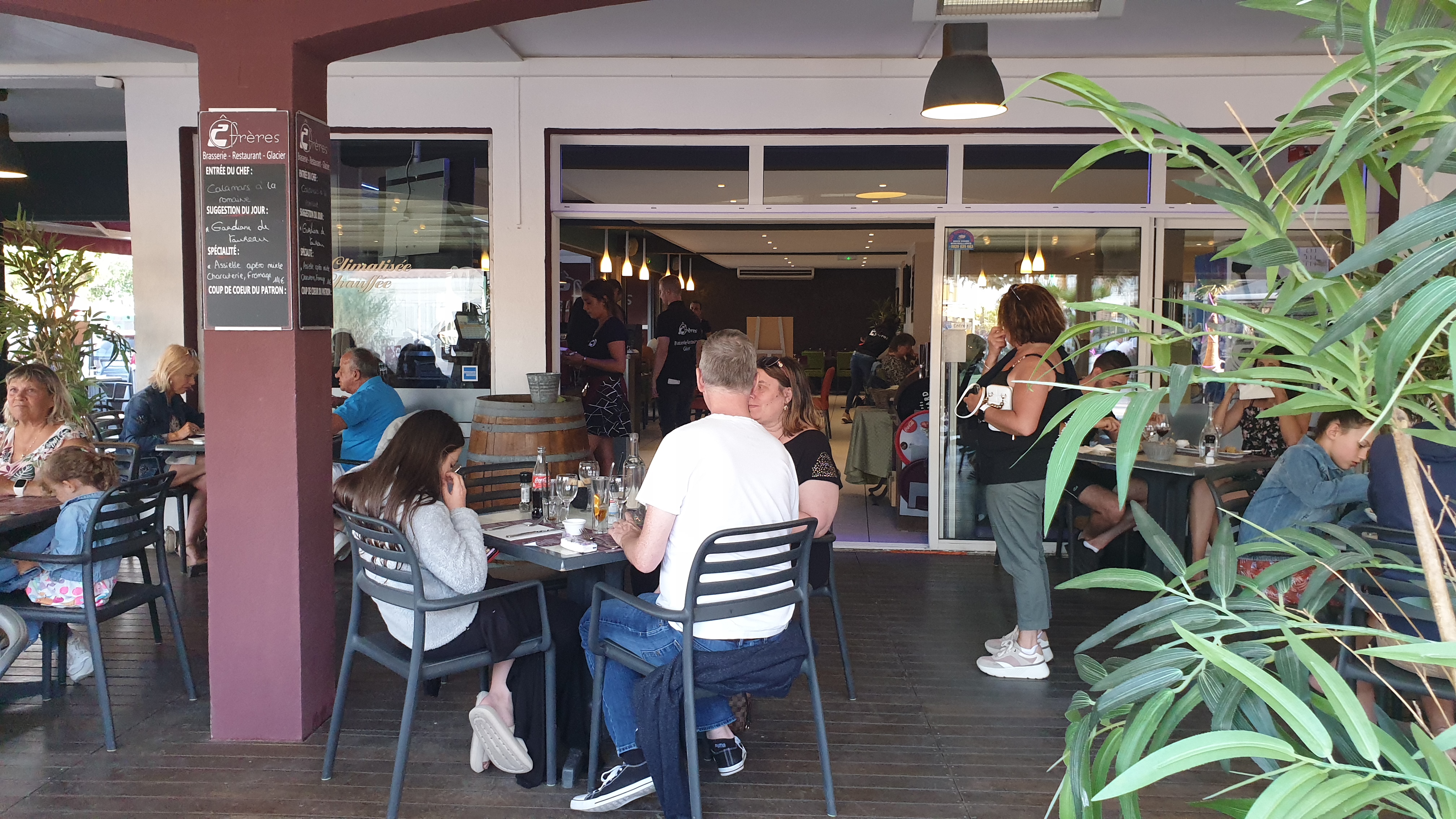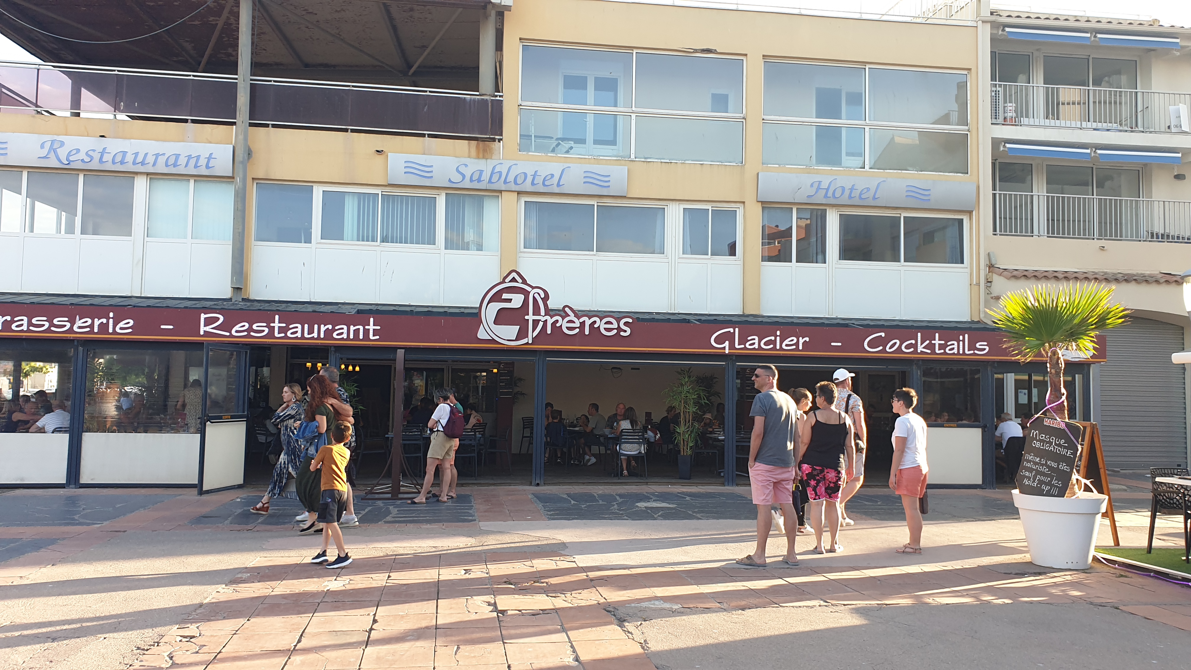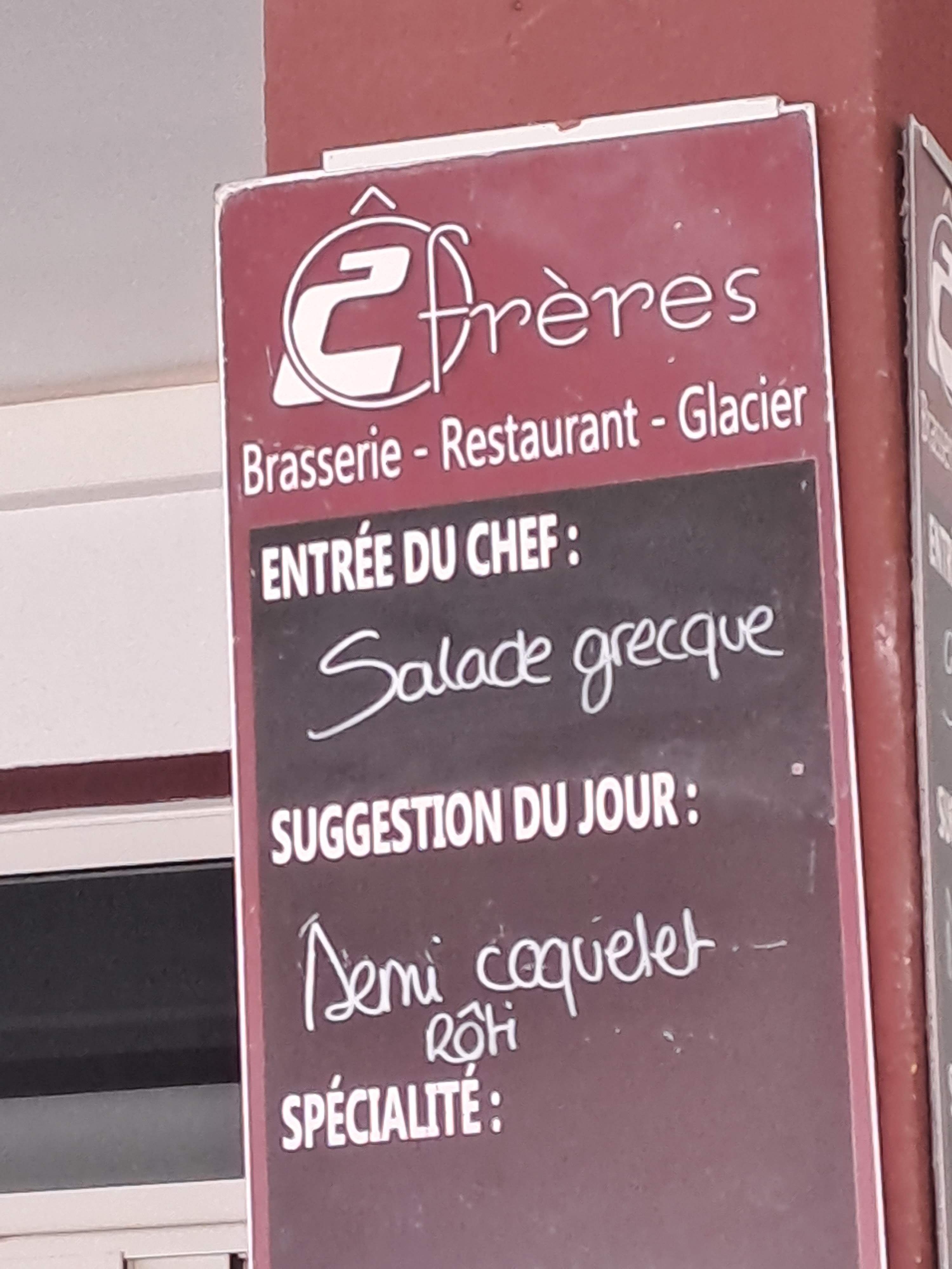Nous avons dîner au 2 frères ce dimanche, malheureusement pour un menu à 17,50€ nous avons été très déçus d’une part par l’accueil de la serveuse et la tenue professionnelle en ce qui concerne le service « HCR » hôtel café restaurant. PAËLLA.MAISON ?? Banale !! m’a t-elle répondu « oui la mise en place est faite le lundi matin », Clients comme nous, un dimanche, la paella peut être que cuite recuite !! Les toilettes sont propres, en revanche, avant un service il faut vérifier à ce qu’il y est papier, pousse mousse, essuie main, Dommage pour un dernier restaurant avant la fin des vacances Merci de votre compréhension, bon courage pour la période estivale !