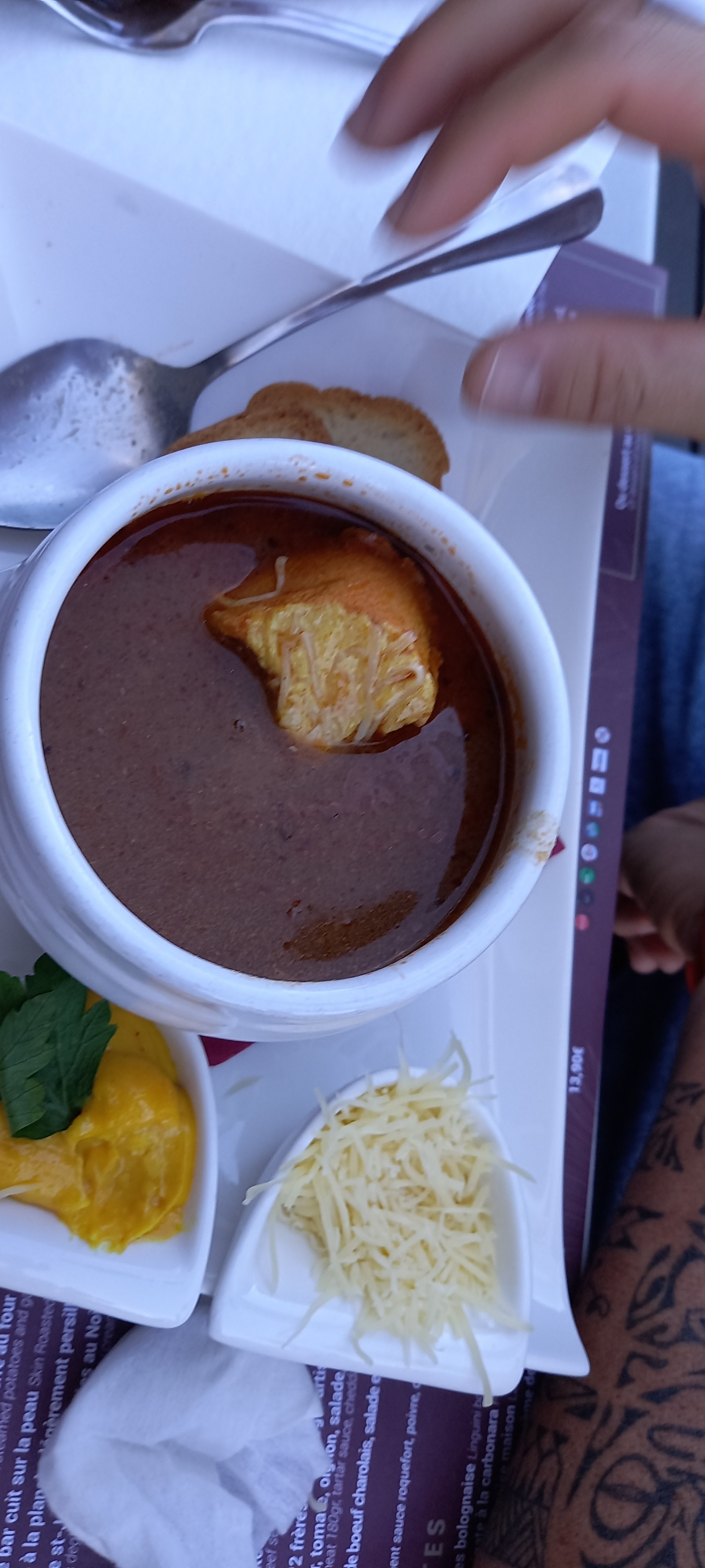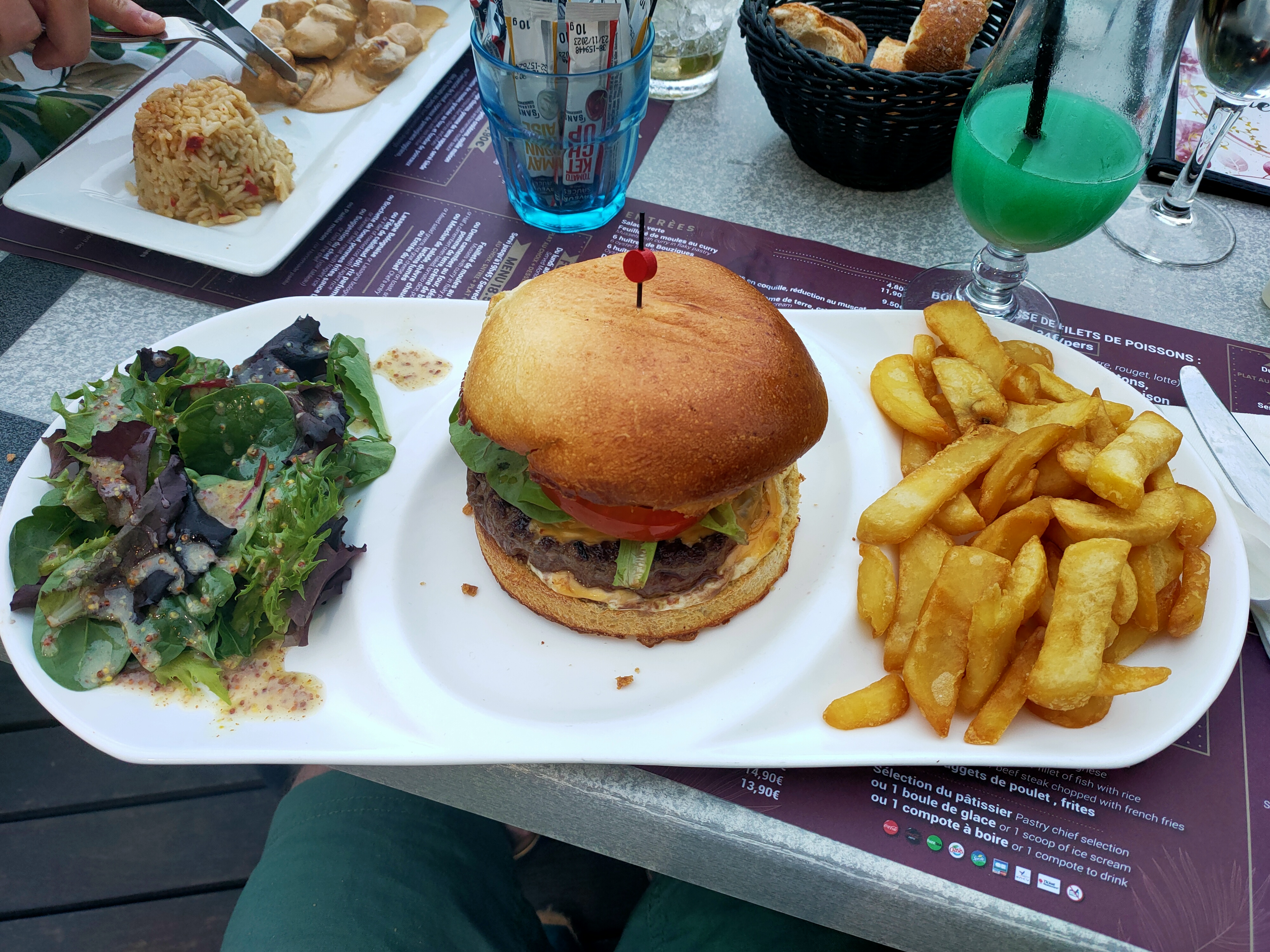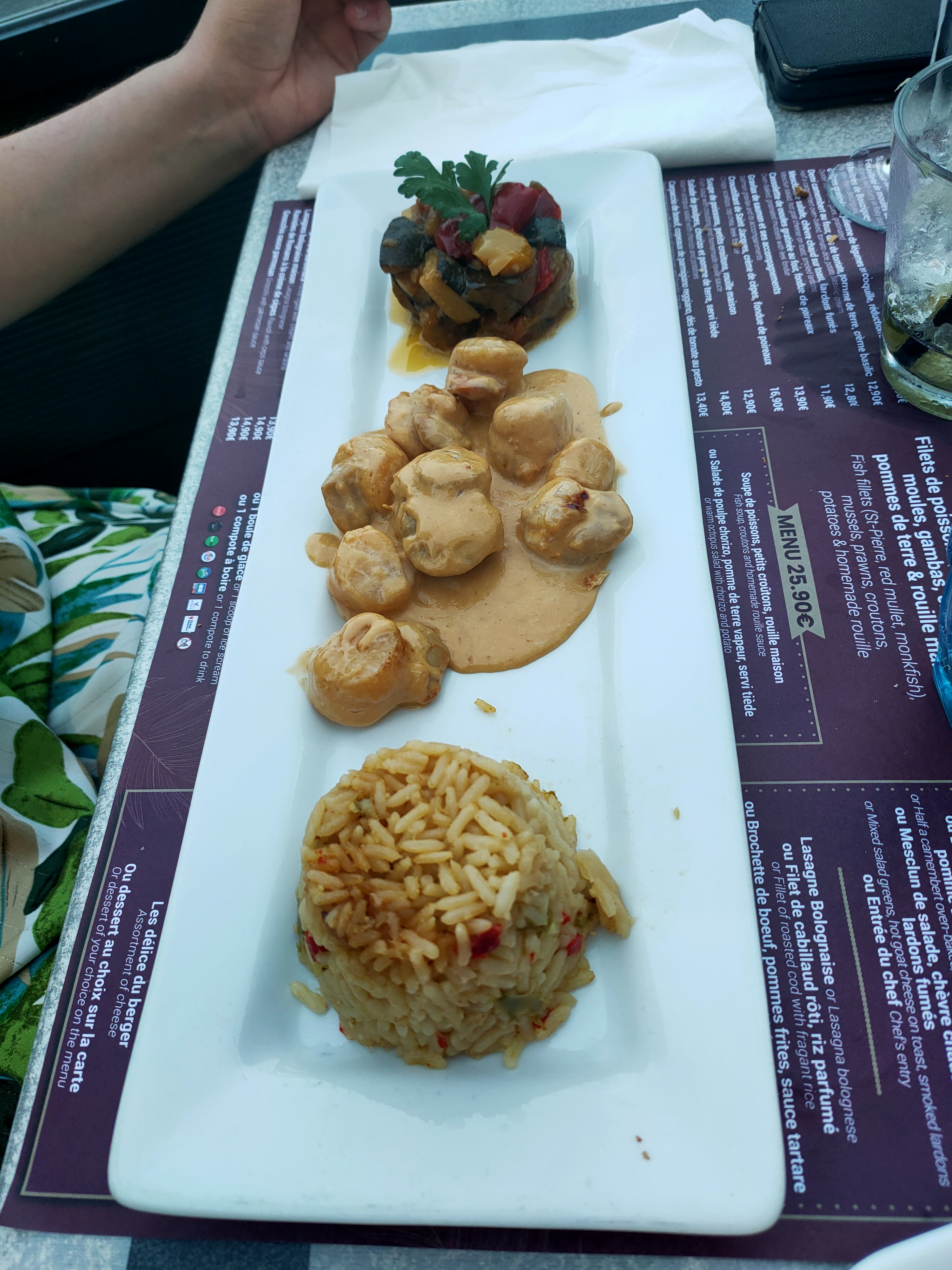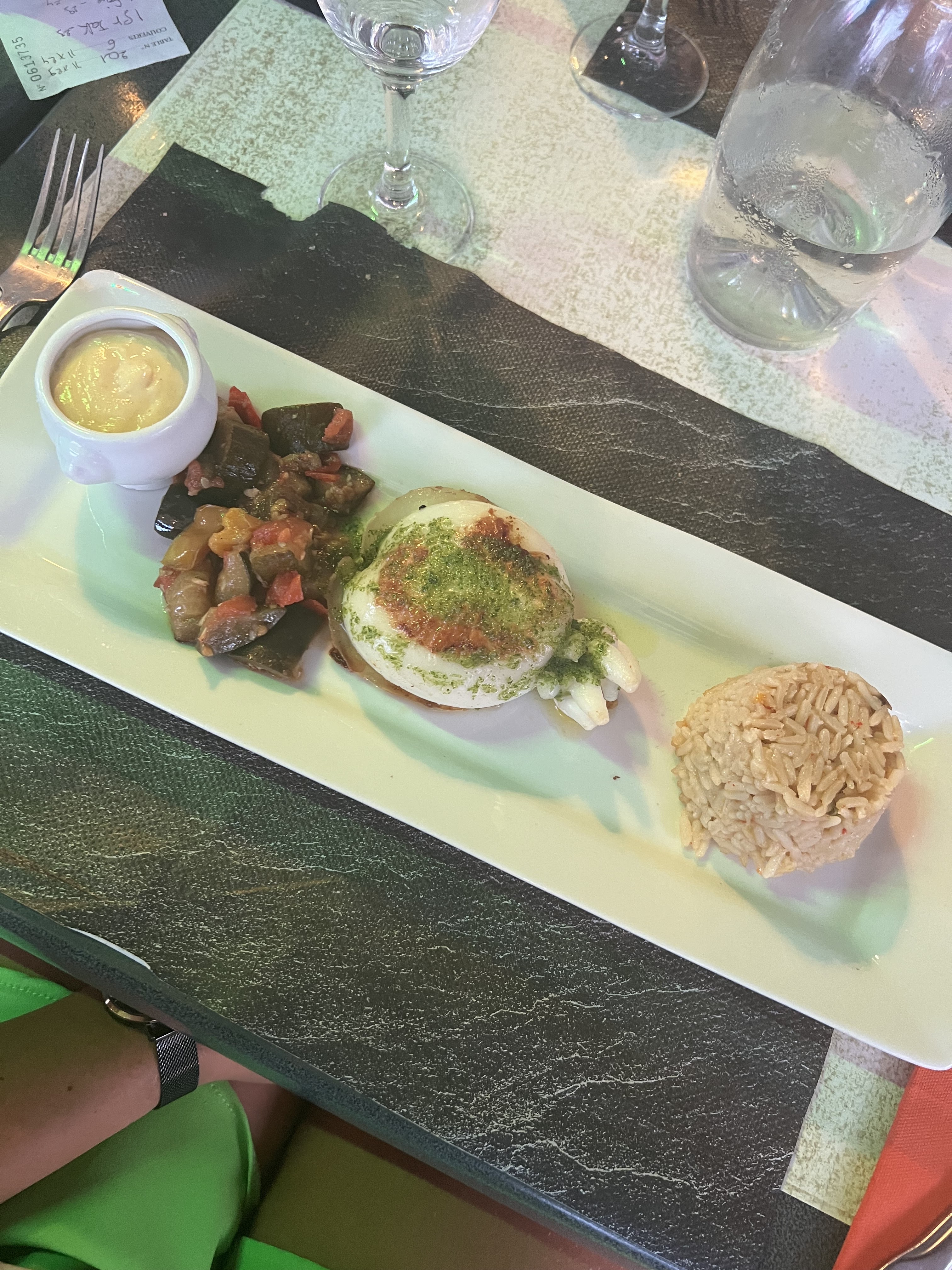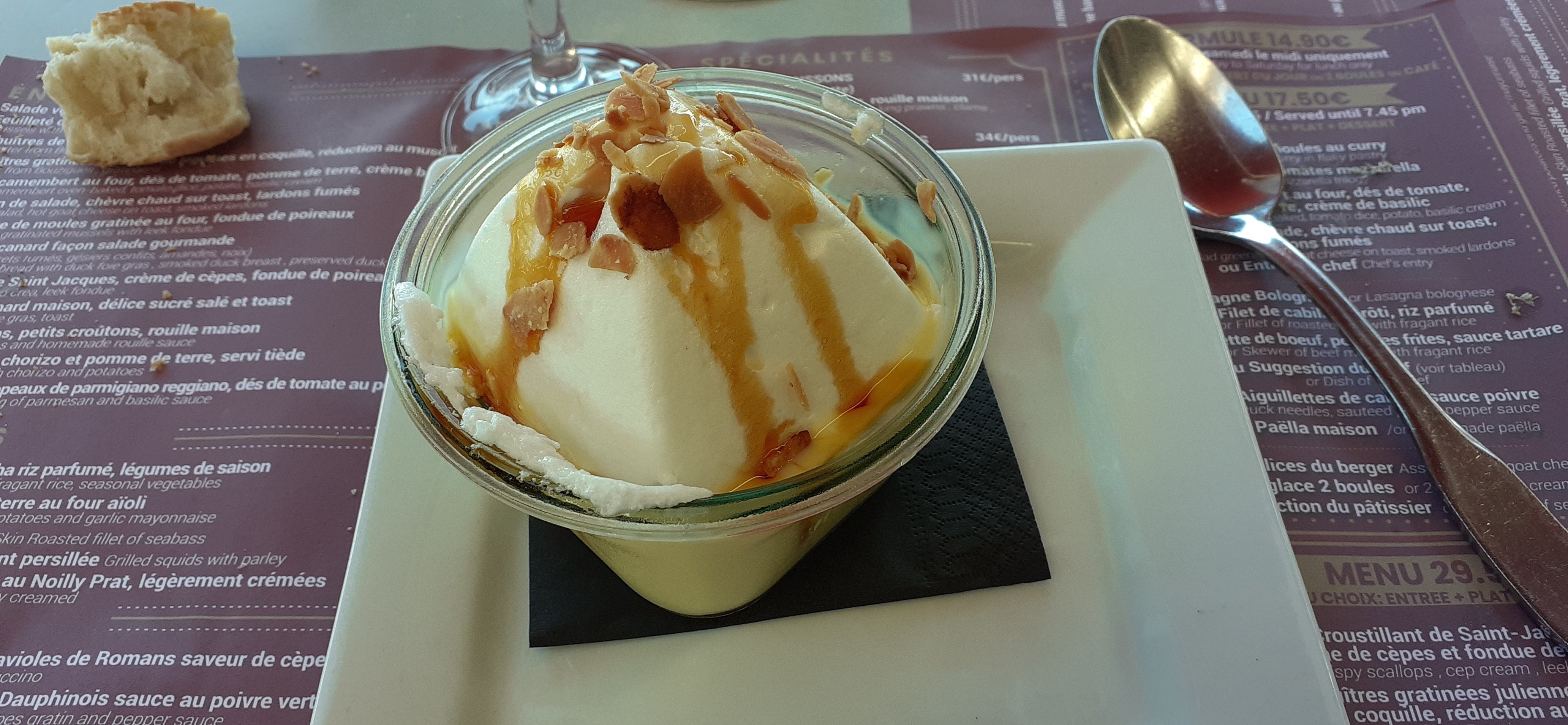 L'entrée et le plat principal très bon par contre très déçu par les desserts. Nous avons pris une île flottante et un tiramisu goût synthétique. Sinon serveurs très gentils